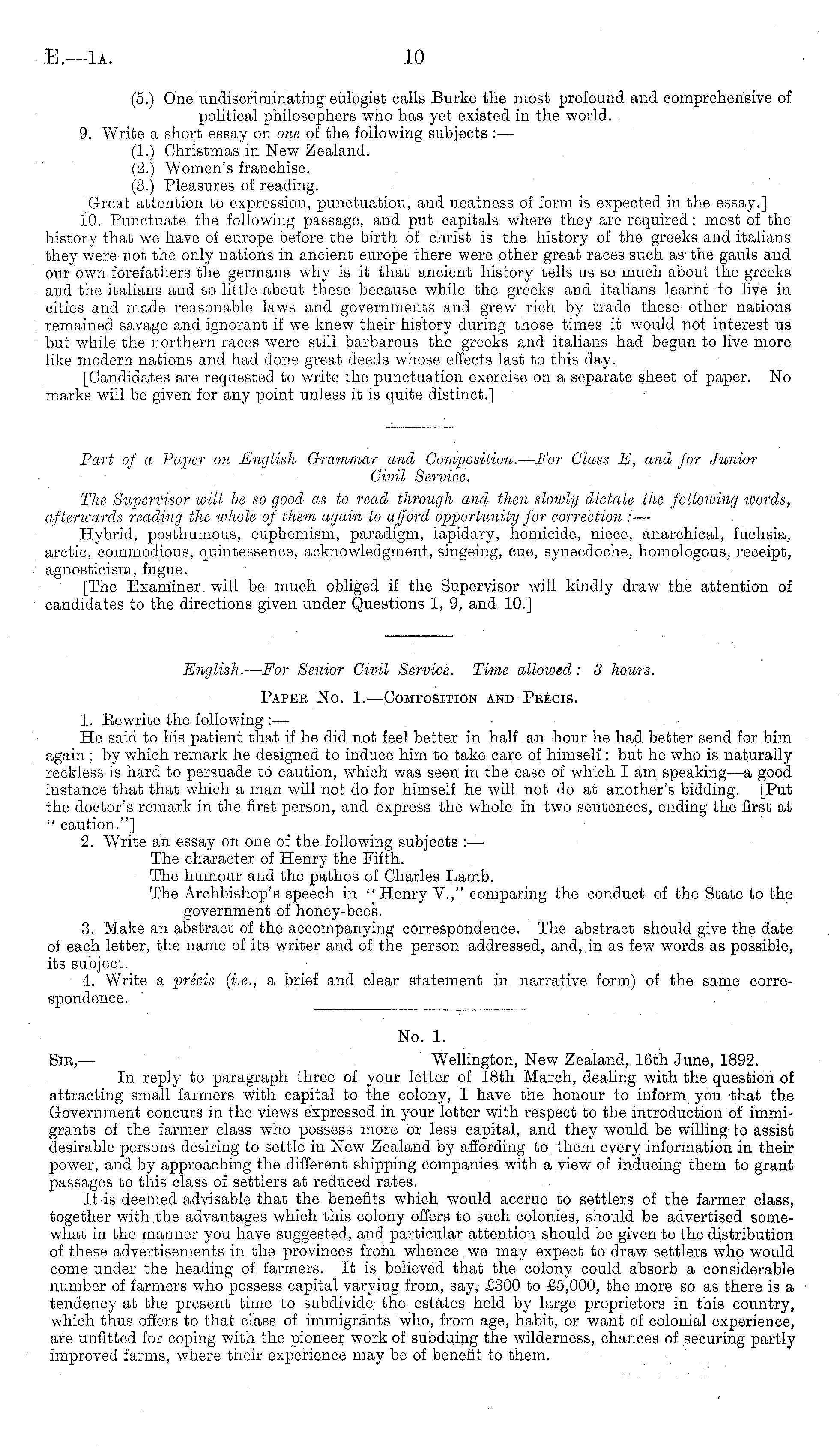 English. — For Senior Civil Service. Time alloioed : 3 hours. Papee No. I.—Composition and Precis. 1. Eewrite the following : — He said to his patient that if he did not feel better in half an hour he had better send for him again ; by which remark he designed to induce him to take care of himself: but he who is naturally reckless is hard to persuade to caution, which was seen in the case of which lam speaking —a good instance that that which a man will not do for himself he will not do at another's bidding. [Put the doctor's remark in the first person, and express the whole in two sentences, ending the first at " caution."] 2. Write an essay on one of the following subjects : — The character of Henry the Fifth. The humour and the pathos of Charles Lamb. The Archbishop's speech in "Henry V.," comparing the conduct of the State to the government of honey-bees. 3. Make an abstract of the accompanying correspondence. The abstract should give the date of each letter, the name of its writer and of the person addressed, and, in as few words as possible, its subject. 4. Write a precis (i.e., a brief and clear statement in narrative form) of the same correspondence.