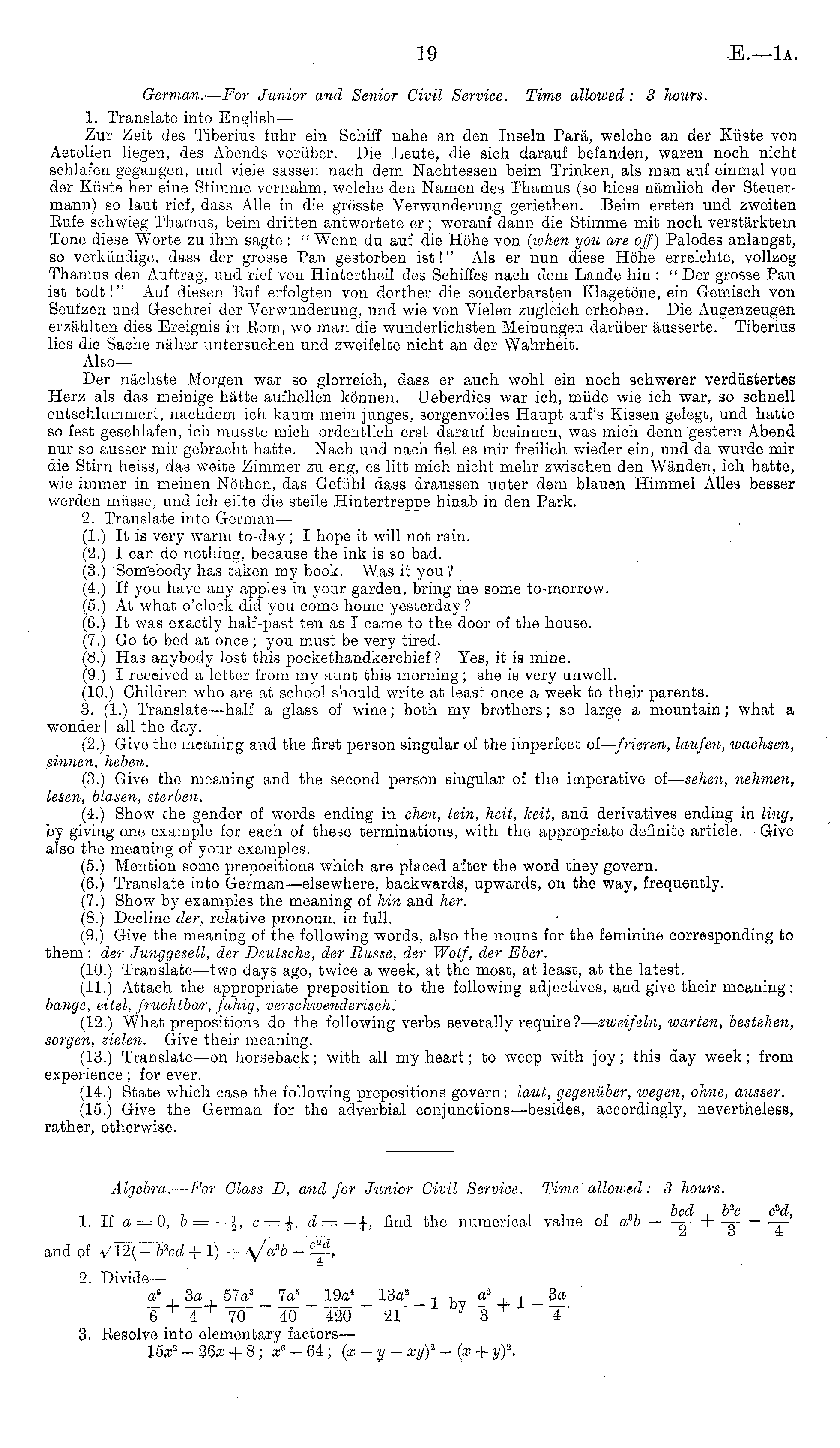 German. — For Junior and Senior Civil Service. Time allowed : 3 hours. 1. Translate into English— Zur Zeit dcs Tiberius fuhr em Schiff nahe an den Inseln Parii, welche an der Kiiste yon Aetolien liegen, dcs Abends voriiber. Die Leute, die sich darauf befanden, waren noch nicht schlafen gegangen, und viele sassen nach dem Nachtessen beim Trinken, als man auf einmal yon der Kiiste her cine Stimme vernahm, welche den Namen dcs Thamus (so hiess namlich der Steuermann) so laut rief, dass Alle in die grosste Verwunderung geriethen. Beim ersten und zweiten Eufe schwieg Thamus, beim dritten antwortete er; worauf dann die Stimme mit noch verstiirktem Tone diese Worte zu ihm sagte : " Wenn dv auf die Hohe yon (when you are off) Palodes anlangst, so verktindige, dass der grosse Pan gestorben ist!" Als er nun diese Hohe erreichte, vollzog Thamus den Auftrag, und rief yon Hintertheil dcs Schiffes nach dem Lande hin : " Der grosse Pan ist todt!" Auf diesen Euf erfolgten yon dorther die sonderbarsten Klagetone, em Gemisch yon Seufzen und Geschrei der Verwunderung, und wie yon Vielen zugleich erhoben. Die Augenzeugen erzahlten dies Ereignis in Bom, wo man die wunderlichsten Meinungen dariiber iiusserte, Tiberius lies die Sache naher untersuchen und zweifelte nicht an der Wahrheit. Also— Der nachste Morgen war so glorreich, dass er auch wohl em noch schwerer verdiistertes Herz als das meinige hiitte aufhellen konnen. Ueberdies war ich, mtide wie ich war, so schnell entschlummert, nachdem ich kaum mem junges, sorgenvolles Haupt auf's Kissen gelegt, und hatte so fest geschlafen, ich musste mich ordentlich erst darauf besinnen, was mich derm gestern Abend nur so ausser mir gebracht hatte. Nach und nach fiel es mir freilich wieder em, und da wurde mir die Stirn heiss, das weite Zimmer zu eng, es litt mich nicht mehr zwischen den Wiinden, ich hatte, wie immer in meinen Nofchen, das Gefiihl dass draussen unter dem blauen Himmel Alles besser werden miisse, und ich eilte die steile Hintertreppe hinab in den Park. 2. Translate into German— (1.) It is very warm to-day; I hope it will not rain. (2.) I can do nothing, because the ink is so bad. (3.) 'Somebody has taken my book. Was it you? (4.) If you have any apples in your garden, bring me some to-morrow. (5.) At what o'clock did you come home yesterday? (6.) It was exactly half-past ten as I came to the door of the house. (7.) Go to bed at once; you must be very tired. (8.) Has anybody lost this pockethandkerchief ? Yes, it is mine. (9.) I received a letter from my aunt this morning; she is very unwell. (10.) Children who are at school should write at least once a week to their parents. 3. (1.) Translate —half a glass of wine; both my brothers; so largo a mountain; what a wonder! all the day. (2.) Give the meaning and the first person singular of the imperfect of— frieren, laufen, wachsen, sinnen, heben. (3.) Give the meaning and the second person singular of the imperative of— sehen, nehmen, lesen, blasen, sterben. (4.) Show the gender of words ending in chen, lein, heit, keit, and derivatives ending in ling, by giving one example for each of these terminations, with the appropriate definite article. Give also the meaning of your examples. (5.) Mention some prepositions which are placed after the word they govern. (6.) Translate into German—elsewhere, backwards, upwards, on the way, frequently. (7.) Show by examples the meaning of hin and her. (8.) Decline der, relative pronoun, in full. (9.) Give the meaning of the following words, also the nouns for the feminine corresponding to them : der Junggesell, der Deutsche, der Busse, der Wolf, der Eber. (10.) Translate—two days ago, twice a week, at the most, at least, at the latest. (11.) Attach the appropriate preposition to the following adjectives, and give their meaning: bange, eitel, fruchtbar, fahig, verschwenderisch. (12.) What prepositions do the following verbs severally require?— zweifeln, war ten, bestehen, sorgen, zielen. Give their meaning. (13.) Translate —on horseback; with all my heart; to weep with joy; this day week; from experience ; for ever. (14.) State which case the following prepositions govern: laut, gegenilber, wegen, ohne, ausser. (15.) Give the German for the adverbial conjunctions—besides, accordingly, nevertheless, rather, otherwise.