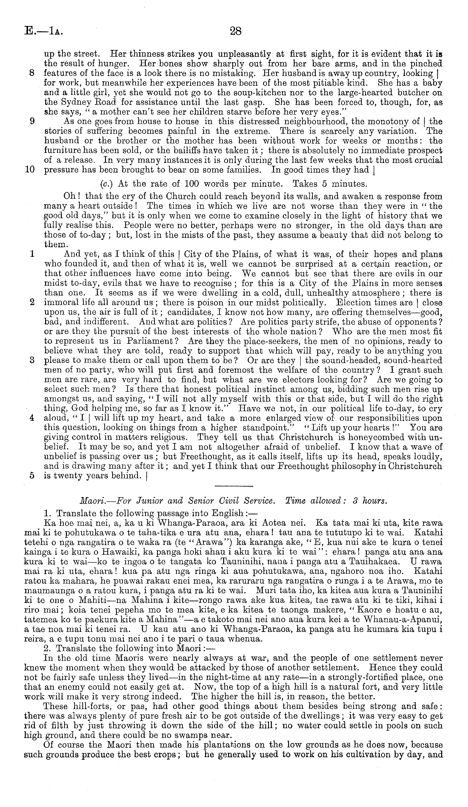 Maori. — For Junior and Senior Civil Service. Time allowed: 3 hours. 1. Translate the following passage into English: — Ka hoe mai nei, a, ka uki Whanga-Paraoa, ara ki Aotea nei. Ka tata mai ki uta, kite rawa mai kite pohutukawa ote taha-tika c ura atu ana, ehara ! tau ana te tututupo kite wai. Katahi tetehi o nga rangatira o te waka ra (te " Arawa") ka karanga ake, "E, kua nui ake te kura o tenei kainga i te kura o Hawaiki, ka panga hoki ahau i aku kura kite wai " : ehara ! panga atu ana ana kura kite wai—ko te ingoa ote tangata ko Tauninihi, nana i panga atu a Tauihakaea. U rawa mai ra ki uta, ehara! kua pa atu nga ringa ki aua pohutukawa, ana, ngahoro noa iho. Katahi ratou ka mahara, he puawai rakau enei mea, ka raruraru nga rangatira o runga i a te Arawa, mo te maumaunga o a ratou kura, i panga atu ra kite wai. Muri tata iho, ka kitea aua kura a Tauninihi kite one o Mahiti—na Mahina i kite—rongo rawa ake kua kitea, tae rawa atu kite tiki, kihai i riro mai; koia tenei pepeha mo te mea kite, eka kitea te taonga makere, " Kaore c hoatu c au, tatemea ko te paekura kite a Mahina"—a c takoto mai nei ano aua kura kei ate Whanau-a-Apanui, a tae noa mai ki tenei ra. U kau atu ano ki Whanga-Paraoa, ka panga atu he kumara kia tupu i reira, a c tupu tonu mai nei ano i te pari o taua whenua. 2. Translate the following into Maori: — In the old time Maoris were nearly always at war, and the people of one settlement never knew the moment when they would be attacked by those of another settlement. Hence they could not be fairly safe unless they lived —in the night-time at any rate —in a strongly-fortified place, one that an enemy could not easily get at. Now, the top of a high hill is a natural fort, and very little work will make it very strong indeed. The higher the hill is, in reason, the better. These hill-forts, or pas, had other good things about them besides being strong and safe: there was always plenty of pure fresh air to be got outside of the dwellings; it was very easy to get rid of filth by just throwing it down the side of the hill; no water could settle in pools on such high ground, and there could be no swamps near. Of course the Maori then made his plantations on the low grounds as he does now, because such grounds produce the best crops; but he generally used to work on his cultivation by day, and