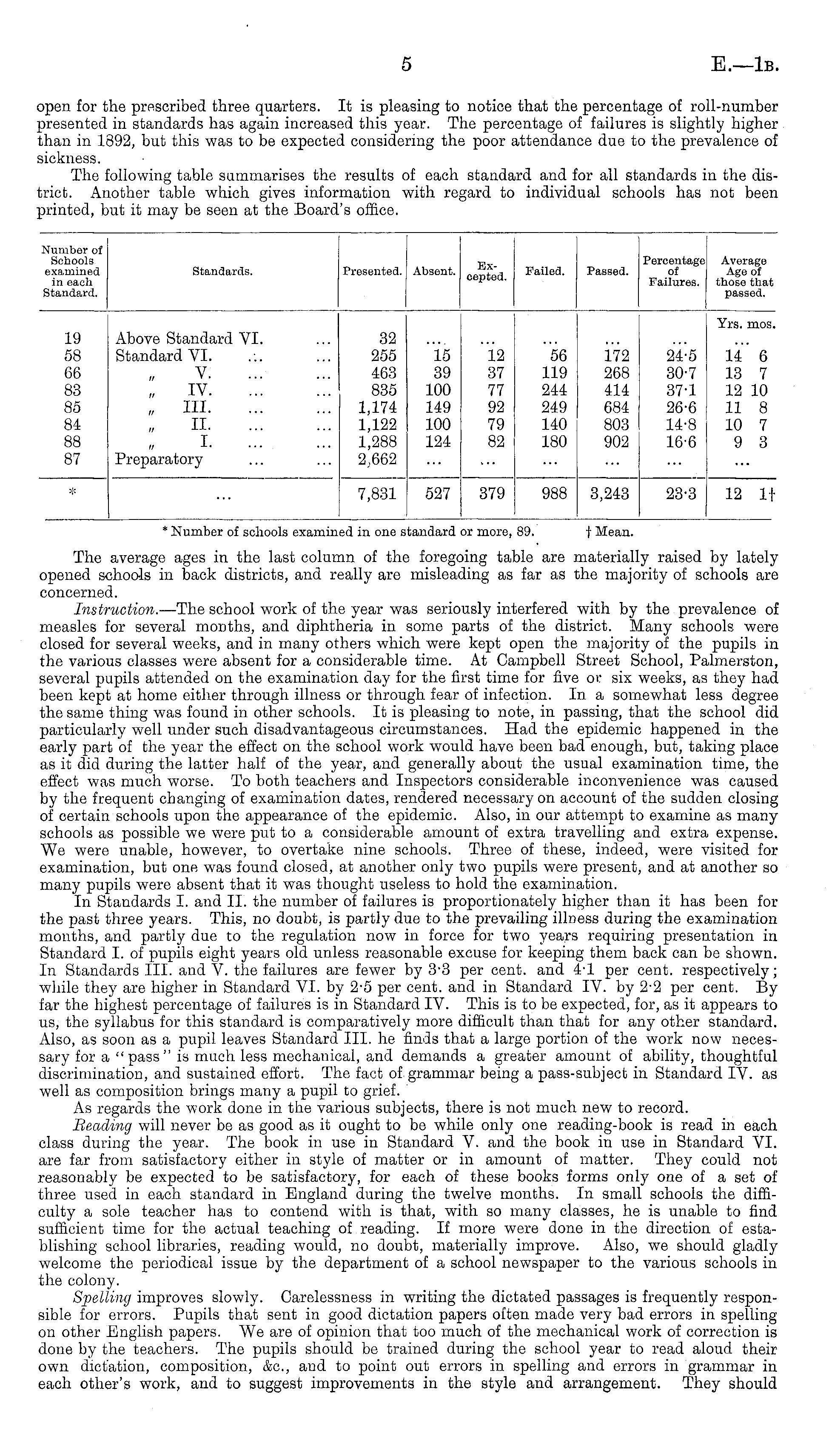 open for the prescribed three quarters. It is pleasing to notice that the percentage of roll-number presented in standards has again increased this year. The percentage of failures is slightly higher than in 1892, but this was to be expected considering the poor attendance due to the prevalence of sickness. The following table summarises the results of each standard and for all standards in the district. Another table which gives information with regard to individual schools has not been printed, but it may be seen at the Board's office.