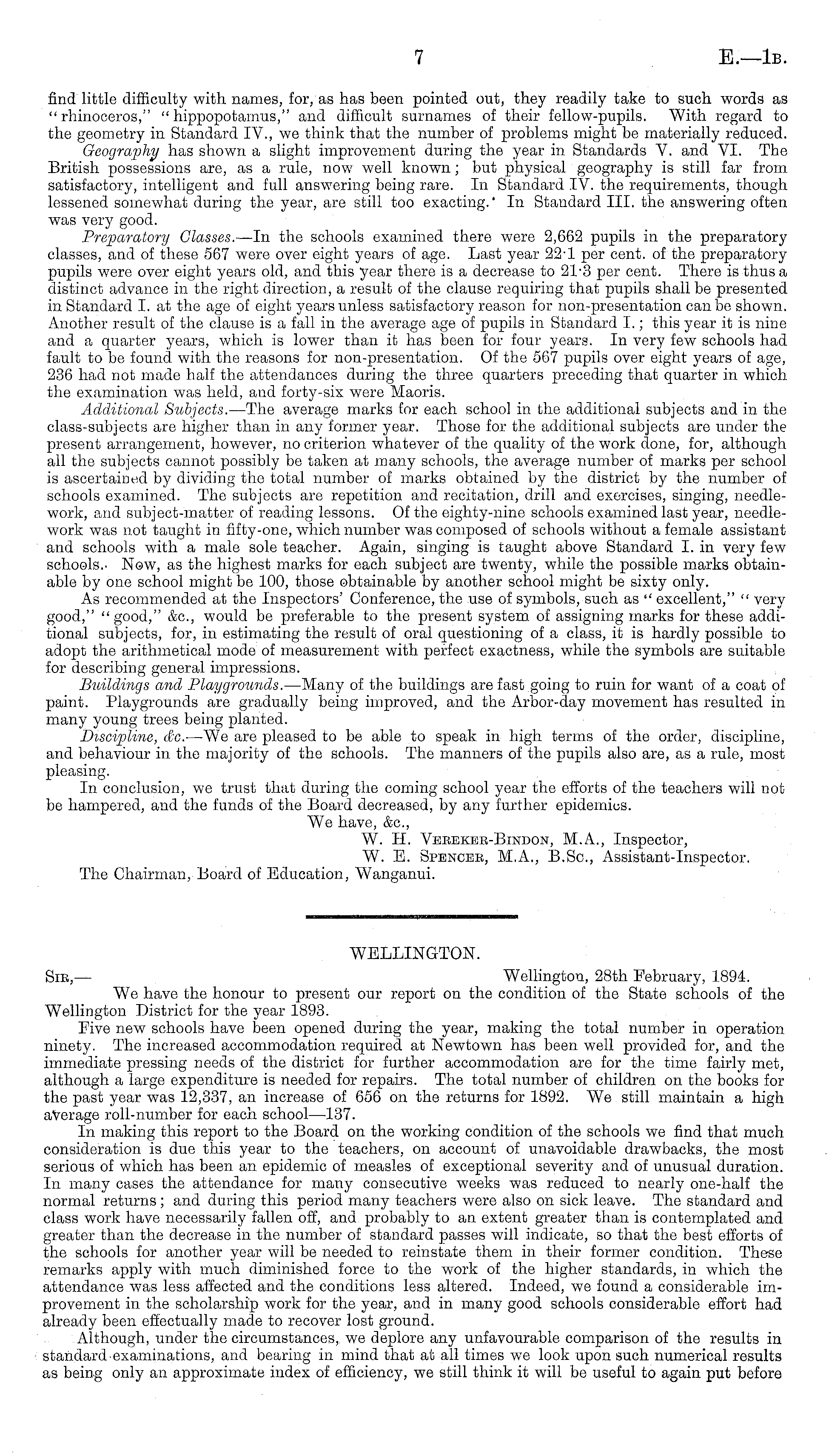 WELLINGTON. Sib,—- Wellington, 28th February, 1894. We have the honour to present our report on the condition of the State schools of the Wellington District for the year 1893. Five new schools have been opened during the year, making the total number in operation ninety. The increased accommodation required at Newtown has been well provided for, and the immediate pressing needs of the district for further accommodation are for the time fairly met, although a large expenditure is needed for repairs. The total number of children on the books for the past year was 12,337, an increase of 656 on the returns for 1892. We still maintain a high average roll-number for each school—l 37. In making this report to the Board on the working condition of the schools we find that much consideration is due this year to the teachers, on account of unavoidable drawbacks, the most serious of which has been an epidemic of measles of exceptional severity and of unusual duration. In many cases the attendance for many consecutive weeks was reduced to nearly one-half the normal returns; and during this period many teachers were also on sick leave. The standard and class work have necessarily fallen off, and probably to an extent greater than is contemplated and greater than the decrease in the number of standard passes will indicate, so that the best efforts of the schools for another year will be needed to reinstate them in their former condition. These remarks apply with much diminished force to the work of the higher standards, in which the attendance was less affected and the conditions less altered. Indeed, we found a considerable improvement in the scholarship work for the year, and in many good schools considerable effort had already been effectually made to recover lost ground. Although, under the circumstances, we deplore any unfavourable comparison of the results in standard examinations, and bearing in mind that at all times we look upon such numerical results as being only an approximate index of efficiency, we still think it will be useful to again put before