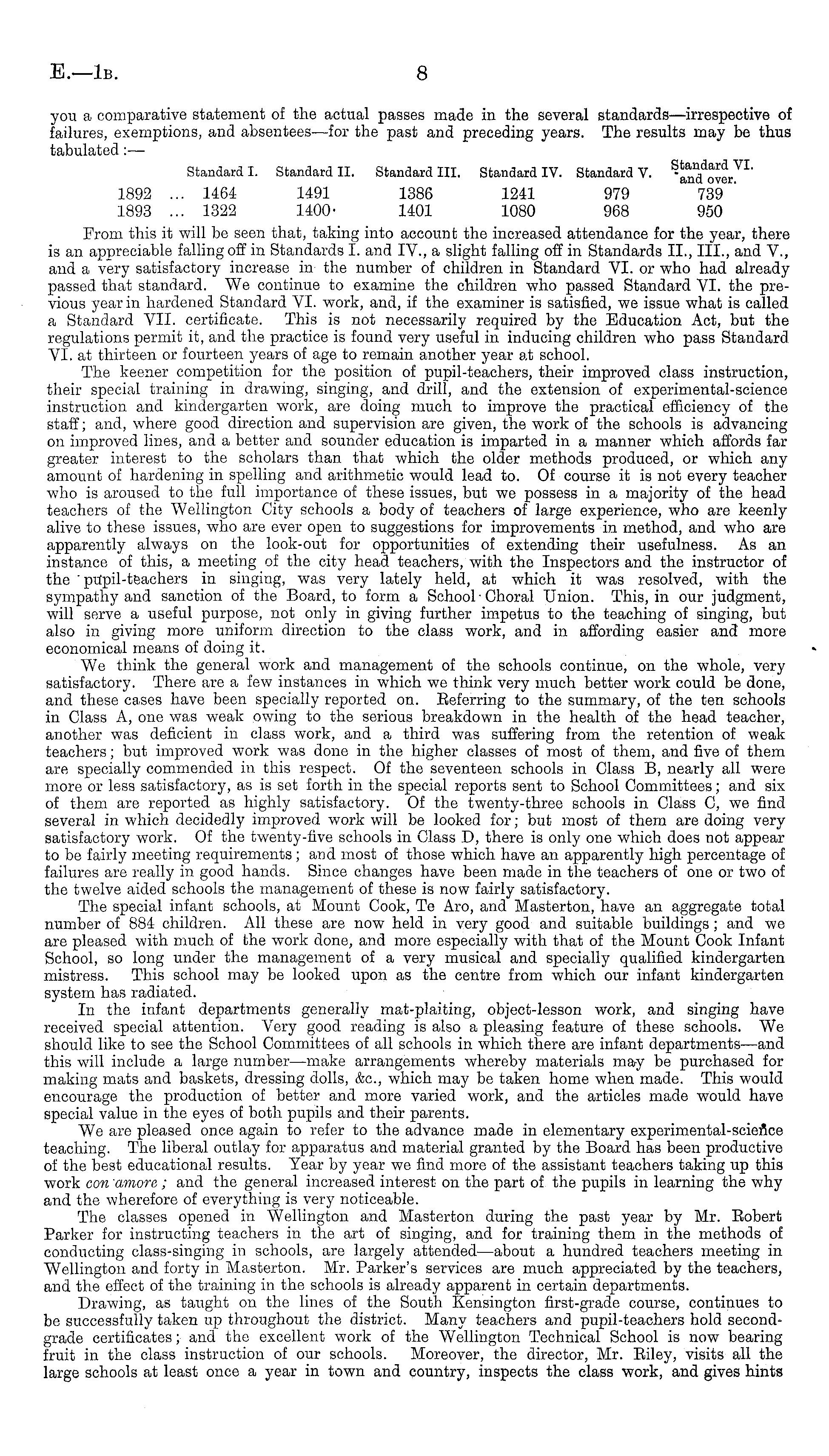 From this it will be seen that, taking into account the increased attendance for the year, there is an appreciable falling off in Standards I. and IV., a slight falling off in Standards 11., 111., and V., and a very satisfactory increase in the number of children in Standard VI. or who had already passed that standard. We continue to examine the children who passed Standard VI. the previous year in hardened Standard VI. work, and, if the examiner is satisfied, we issue what is called a Standard VII. certificate. This is not necessarily required by the Education Act, but the regulations permit it, and the practice is found very useful in inducing children who pass Standard VI. at thirteen or fourteen years of age to remain another year at school. The keener competition for the position of pupil-teachers, their improved class instruction, their special training in drawing, singing, and drill, and the extension of experimental-science instruction and kindergarten work, are doing much to improve the practical efficiency of the staff; and, where good direction and supervision are given, the work of the schools is advancing on improved lines, and a better and sounder education is imparted in a manner which affords far greater interest to the scholars than that which the older methods produced, or which any amount of hardening in spelling and arithmetic would lead to. Of course it is not every teacher who is aroused to the full importance of these issues, but we possess in a majority of the head teachers of the Wellington City schools a body of teachers of large experience, who are keenly alive to these issues, who are ever open to suggestions for improvements in method, and who are apparently always on the look-out for opportunities of extending their usefulness. As an instance of this, a meeting of the city head teachers, with the Inspectors and the instructor of the ' pUpil-teachers in singing, was very lately held, at which it was resolved, with the sympathy and sanction of the Board, to form a School • Choral Union. This, in our judgment, will serve a useful purpose, not only in giving further impetus to the teaching of singing, but also in giving more uniform direction to the class work, and in affording easier and more economical means of doing it. We think the general work and management of the schools continue, on the whole, very satisfactory. There are a few instances in which we think very much better work could be done, and these cases have been specially reported on. Referring to the summary, of the ten schools in Class A, one was weak owing to the serious breakdown in the health of the head teacher, another was deficient in class work, and a third was suffering from the retention of weak teachers; but improved work was done in the higher classes of most of them, and five of them are specially commended in this respect. Of the seventeen schools in Class B, nearly all were more or less satisfactory, as is set forth in the special reports sent to School Committees; and six of them are reported as highly satisfactory. Of the twenty-three schools in Class C, we find several in which decidedly improved work will be looked for; but most of them are doing very satisfactory work. Of the twenty-five schools in Class D, there is only one which does not appear to be fairly meeting requirements; and most of those which have an apparently high percentage of failures are really in good hands. Since changes have been made in the teachers of one or two of the twelve aided schools the management of these is now fairly satisfactory. The special infant schools, at Mount Cook, Te Aro, and Masterton, have an aggregate total number of 884 children. All these are now held in very good and suitable buildings ; and we are pleased with much of the work done, and more especially with that of the Mount Cook Infant School, so long under the management of a very musical and specially qualified kindergarten mistress. This school may be looked upon as the centre from which our infant kindergarten system has radiated. In the infant departments generally mat-plaiting, object-lesson work, and singing have received special attention. Very good reading is also a pleasing feature of these schools. We should like to see the School Committees of all schools in which there are infant departments —and this will include a large number—make arrangements whereby materials may be purchased for making mats and baskets, dressing dolls, &c, which may be taken home when made. This would encourage the production of better and more varied work, and the articles made would have special value in the eyes of both pupils and their parents. We are pleased once again to refer to the advance made in elementary experirnental-scien'ce teaching. The liberal outlay for apparatus and material granted by the Board has been productive of the best educational results. Year by year we find more of the assistant teachers taking up this work con amore; and the general increased interest on the part of the pupils in learning the why and the wherefore of everything is very noticeable. The classes opened in Wellington and Masterton during the past year by Mr. Eobert Parker for instructing teachers in the art of singing, and for training them in the methods of conducting class-singing in schools, are largely attended—about a hundred teachers meeting in Wellington and forty in Masterton. Mr. Parker's services are much appreciated by the teachers, and the effect of the training in the schools is already apparent in certain departments. Drawing, as taught on the lines of the South Kensington first-grade course, continues to be successfully taken up throughout the district. Many teachers and pupil-teachers hold secondgrade certificates; and the excellent work of the Wellington Technical School is now bearing fruit in the class instruction of our schools. Moreover, the director, Mr. Eiley, visits all the large schools at least once a year in town and 