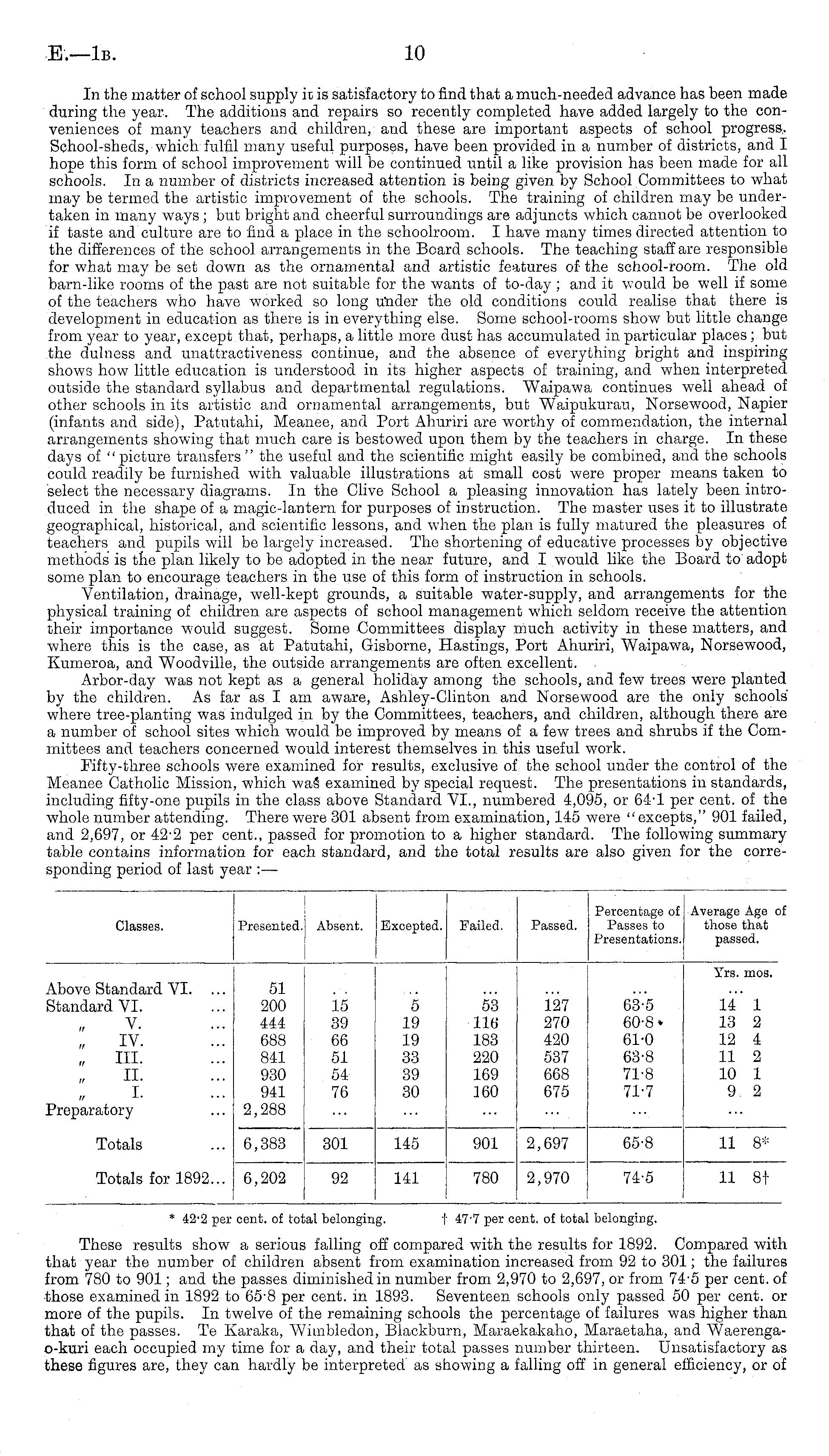 Classes. Presented. Absent. Excepted. Failed. Passed. Percentage of Passes to Presentations. .verage Age o: those that passed. Yrs. mos. Aove Standard VI. Itandard VI. V. „ IV. „ III. II. I. 'reparatory 51 200 444 688 841 930 941 2,288 15 39 66 51 54 76 5 19 19 38 39 30 53 116 183 220 169 160 127 270 420 537 668 675 63-5 60-8 • 61-0 63-8 71-8 71-7 14 1 13 2 12 4 11 2 10 1 9 2 Totals 6,383 301 145 901 2,697 65-8 11 8* Totals for 1892... 6,202 92 141 780 2,970 74-5 11 8+ * 42'2 per cent, of to' ;al belonging. t 47-7 per a int. of total belonging.