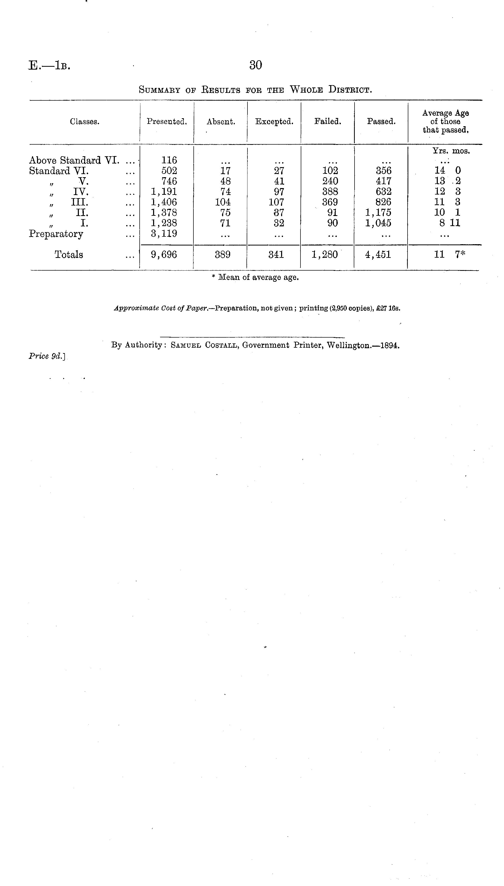 Classes. Presented. Absent. Bxcepted. Failed. Passed. Average Age of those that passed. Yrs. mos. ibove Standard VI. ... Itandard VI. V. „ IV. „ III. II. I. 'reparatory 116 502 746 1,191 1,406 1,378 1,238 3,119 17 48 74 104 75 71 27 41 97 107 37 32 102 240 388 369 91 90 356 417 632 826 1,175 1,045 14 0 13 .2 12 3 11 3 10 1 8 11 Totals 9,696 389 341 1,280 4,451 11 7* * Mean of averai ;e a; ;O.