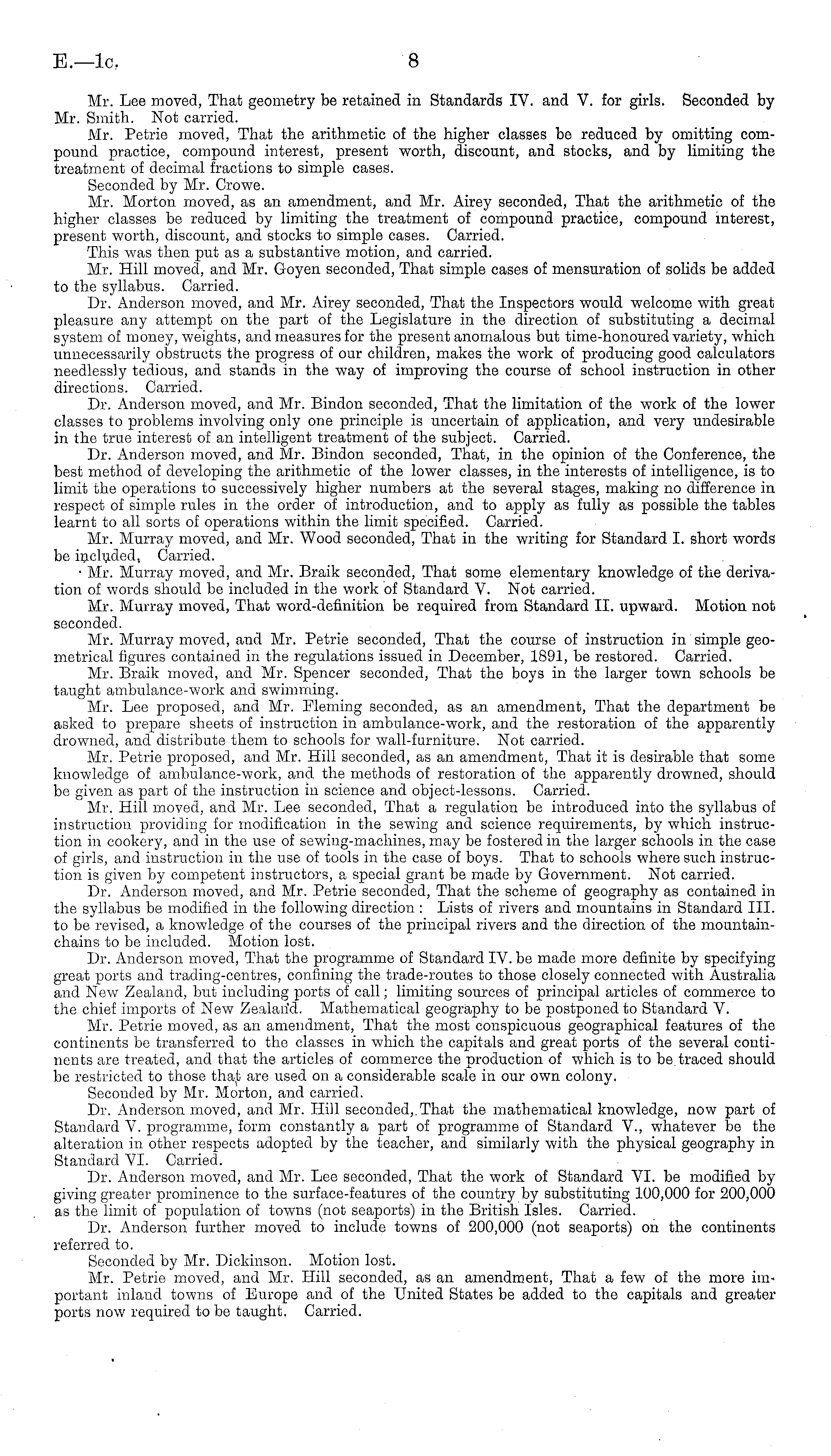 Mr. Lee moved, That geometry be retained in Standards IV. and V. for girls. Seconded by Mr. Smith. Not carried. Mr. Petrie moved, That the arithmetic of the higher classes be reduced by omitting compound practice, compound interest, present worth, discount, and stocks, and by limiting the treatment of decimal fractions to simple cases. Seconded by Mr. Crowe. Mr. Morton moved, as an amendment, and Mr. Airey seconded, That the arithmetic of the higher classes be reduced by limiting the treatment of compound practice, compound interest, present worth, discount, and stocks to simple cases. Carried. This was then put as a substantive motion, and carried. Mr. Hill moved, and Mr. Goyen seconded, That simple cases of mensuration of solids be added to the syllabus. Carried. Dr. Anderson moved, and Mr. Airey seconded, That the Inspectors would welcome with great pleasure any attempt on the part of the Legislature in the direction of substituting a decimal system of money, weights, and measures for the present anomalous but time-honoured variety, which unnecessarily obstructs the progress of our children, makes the work of producing good calculators needlessly tedious, and stands in the way of improving the course of school instruction in other directions. Carried. Dr. Anderson moved, and Mr. Bindon seconded, That the limitation of the work of the lower classes to problems involving only one principle is uncertain of application, and very undesirable in the true interest of an intelligent treatment of the subject. Carried. Dr. Anderson moved, and Mr. Bindon seconded, That, in the opinion of the Conference, the best method of developing the arithmetic of the lower classes, in the interests of intelligence, is to limit the operations to successively higher numbers at the several stages, making no difference in respect of simple rules in the order of introduction, and to apply as fully as possible the tables learnt to all sorts of operations within the limit specified. Carried. Mr. Murray moved, and Mr. Wood seconded, That in the writing for Standard I. short words be included, Carried. • Mr. Murray moved, and Mr. Braik seconded, That some elementary knowledge of the derivation of words should be included in the work of Standard V. Not carried. Mr. Murray moved, That word-definition be required from Standard 11. upward. Motion not seconded. Mr. Murray moved, and Mr. Petrie seconded, That the course of instruction in simple geometrical figures contained in the regulations issued in December, 1891, be restored. Carried. Mr. Braik moved, and Mr. Spencer seconded, That the boys in the larger town schools be taught ambulance-work and swimming. Mr. Lee proposed, and Mr. Fleming seconded, as an amendment, That the department be asked to prepare sheets of instruction in ambulance-work, and the restoration of the apparently drowned, and distribute them to schools for wall-furniture. Not carried. Mr. Petrie proposed, and Mr. Hill seconded, as an amendment, That it is desirable that some knowledge of ambulance-work, and the methods of restoration of the apparently drowned, should be given as part of the instruction in science and object-lessons. Carried. Mr. Hill moved, and Mr. Lee seconded, That a regulation be introduced into the syllabus of instruction providing for modification in the sewing and science requirements, by which instruction in cookery, and in the use of sewing-machines, may be fostered in the larger schools in the case of girls, and instruction in the use of tools in the case of boys. That to schools where such instruction is given by competent instructors, a special grant be made by Government. Not carried. Dr. Anderson moved, and Mr. Petrie seconded, That the scheme of geography as contained in the syllabus be modified in the following direction : Lists of rivers and mountains in Standard 111. to be revised, a knowledge of the courses of the principal rivers and the direction of the mountainchains to be included. Motion lost. Dr. Anderson moved, That the programme of Standard IV. be made more definite by specifying great ports and trading-centres, confining the trade-routes to those closely connected with Australia and New Zealand, but including ports of call; limiting sources of principal articles of commerce to the chief imports of New Zealand. Mathematical geography to be postponed to Standard V. Mr. Petrie moved, as an amendment, That the most conspicuous geographical features of the continents be transferred to the classes in which the capitals and great ports of the several continents are treated, and that the articles of commerce the production of which is to be. traced should be restricted to those thajt are used on a considerable scale in our own colony. Seconded by Mr. Morton, and carried. Dr. Anderson moved, and Mr. Hill seconded,. That the mathematical knowledge, now part of Standard V. programme, form constantly a part of programme of Standard V., whatever be the alteration in other respects adopted by the teacher, and similarly with the physical geography in Standard VI. Carried. Dr. Anderson moved, and Mr. Lee seconded, That the work of Standard VI. be modified by giving greater prominence to the surface-features of the country by substituting 100,000 for 200,000 as the limit of population of towns (not seaports) in the British Isles. Carried. Dr. Anderson further moved to include towns of 200,000 (not seaports) on the continents referred to. Seconded by Mr. Dickinson. Motion lost. Mr. Petrie moved, and Mr. Hill seconded, as an amendment, That a few of the more important inland towns of Europe and of the United States be added to the capitals and greater ports now required to be taught. Carried.