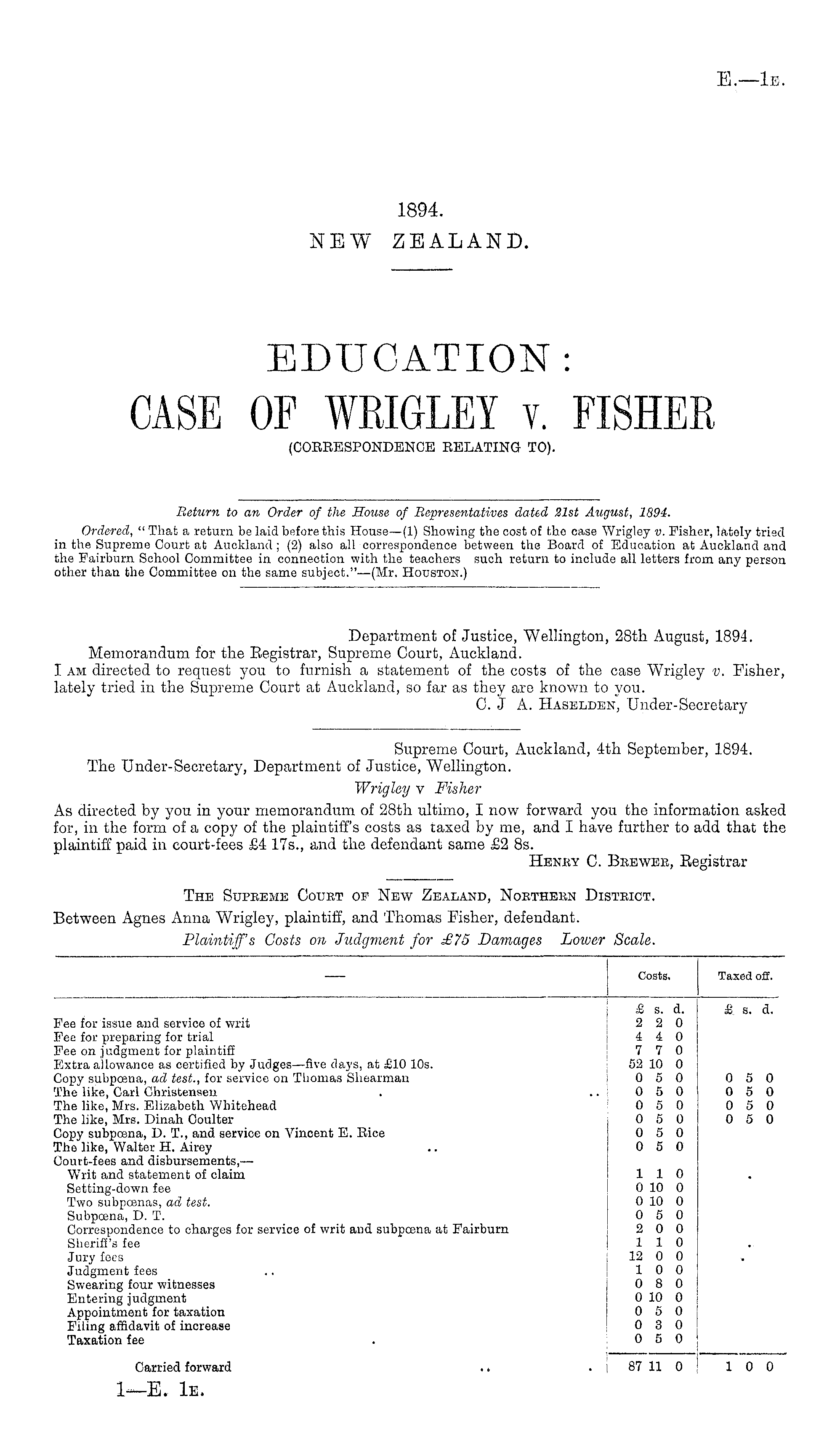 Return to an Order of the House of Representatives dated 21st August., 1894. Ordered, " That a return be laid before this House—(l) Showing the cost of the ca,se Wrigley v. Fisher, lately tried in the Supreme Court at Auckland ; (2) also all correspondence between the Board of Education at Auckland and the Fairburn School Committee in connection with the teachers such return to include all letters from any person other than the Committee on the same subject."—(Mr. Houston.)