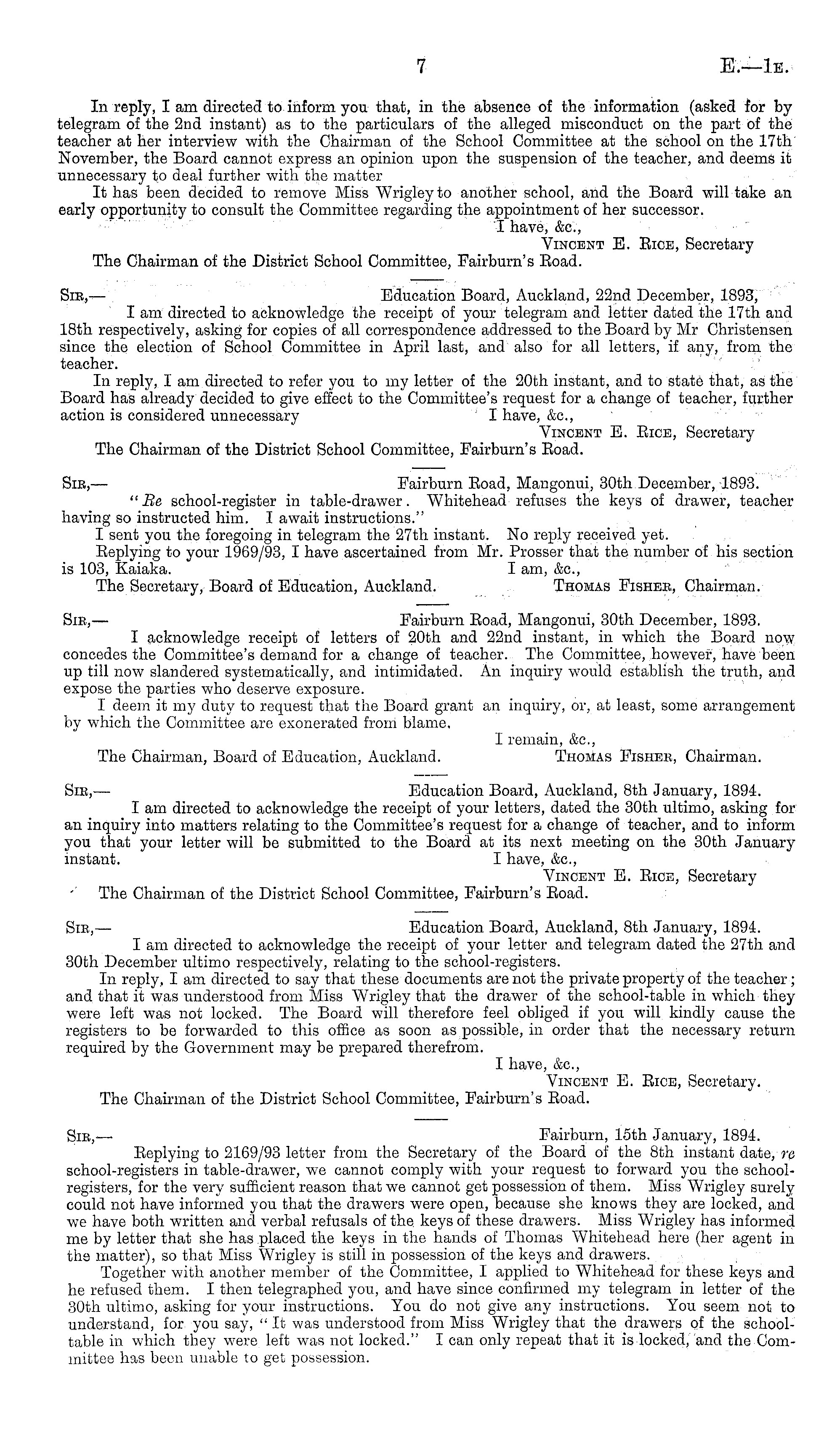 Sic, — Education Board, Auckland, 22nd December, 1893, I am directed to acknowledge the receipt of your telegram and letter dated the 17th and 18th respectively, asking for copies of all correspondence addressed to the Board by Mr Christensen since the election of School Committee in April last, and also for all letters, if any, from the teacher. In reply, I am directed to refer you to my letter of the 20th instant, and to state that, as the Board has already decided to give effect to the Committee's request for a change of teacher, further action is considered unnecessary I have, &c, Vincent E. Bice, Secretary The Chairman of the District School Committee, Fairburn's Boad.