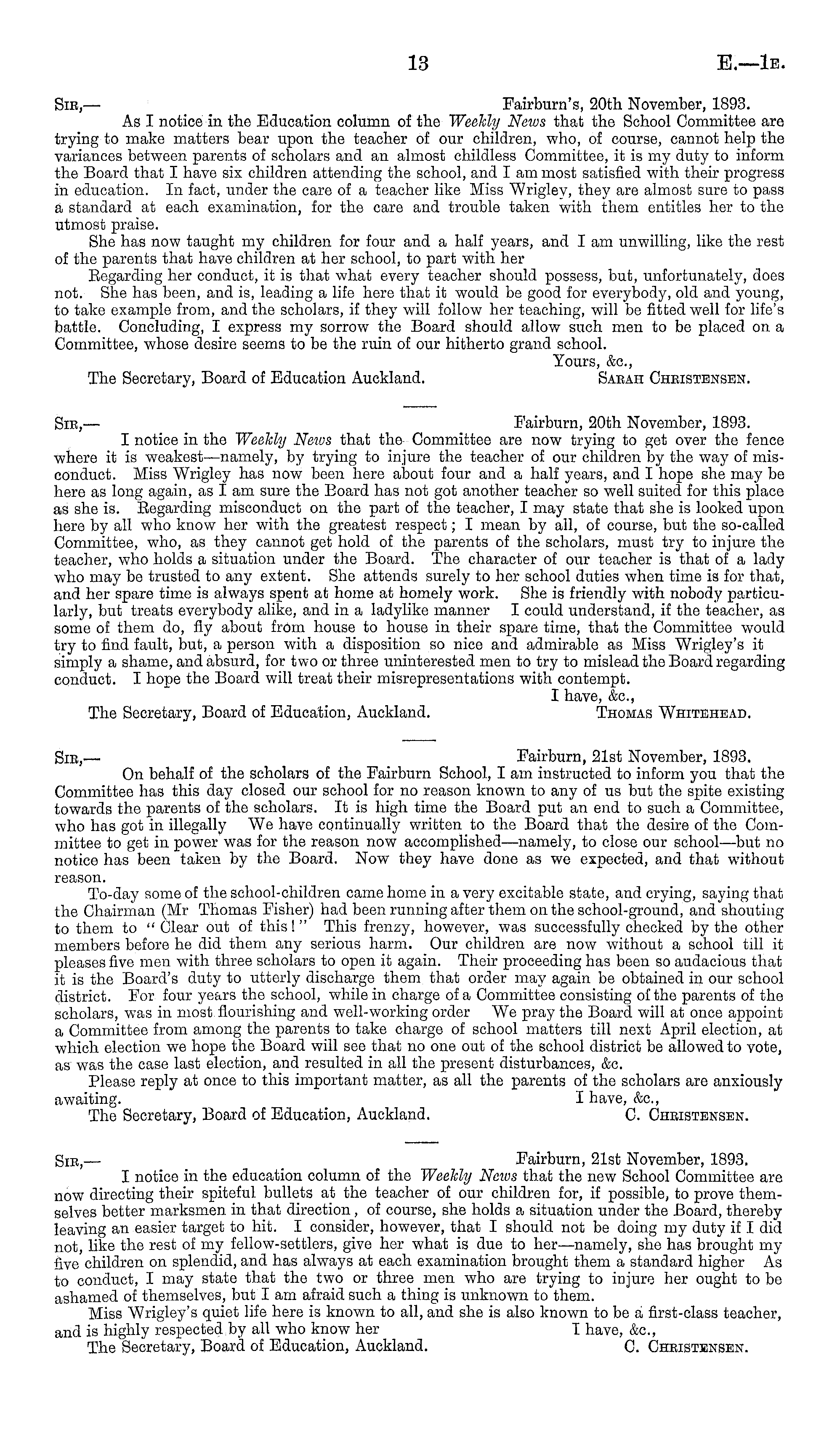 Sic, — Fairburn, 21st November, 1893. On behalf of tho scholars of the Fairburn School, I am instructed to inform you that the Committee has this day closed our school for no reason known to any of us but the spite existing towards the parents of the scholars. It is high time the Board put an end to such a Committee, who has got in illegally We have continually written to the Board that the desire of the Committee to get in power was for the reason now accomplished—namely, to close our school—but no notice has been taken by the Board. Now they have done as we expected, and that without reason. To-day some of the school-children came home in a very excitable state, and crying, saying that the Chairman (Mr Thomas Fisher) had been running after them on the school-ground, and shouting to them to " Clear out of this!" This frenzy, however, was successfully checked by the other members before he did them any serious harm. Our children are now without a school till it pleases five men with three scholars to open it again. Their proceeding has been so audacious that it is the Board's duty to utterly discharge them that order may again be obtained in our school district. For four years the school, while in charge of a Committee consisting of the parents of the scholars, was in most flourishing and well-working order We pray the Board will at once appoint a Committee from among the parents to take charge of school matters till next April election, at which election we hope the Board will see that no one out of the school district be allowed to vote, as was the case last election, and resulted in all the present disturbances, &c. Please reply at once to this important matter, as all the parents of the scholars are anxiously awaiting. I have, &c, The Secretary, Board of Education, Auckland. C. Chbistensen.