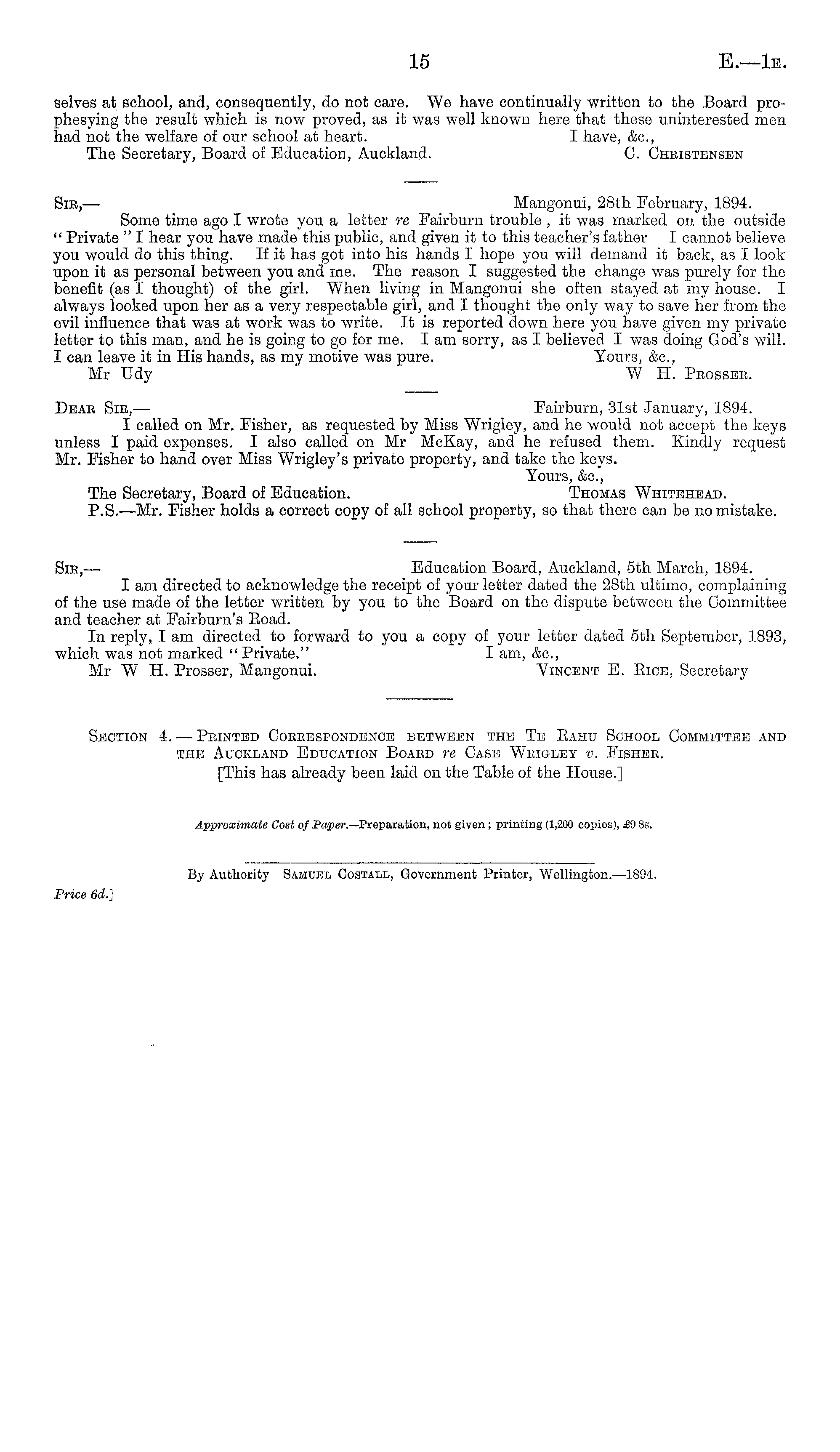 Sic, — Education Board, Auckland, sth March, 1894. I am directed to acknowledge the receipt of your letter dated the 28th ultimo, complaining of the use made of the letter written by you to the Board on the dispute between the Committee and teacher at Fairbum's Eoad. In reply, I am directed to forward to you a copy of your letter dated sth September, 1893, which was not marked " Private." I am, &c, Mr W H. Prosser, Mangonui. Vincent E. Bice, Secretary