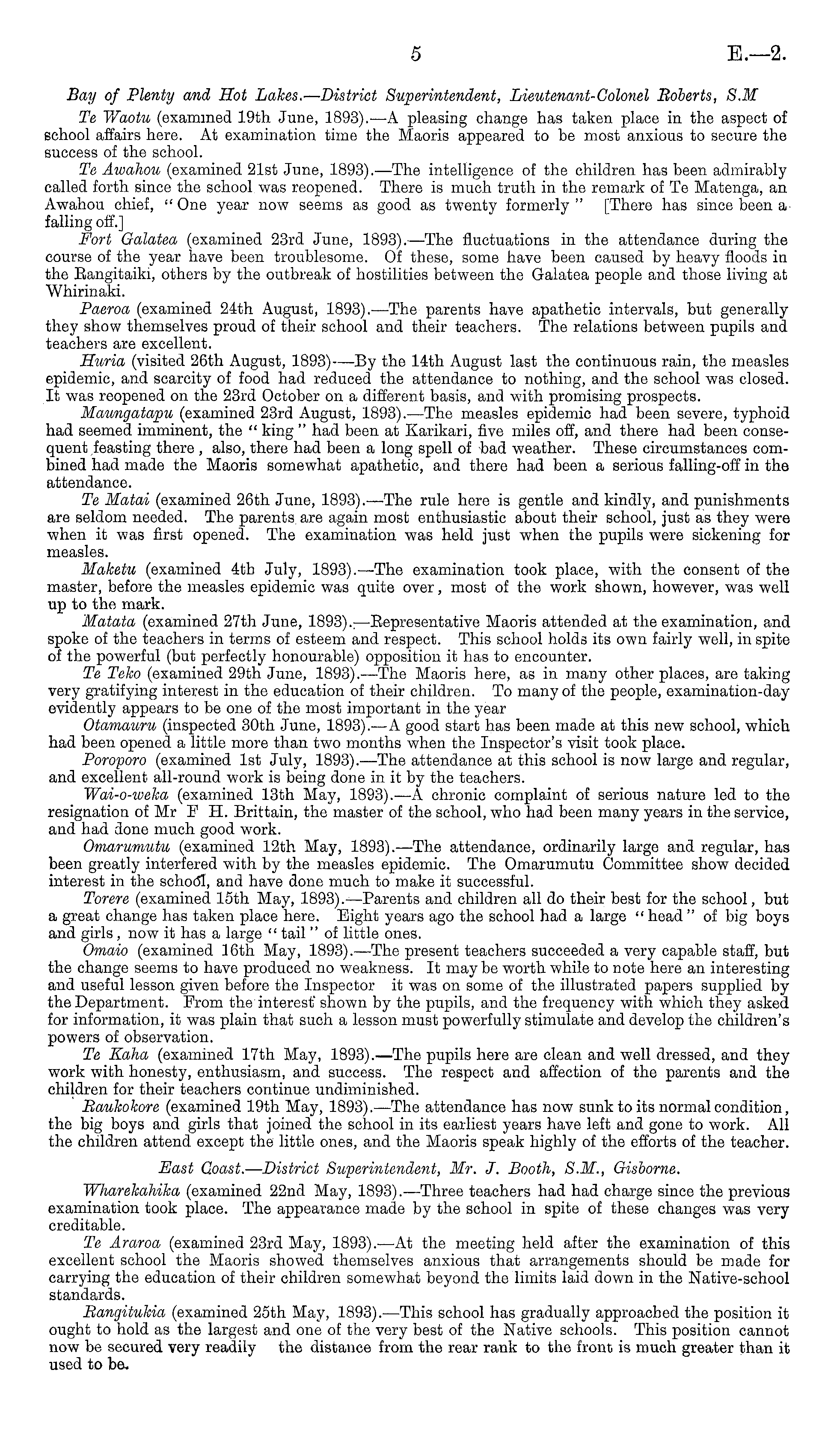 Bay of Plenty and Hot Lakes. — District Superintendent, Lieutenant-Colonel Boberts, S.M Te Waotu (examined 19th June, 1893). —A pleasing change has taken place in the aspect of school affairs here. At examination time the Maoris appeared to be most anxious to secure the success of the school. Te Awahou (examined 21st June, 1893). —The intelligence of the children has been admirably called forth since the school was reopened. There is much truth in the remark of Te Matenga, an Awahou chief, "One year now seems as good as twenty formerly" [There has since been a> falling off.] Fort Galatea (examined 23rd June, 1893). —The fluctuations in the attendance during the course of the year have been troublesome. Of these, some have been caused by heavy floods in the Rangitaiki, others by the outbreak of hostilities between the Galatea people and those living at Whirinaki. Paeroa (examined 24th August, 1893). —The parents have apathetic intervals, but generally they show themselves proud of their school and their teachers. The relations between pupils and teachers are excellent. Huria (visited 26th August, 1893) —By the 14th August last the continuous rain, the measles epidemic, and scarcity of food had reduced the attendance to nothing, and the school was closed. It was reopened on the 23rd October on a different basis, and with promising prospects. Maungatapu (examined 23rd August, 1893). —The measles epidemic had been severe, typhoid had seemed imminent, the " king " had been at Karikari, five miles off, and there had been consequent feasting there , also, there had been a long spell of bad weather. These circumstances combined had made the Maoris somewhat apathetic, and there had been a serious falling-off in the attendance. Te Matai (examined 26th June, 1893). —The rule here is gentle and kindly, and punishments are seldom needed. The parents are again most enthusiastic about their school, just as they were when it was first opened. The examination was held just when the pupils were sickening for measles. Maketu (examined 4tb July, 1893). —-The examination took place, with the consent of the master, before the measles epidemic was quite over, most of the work shown, however, was well up to the mark. Matata (examined 27th June, 1893).: —Representative Maoris attended at the examination, and spoke of the teachers in terms of esteem and respect. This school holds its own fairly well, in spite of the powerful (but perfectly honourable) opposition it has to encounter. Te Teko (examined 29th June, 1893). —The Maoris here, as in many other places, are taking very gratifying interest in the education of their children. To many of the people, examination-day evidently appears to be one of the most important in the year Otamauru (inspected 30th June, 1893). —A good start has been made at this new school, which had been opened, a little more than two months when the Inspector's visit took place. Poroporo (examined Ist July, 1893). —The attendance at this school is now large and regular, and excellent all-round work is being done in it by the teachers. Wai-o-weka (examined 13th May, 1893). —A chronic complaint of serious nature led to the resignation of Mr F H. Brittain, the master of the school, who had been many years in the service, and had done much good work. Omarumutu (examined 12th May, 1893). —The attendance, ordinarily large and regular, has been greatly interfered with by the measles epidemic. The Omarumutu Committee show decided interest in the school, and have done much to make it successful. Torere (examined 15th May, 1893). —Parents and children all do their best for the school, but a great change has taken place here. Eight years ago the school had a large " head " of big boys and girls , now it has a large " tail " of little ones. Omaio (examined 16th May, 1893). —The present teachers succeeded a very capable staff, but the change seems to have produced no weakness. It maybe worth while to note here an interesting and useful lesson given before the Inspector it was on some of the illustrated papers supplied by the Department. From the interest shown by the pupils, and the frequency with which they asked for information, it was plain that such a lesson must powerfully stimulate and develop the children's powers of observation. Te Kaha (examined 17th May, 1893). —The pupils here are clean and well dressed, and they work with honesty, enthusiasm, and success. The respect and affection of the parents and the children for their teachers continue undiminished. Baukokore (examined 19th May, 1893). —The attendance has now sunk to its normal condition, the big boys and girls that joined the school in its earliest years have left and gone to work. All the children attend except the little ones, and the Maoris speak highly of the efforts of the teacher. East Goast. — District Superintendent, Mr. J. Booth, S.M., Gisborne. Wharekahika (examined 22nd May, 1893). —Three teachers had had charge since the previous examination took place. The appearance made by the school in spite of these changes was very creditable. Te Araroa (examined 23rd May, 1893). —At the meeting held after the examination of this excellent school the Maoris showed themselves anxious that arrangements should be made for carrying the education of their children somewhat beyond the limits laid down in the Native-school standards. Bangitukia (examined 25th May, 1893). —This school has gradually approached the position it ought to hold as the largest and one of the very best of the Native schools. This position cannot now be secured very readily the distance from the rear rank to the front is much greater than it used to be.