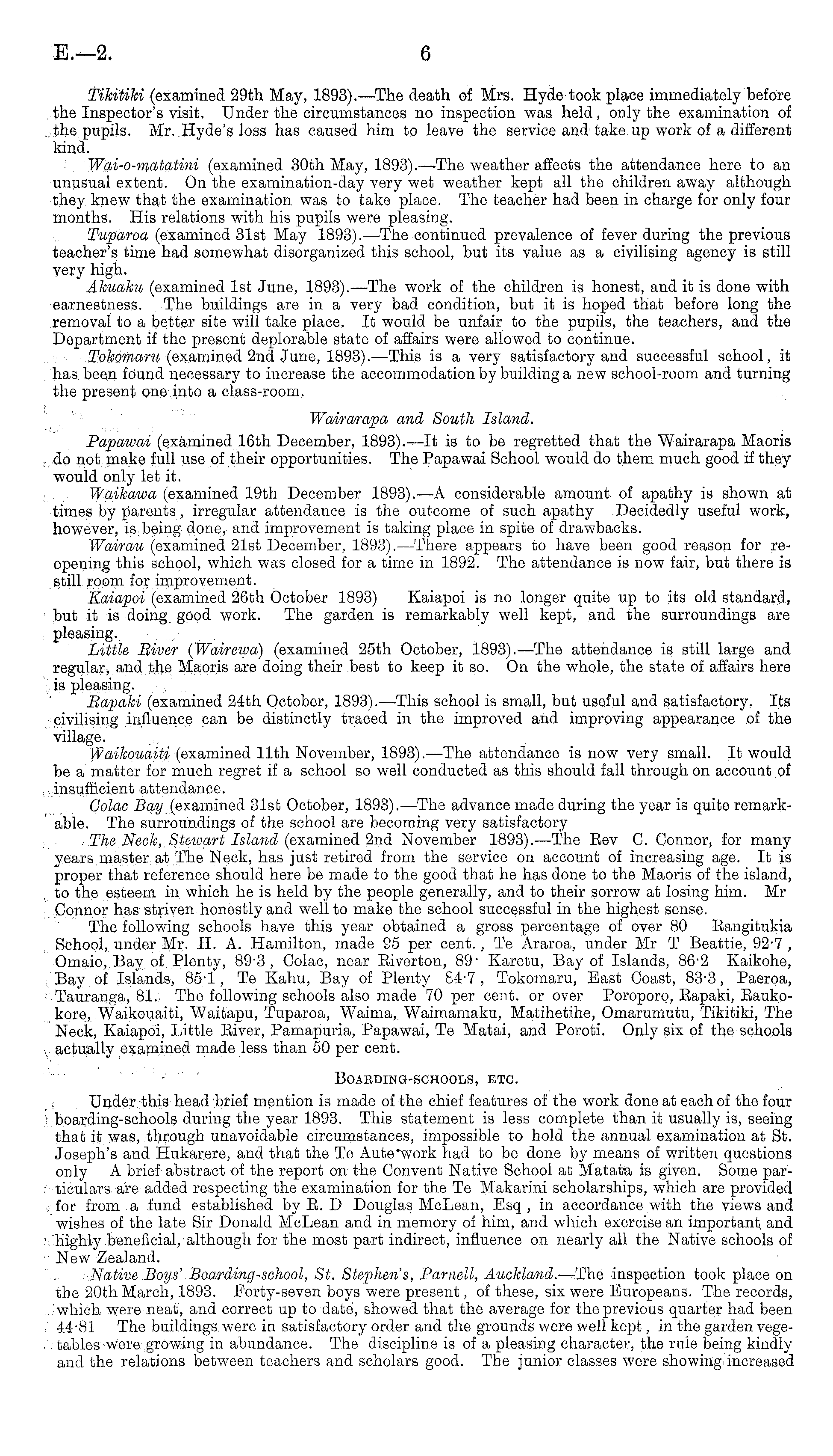 Tikitiki (examined 29th May, 1893).—The death of Mrs. Hyde took place immediately before the Inspector's visit. Under the circumstances no inspection was held, only the examination of the pupils. Mr. Hyde's loss has caused him to leave the service and take up work of a different kind. Wai-o-matatini (examined 30th May, 1893). —The weather affects the attendance here to an unusual extent. On the examination-day very wet weather kept all the children away although they knew that the examination was to take place. The teacher had been in charge for only four months. His relations with his pupils were pleasing. Tuparoa (examined 31st May 1893). —The continued prevalence of fever during the previous teacher's time had somewhat disorganized this school, but its value as a civilising agency is still very high. Ahuahu (examined Ist June, 1893). —The work of the children is honest, and it is done with earnestness. The buildings are in a very bad condition, but it is hoped that before long the removal to a better site will take place. It would be unfair to the pupils, the teachers, and the Department if the present deplorable state of affairs were allowed to continue. Tohomaru (examined 2nd June, 1893). —This is a very satisfactory and successful school, it has been found necessary to increase the accommodation by building a new school-room and turning the present one into a class-room. Wairarapa and South Island. Papawai (examined 16th December, 1893). —It is to be regretted that the Wairarapa Maoris do not make full use of their opportunities. The Papawai School would do them much good if they would only let it. Waikawa (examined 19th December 1893). —A considerable amount of apathy is shown at times by parents, irregular attendance is the outcome of such apathy Decidedly useful work, however, is being done, and improvement is taking place in spite of drawbacks. Wairau (examined 21st December, 1893). —There appears to have been good reason for reopening this school, which was closed for a time in 1892. The attendance is now fair, but there is still room for improvement. Kaiapoi (examined 26th October 1893) Kaiapoi is no longer quite up to its old standard, but it is doing good work. The garden is remarkably well kept, and the surroundings are pleasing. Little River (Wairewa) (examined 25th October, 1893). —The attendance is still large and regular, and the Maoris are doing their best to keep it so. On the whole, the state of affairs here is pleasing. Hapaki (examined 24th October, 1893). —This school is small, but useful and satisfactory. Its civilising influence can be distinctly traced in the improved and improving appearance of the village. Waikouaiti (examined 11th November, 1893). —The attendance is now very small. It would be a matter for much regret if a school so well conducted as this should fall through on account of insufficient attendance. Colac Bay (examined 31st October, 1893). —The advance made during the year is quite remarkable. The surroundings of the school are becoming very satisfactory The Neck, Steioart Island (examined 2nd November 1893). —The Eev C. Connor, for many years master at The Neck, has just retired from the service on account of increasing age. It is proper that reference should here be made to the good that he has done to the Maoris of the island, to the esteem in which he is held by the people generally, and to their sorrow at losing him. Mr Connor has striven honestly and well to make the school successful in the highest sense. The following schools have this year obtained a gross percentage of over 80 Eangitukia School, under Mr. H. A. Hamilton, made 95 per cent. , Te Araroa, under Mr T Beattie, 92-7 , Omaio, Bay of Plenty, 89-3, Colac, near Eiverton, 89' Karetu, Bay of Islands, 862 Kaikohe, Bay of Islands, 85; 1, Te Kahu, Bay of Plenty 84-7, Tokomaru, East Coast, 83-3, Paeroa, Tauranga, 81. The following schools also made 70 per cent, or over Poroporo, Eapaki, Eaukokore, Waikouaiti, Waitapu, Tuparoa, Waima, Waimamaku, Matihetihe, Omarumutu, Tikitiki, The Neck, Kaiapoi, Little Eiver, Pamapuria, Papawai, Te Matai, and Poroti. Only six of the schools actually examined made less than 50 per cent. BOAEDING-SCHOOLS, ETC. Under this head brief mention is made of the chief features of the work done at each of the four boarding-schools during the year 1893. This statement is less complete than it usually is, seeing that it was, through unavoidable circumstances, impossible to hold the annual examination at St. Joseph's and Hukarore, and that the Te Aute'work had to be done by means of written questions only A brief abstract of the report on the Convent Native School at Matata is given. Some particulars are added respecting the examination for the Te Makarini scholarships, which are provided for from a fund established by E. D Douglas McLean, Esq , in accordance with the views and wishes of the late Sir Donald McLean and in memory of him, and which exercise an important and highly beneficial, although for the most part indirect, influence on nearly all the Native schools of New Zealand. Native Boys' Boarding-school, St. Stephen's, Parnell, Auckland. —The inspection took place on the 20th March, 1893. Forty-seven boys were present, of these, six were Europeans. The records, which were neat, and correct up to date, showed that the average for the previous quarter had been 44-81 The buildings were in satisfactory order and the grounds were well kept, in the garden vegetables were growing in abundance. The discipline is of a pleasing character, the rule being kindly and the relations between teachers and scholars good. The junior classes were showing:increased