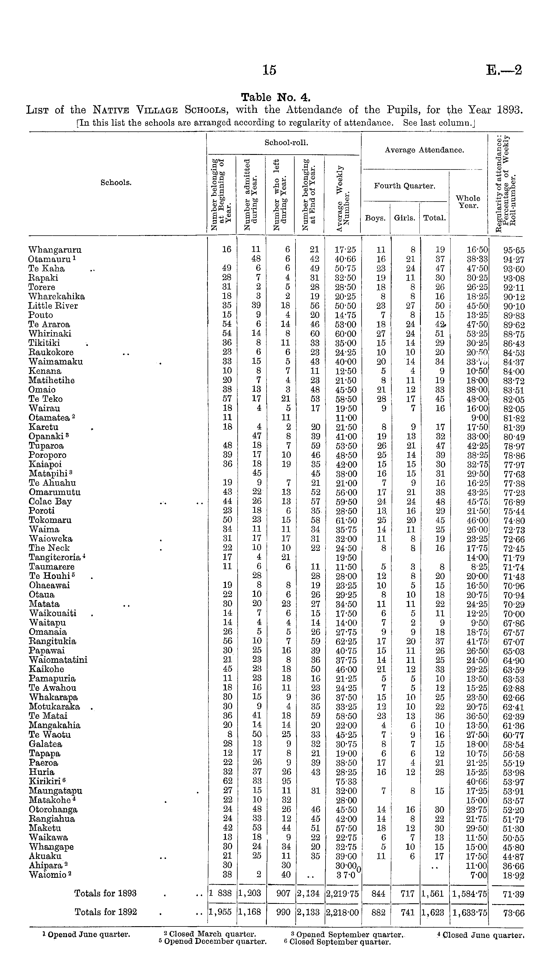 Table No. 4. List of the Native Village Schools, with the Attendance of the Pupils, for the Year 1893. [In this list the schools are arranged according to regularity of attendance. See last column.]