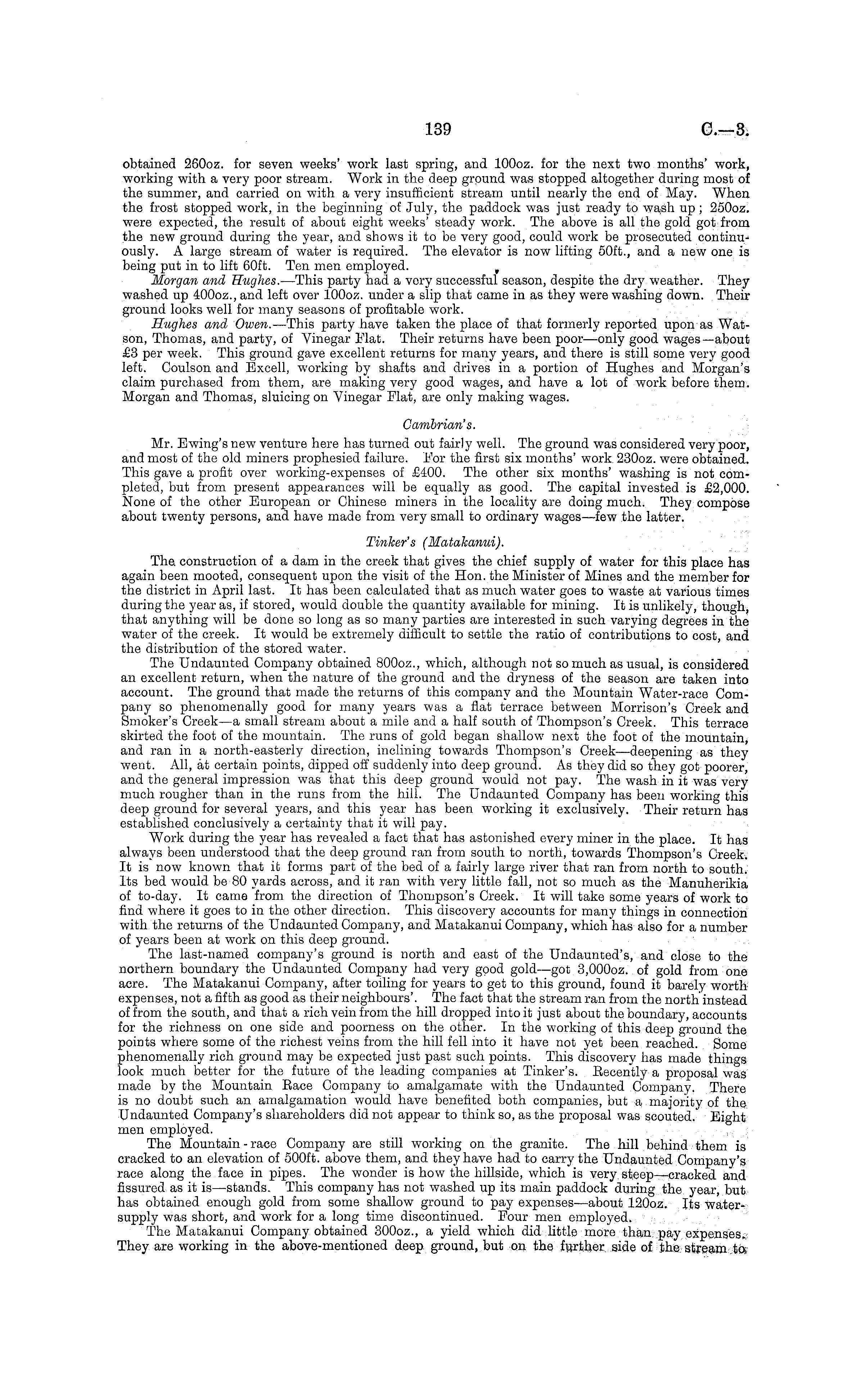 obtained 2600z. for seven weeks' work last spring, and lOOoz. for the next two months' work, working with a very poor stream. Work in the deep ground was stopped altogether during most of the summer, and carried on with a very insufficient stream until nearly the end of May. When the frost stopped work, in the beginning of July, the paddock was just ready to wash up ; 2500z. were expected, the result of about eight weeks' steady work. The above is all the gold got from the new ground during the year, and shows it to be very good, could work be prosecuted continue ously. A large stream of water is required. The elevator is now lifting 50ft., and a new one is being put in to lift 60ft. Ten men employed. Morgan and Htcghes. —This party had a very successful season, despite the dry weather. They washed up 4000z., and left over lOOoz. under a slip that came in as they were washing down. Their ground looks well for many seasons of profitable work. Hughes and Owen. —This party have taken the place of that formerly reported upon as Watson, Thomas, and party, of Vinegar Mat. Their returns have been poor—only good wages—about £3 per week. This ground gave excellent returns for many years, and there is still some very good left. Coulson and Excell, working by shafts and drives in a portion of Hughes and Morgan's claim purchased from them, are making very good wages, and have a lot of work before them. Morgan and Thomas, sluicing on Vinegar Flat, are only making wages. Cambrian's. Mr. Ewing's new venture here has turned out fairly well. The ground was considered very poor, and most of the old miners prophesied failure. For the first six months' work. 2300z. were obtained. This gave a profit over working-expenses of £400. The other six months' washing is not completed, but from present appearances will be equally as good. The capital invested is £2,000. None of the other European or Chinese miners in the locality are doing much. They compose about twenty persons, and have made from very small to ordinary wages—few the latter. Tinker's (Matakanui). The. construction of a dam in the creek that gives the chief supply of water for this place has again been mooted, consequent upon the visit of the Hon. the Minister of Mines and the member for the district in April last. It has been calculated that as much water goes to waste at various times during the year as, if stored, would double the quantity available for mining. It is unlikely, though, that anything will be done so long as so many parties are interested in such varying degrees in the water of the creek. It would be extremely difficult to settle the ratio of contributions to cost, and the distribution of the stored water. The Undaunted Company obtained 800oz., which, although not so much as usual, is considered an excellent return, when the nature of the ground and the dryness of the season are taken into account. The ground that made the returns of this company and the Mountain Water-race Company so phenomenally good for many years was a flat terrace between Morrison's Creek and Smoker's Creek—a small stream about a mile and a half south of Thompson's Creek. This terrace skirted the foot of the mountain. The runs of gold began shallow next the foot of the mountain, and ran in a north-easterly direction, inclining towards Thompson's Creek—deepening as they went. All, at certain points, dipped off suddenly into deep ground. As they did so they got poorer, and the general impression was that this deep ground would not pay. The wash in it was very much rougher than in the runs from the hill. The Undaunted Company has been working this deep ground for several years, and this year has been working it exclusively. Their return has established conclusively a certainty that it will pay. Work during the year has revealed a fact that has astonished every miner in the place. It has always been understood that the deep ground ran from south to north, towards Thompson's Creek. It is now known that it forms part of the bed of a fairly large river that ran from north to south. Its bed would be 80 yards across, and it ran with very little fall, not so much as the Manuherikia of to-day. It came from the direction of Thompson's Creek. It will take some years of work to find where it goes to in the other direction. This discovery accounts for many things in connection with the returns of the Undaunted Company, and Matakanui Company, which has also for a number of years been at work on this deep ground. The last-named company's ground is north and east of the Undaunted's, and close to the northern boundary the Undaunted Company had very good gold —got 3,0000z. of gold from one acre. The Matakanui Company, after toiling for years to get to this ground, found it barely worth expenses, not a fifth as good as their neighbours'. The fact that the stream ran from the north'instead of from the south, and that a rich vein from the hill dropped into it just about the boundary, accounts for the richness on one side and poorness on the other. In the working of this deep ground the points where some of the richest veins from the hill fell into it have not yet been reached. Some phenomenally rich ground may be expected just past such points. This discovery has made things look much better for the future of the leading companies at Tinker's. Eecently a proposal was made by the Mountain Eace Company to amalgamate with the Undaunted Company. There is no doubt such an amalgamation would have benefited both companies, but a majority of the Undaunted Company's shareholders did not appear to think so, as the proposal was scouted. Eight men employed. The Mountain - race Company are still working on the granite. The hill behind them is cracked to an elevation of 500 ft. above them, and they have had to carry the Undaunted Company's race along the face in pipes. The wonder is how the hillside, which is very, steep—cracked and fissured as it is—stands. This company has 