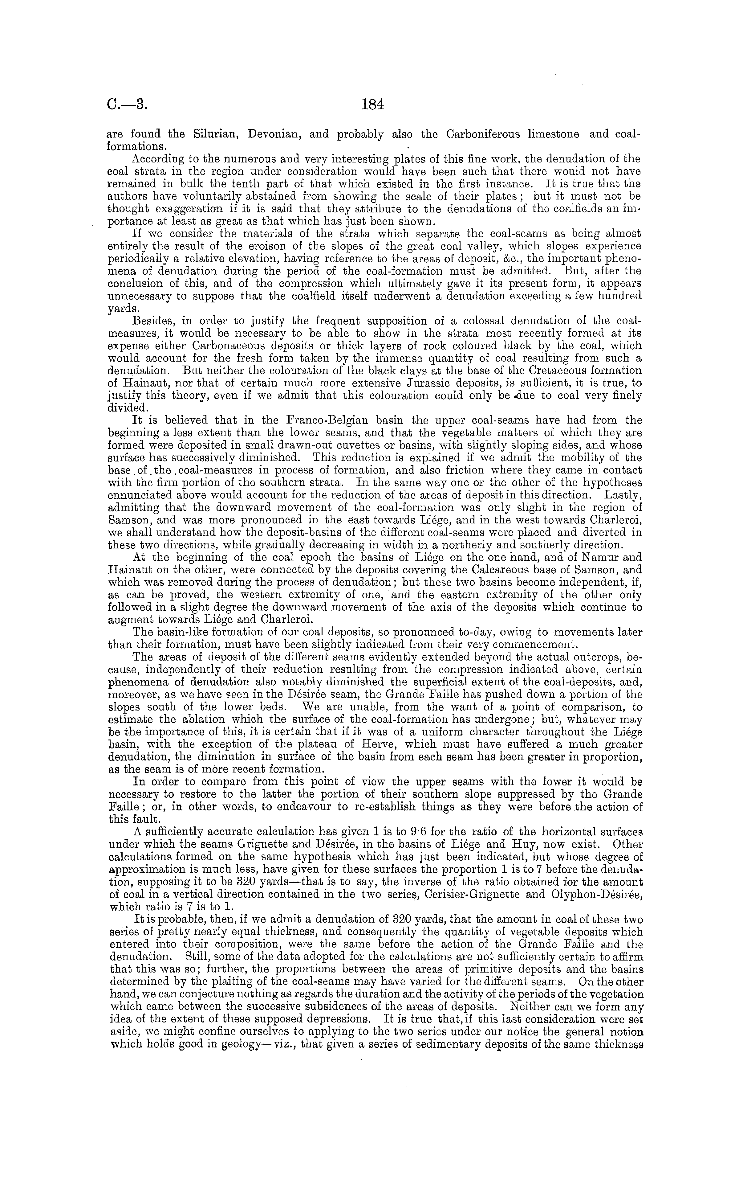 are found the Silurian, Devonian, and probably also the Carboniferous limestone and coalformations. According to the numerous and very interesting plates of this fine work, the denudation of the coal strata in the region under consideration would have been such that there would not have remained in bulk the tenth part of that which existed in the first instance. It is true that the authors have voluntarily abstained from showing the scale of their plates ; but it must not be thought exaggeration if it is said that they attribute to the denudations of the coalfields an importance at least as great as that which has just been shown. If we consider the materials of the strata which separate the coal-seams as being almost entirely the result of the eroison of the slopes of the great coal valley, which slopes experience periodically a relative elevation, having reference to the areas of deposit, &c, the important phenomena of denudation during the period of the coal-formation must be admitted. But, after the conclusion of this, and of the compression which ultimately gave it its present form, it appears unnecessary to suppose that the coalfield itself underwent a denudation exceeding a few hundred yards. Besides, in order to justify the frequent supposition of a colossal denudation of the coalmeasures, it would be necessary to be able to show in the strata most recently formed at its expense either Carbonaceous deposits or thick layers of rock coloured black by the coal, which would account for the fresh form taken by the immense quantity of coal resulting from such a denudation. But neither the colouration of the black clays at the base of the Cretaceous formation of Hainaut, nor that of certain much more extensive Jurassic deposits, is sufficient, it is true, to justify this theory, even if we admit that this colouration could only be <due to coal very finely divided. It is believed that in the Franco-Belgian basin the upper coal-seams have had from the beginning a less extent than the lower seams, and that the vegetable matters of which they are formed were deposited in small drawn-out cuvettes or basins, with slightly sloping sides, and whose surface has successively diminished. This reduction is explained if we admit the mobility of the base .of . the . coal-measures in process of formation, and also friction where they came in contact with the firm portion of the southern strata. In the same way one or the other of the hypotheses ennunciated above would account for the reduction of the areas of deposit in this direction. Lastly, admitting that the downward movement of the coal-formation was only slight in the region of Samson, and was more pronounced in the east towards Liege, and in the west towards Charleroi, we shall understand how the deposit-basins of the different coal-seams were placed and diverted in these two directions, while gradually decreasing in width in a northerly and southerly direction. At the beginning of the coal epoch the basins of Liege on the one hand, and of Namur and Hainaut on the other, were connected by the deposits covering the Calcareous base of Samson, and which was removed daring the process of denudation; but these two basins become independent, if, as can be proved, the western extremity of one, and the eastern extremity of the other only followed in a plight degree the downward movement of the axis of the deposits which continue to augment towards Liege and Charleroi. The basin-like formation of our coal deposits, so pronounced to-day, owing to movements later than their formation, must have been slightly indicated from their very commencement. The areas of deposit of the different seams evidently extended beyond the actual outcrops, because, independently of their reduction resulting from the compression indicated above, certain phenomena of denudation also notably diminished the superficial extent of the coal-deposits, and, moreover, as we have seen in the Desiree seam, the Grande Faille has pushed down a portion of the slopes south of the lower beds. We are unable, from the want of a point of comparison, to estimate the ablation which the surface of the coal-formation has undergone; but, whatever may be the importance of this, it is certain that if it was of a uniform character throughout the Liege basin, with the exception of the plateau of Herve, which must have suffered a much greater denudation, the diminution in surface of the basin from each seam has been greater in proportion, as the seam is of more recent formation. In order to compare from this point of view the upper seams with the lower it would be necessary to restore to the latter the portion of their southern slope suppressed by the Grande Faille; or, in other words, to endeavour to re-establish things as they were before the action of this fault. A sufficiently accurate calculation has given 1 is to 9-6 for the ratio of the horizontal surfaces under which the seams Grignette and Desiree, in the basins of Liege and Huy, now exist. Other calculations formed on the same hypothesis which has just been indicated, but whose degree of approximation is much less, have given for these surfaces the proportion 1 is to 7 before the denudation, supposing it to be 320 yards —that is to say, the inverse of the ratio obtained for the amount of coal in a vertical direction contained in the two series, Cerisier-Grignette and Olyphon-Desiree, which ratio is 7 is to 1. It is probable, then, if we admit a denudation of 320 yards, that the amount in coal of these two series of pretty nearly equal thickness, and consequently the quantity of vegetable deposits which entered into their composition, were the same before the action of the Grande Faille and the denudation. Still, some of the data adopted for the calculations are not sufficiently certain to affirm that this was so; further, the proportions between the areas of primitive deposits and the basins determined by the plaiting of the coal-seams may ha