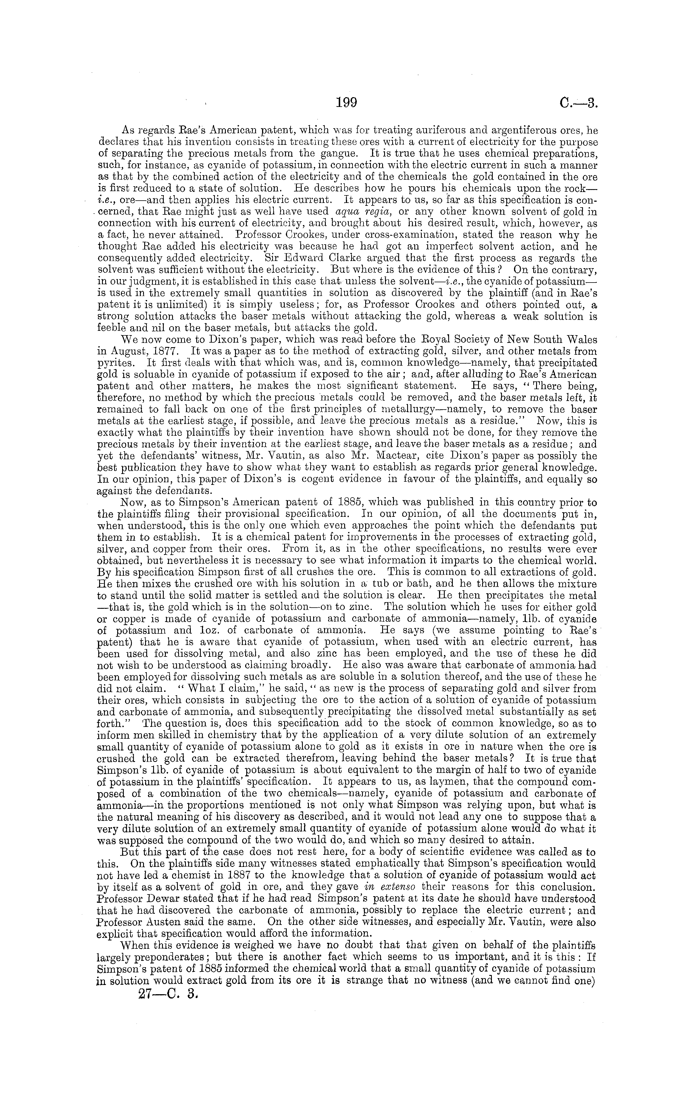 As regards Eae's American patent, which was for treating auriferous and argentiferous ores, he declares that his invention consists in treating these ores with a current of electricity for the purpose of separating the precious metals from the gangue. It is true that he uses chemical preparations, such, for instance, as cyanide of potassium, in connection with the electric current in such a manner as that by the combined action of the electricity and of the chemicals the gold contained in the ore is first reduced to a state of solution. He describes how he pours his chemicals upon the rock— i.e., ore —and then applies his electric current. It appears to us, so far as this specification is concerned, that Bae might just as well have used aqua regia, or any other known solvent of gold in connection with his current of electricity, and brought about his desired result, which, however, as a fact, he never attained. Professor Crookes, under cross-examination, stated the reason why he thought Bae added his electricity was because he had got an imperfect solvent action, and he consequently added electricity. Sir Edward Clarke argued that the first process as regards the solvent was sufficient without the electricity. But where is the evidence of this ? On the contrary, in our judgment, it is established in this case that unless the solvent— i.e., the cyanide of potassium— is used in the extremely small quantities in solution as discovered by the plaintiff (and in Bae's patent it is unlimited) it is simply useless; for, as Professor Crookes and others pointed out, a strong solution attacks the baser metals without attacking the gold, whereas a weak solution is feeble and nil on the baser metals, but attacks the gold. We now come to Dixon's paper, which was read before the Boyal Society of New South Wales in August, 1877. It was a paper as to the method of extracting gold, silver, and other metals from pyrites. It first deals with that which was, and is, common knowledge—namely, that precipitated gold is solvable in cyanide of potassium if exposed to the air; and, after alluding to Bae's American patent and other matters, he makes the most significant statement. He says, " There being, therefore, no method by which the precious metals could be removed, and the baser metals left, it remained to fall back on one of the first principles of metallurgy—namely, to remove the baser metals at the earliest stage, if possible, and leave the precious metals as a residue." Now, this is exactly what the plaintiffs by their invention have shown should not be done, for they remove the precious metals by their invention at the earliest stage, and leave the baser metals as a residue ; and yet the defendants' witness, Mr. Vautin, as also Mr. Mactear, cite Dixon's paper as possibly the best publication they have to show what they want to establish as regards prior general knowledge. In our opinion, this paper of Dixon's is cogent evidence in favour of the plaintiffs, and equally so against the defendants. Now, as to Simpson's American patent of 1885, which was published in this country prior to the plaintiffs filing their provisional specification. In our opinion, of all the documents put in, when understood, this is the only one which even approaches the point which the defendants put them in to establish. It is a chemical patent for improvements in the processes of extracting gold, silver, and copper from their ores. From it, as in the other specifications, no results were ever obtained, but nevertheless it is necessary to see what information it imparts to the chemical world. By his specification Simpson first of all crushes the ore. This is common to all extractions of gold. He then mixes the crushed ore with his solution in a tub or bath, and he then allows the mixture to stand until the solid matter is settled and the solution is clear. He then precipitates the metal —that is, the gold which is in the solution—on to zinc. The solution which he uses for either gold or copper is made of cyanide of potassium and carbonate of ammonia—namely, lib. of cyanide of potassium and loz. of carbonate of ammonia. He says (we assume pointing to Eae's patent) that he is aware that cyanide of potassium, when used with an electric current, has been used for dissolving metal, and also zinc has been employed, and the use of these he did not wish to be understood as claiming broadly. He also was aware that carbonate of ammonia had been employed for dissolving such metals as are soluble in a solution thereof, and the use of these he did not claim. " What I claim," he said, "as new is the process of separating gold and silver from their ores, which consists in subjecting the ore to the action of a solution of cyanide of potassium and carbonate of ammonia, and subsequently precipitating the dissolved metal substantially as set forth." The question is, does this specification add to the stock of common knowledge, so as to inform men skilled in chemistry that by the application of a very dilute solution of an extremely small quantity of cyanide of potassium alone to gold as it exists in ore in nature when the ore is crushed, the gold can be extracted therefrom, leaving behind the baser metals? It is true that Simpson's lib. of cyanide of potassium is about equivalent to the margin of half to two of cyanide of potassium in the plaintiffs' specification. It appears to us, as laymen, that the compound composed of a combination of the two chemicals—namely, cyanide of potassium and carbonate of ammonia—in the proportions mentioned is not only what Simpson was relying upon, but what is the natural meaning of his discovery as described, and it would not lead any one to suppose that a very dilute solution of an extremely small quantity of cyanide of potassium alone would do what it was supposed the compound of the two wculd do, and which so many desired to attain. But this part of the case does not rest here, for a body 