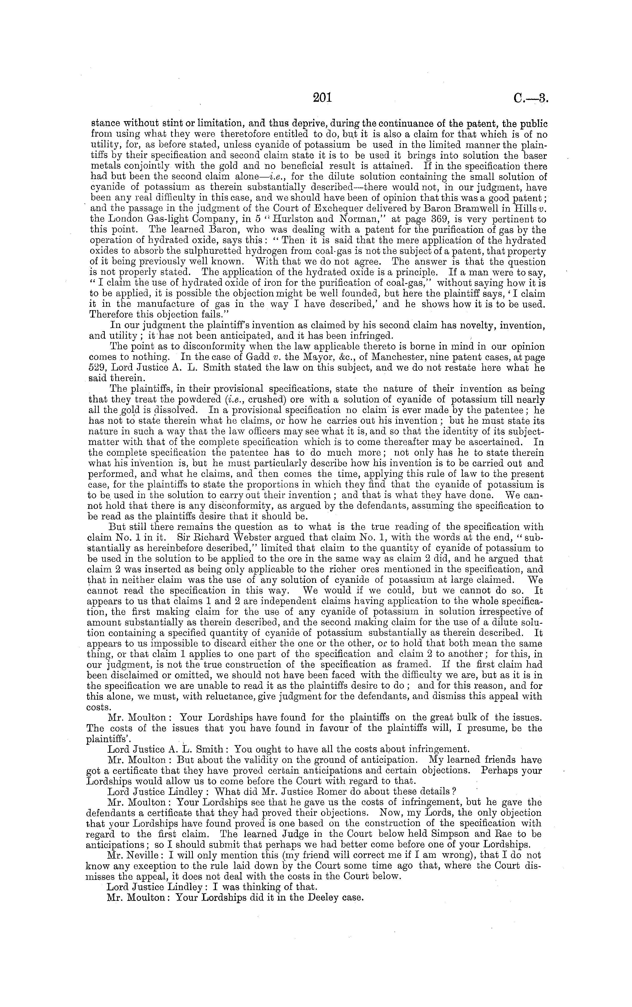 stance without stint or limitation, and thus deprive, during the continuance of the patent, the public from using what they were theretofore entitled to do, but it is also a claim for that which is of no utility, for, as before stated, unless cyanide of potassium be used in the limited manner the plaintiffs by their specification and second claim state it is to be used it brings into solution the baser metals conjointly with the gold and no beneficial result is attained. If in the specification there had but been the second claim alone— i.e., for the dilute solution containing the small solution of cyanide of potassium as therein substantially described—there would not, in our judgment, have been any real difficulty in this case, and we should have been of opinion that this was a good patent; and the passage in the judgment of the Court of Exchequer delivered by Baron Bramwell in Hills v. the London Gas-light Company, in 5 "Hurlston and Norman," at page 369, is very pertinent to this point. The learned Baron, who was dealing with a patent for the purification of gas by the operation of hydrated oxide, says this : " Then it is said that the mere application of the hydrated oxides to absorb the sulphuretted hydrogen from coal-gas is not the subject of a patent, that property of it being previously well known. With that we do not agree. The answer is that the question is not properly stated. The application of the hydrated oxide is a principle. If a man were to say, " I claim the use of hydrated oxide of iron for the purification of coal-gas," without saying how it is to be applied, it is possible the objection might be well founded, but here the plaintiff says, ' I claim it in the manufacture of gas in the way I have described, , and he shows how it is to be used. Therefore this objection fails." In our judgment the plaintiff's invention as claimed by his second claim has novelty, invention, and utility ; it has not been anticipated, and it has been infringed. The point as to disconformity when the law applicable thereto is borne in mind in our opinion comes to nothing. In the case of Gadd v. the Mayor, &c, of Manchester, nine patent cases, at page 529, Lord Justice A. L. Smith stated the law on this subject, and we do not restate here what he said therein. The plaintiffs, in their provisional specifications, state the nature of their invention as being that they treat the powdered (i.e., crushed) ore with a solution of cyanide of potassium till nearly all the gold is dissolved. In a provisional specification no claim is ever made by the patentee; he has not to state therein what he claims, or how he carries out his invention ; but he must state its nature in such a way that the law officers may see what it is, and so that the identity of its subjectmatter with that of the complete specification which is to come thereafter may be ascertained. In the complete specification the patentee has to do much more; not only has he to state therein what his invention is, but he must particularly describe how his invention is to be carried out and performed, and what he claims, and then comes the time, applying this rule of law to the present case, for the plaintiffs to state the proportions in which they find that the cyanide of potassium is to be used in the solution to carry out their invention ; and that is what they have done. We cannot hold that there is any disconformity, as argued by the defendants, assuming the specification to be read as the plaintiff's desire that it should be. But still there remains the question as to what is the true reading of the specification with claim No. lin it. Sir Bichard Webster argued that claim No. 1, with the words at the end, " substantially as hereinbefore described," limited that claim to the quantity of cyanide of potassium to be used in the solution to be applied to the ore in the same way as claim 2 did, and he argued that claim 2 was inserted as being only applicable to the richer ores mentioned in the specification, and that in neither claim was the use of any solution of cyanide of potassium at large claimed. We cannot read the specification in this way. We would if we could, but we cannot do so. It appears to us that claims 1 and 2 are independent claims having application to the whole specification, the first making claim for the use of any cyanide of potassium in solution irrespective of amount substantially as therein described, and the second making claim for the use of a dilute solution containing a specified quantity of cyanide of potassium substantially as therein described. It appears to us impossible to discard either the one or the other, or to hold that both mean the same thing, or that claim 1 applies to one part of the specification and claim 2to another; for this, in our judgment, is not the true construction of the specification as framed. If the first claim had been disclaimed or omitted, we should not have been faced with the difficulty we are, but as it is in the specification we are unable to read it as the plaintiffs desire to do ; and for this reason, and for this alone, we must, with reluctance, give judgment for the defendants, and dismiss this appeal with costs. Mr. Moulton : Your Lordships have found for the plaintiffs on the great bulk of the issues. The costs of the issues that you have found in favour of the plaintiffs will, I presume, be the plaintiffs'. Lord Justice A. L. Smith : You ought to have all the costs about infringement. Mr. Moulton : But about the validity on the ground of anticipation. My learned friends have got a certificate that they have proved certain anticipations and certain objections. Perhaps your Lordships would allow us to come before the Court with regard to that. Lord Justice Lindley : What did Mr. Justice Eomer do about these details ? Mr. Moulton : Your Lordships see that he gave us the costs of infringement, but he gave the defendants a certificate that they had proved their objections. N