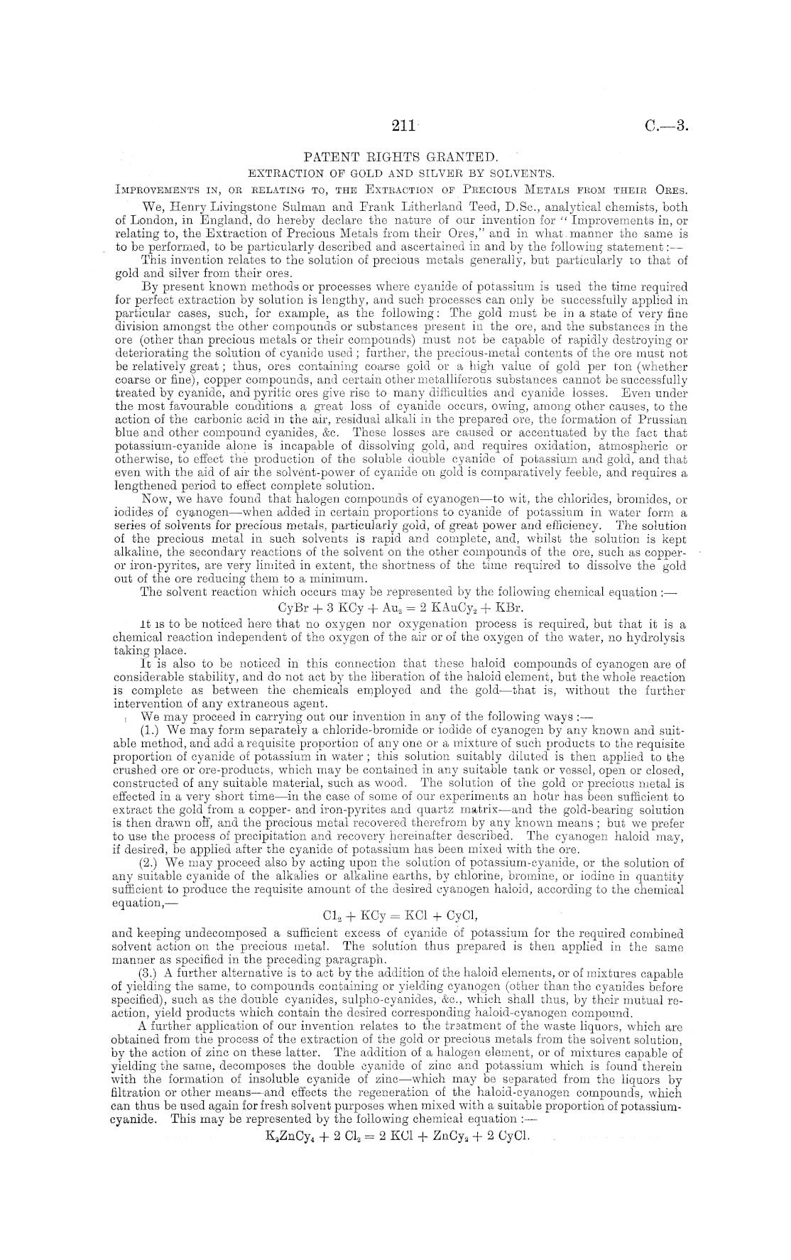 PATENT EIGHTS GEANTED. EXTBACTION OF GOLD AND SILVER BY SOLVENTS. Impbovements in, oe relating to, the Exteaotion op Peecious Metals peom theib Oees. We, Henry Livingstone Sulman and Frank Litherland Teed, D.Sc, analytical chemists, both of London, in England, do hereby declare the nature of our invention for " Improvements in, or relating to, the Extraction of Precious Metals from their Ores," and in what, manner the same is to be performed, to be particularly described and ascertained in and by the following statement :— This invention relates to the solution of precious metals generally, but particularly 10 that of gold and silver from their ores. By present known methods or processes where cyanide of potassium is used the time required for perfect extraction by solution is lengthy, and such processes can only be successfully applied in particular cases, such, for example, as the following: The gold must be in a state of very fine division amongst the other compounds or substances present in the ore, and the substances in the ore (other than precious metals or their compounds) must not be capable of rapidly destroying or deteriorating the solution of cyanide used ; further, the precious-metal contents of the ore must not be relatively great; thus, ores containing coarse gold or a high value of gold per ton (whether coarse or fine), copper compounds, and certain other metalliferous substances cannot be successfully treated by cyanide, and pyritic ores give rise to many difficulties and cyanide losses. Even under the most favourable conditions a great loss of cyanide occurs, owing, among other causes, to the action of the carbonic acid in the air, residual alkali in the prepared ore, the formation of Prussian blue and other compound cyanides, &c. These losses are caused or accentuated by the fact that potassium-cyanide alone is incapable of dissolving gold, and requires oxidation, atmospheric or otherwise, to effect the production of the soluble double cyanide of potassium and gold, and that even with the aid of air the solvent-power of cyanide on gold is comparatively feeble, and requires a lengthened period to effect complete solution. Now, we have found that halogen compounds of cyanogen—to wit, the chlorides, bromides, or iodides of cyanogen—when added in certain proportions to cyanide of potassium in water form a series of solvents for precious metals, particularly gold, of great power and efficiency. The solution of the precious metal in such solvents is rapid and complete, and, whilst the solution is kept alkaline, the secondary reactions of the solvent on the other compounds of the ore, such as copperor iron-pyrites, are very limited in extent, the shortness of the time required to dissolve the gold out of the ore reducing them to a minimum. The solvent reaction which occurs may be represented by the following chemical equation :— Cyßr + 3 KCy + Au 2 = 2 KAuCy, + KBr. It is to be noticed here that no oxygen nor oxygenation process is required, but that it is a chemical reaction independent of the oxygen of the air or of the oxygen of the water, no hydrolysis taking place. It is also to be noticed in this connection that these haloid compounds of cyanogen are of considerable stability, and do not act by the liberation of the haloid element, but the whole reaction is complete as between the chemicals employed and the gold —that is, without the further intervention of any extraneous agent. We may proceed in carrying out our invention in any of the following ways :— (1.) We may form separately a chloride-bromide or iodide of cyanogen by any known and suitable method, and add a requisite proportion of any one or a mixture of such products to the requisite proportion of cyanide of potassium in water ; this solution suitably diluted is then applied to the crushed ore or ore-products, which may be contained in any suitable tank or vessel, open or closed, constructed of any suitable material, such as wood. The solution of the gold or precious metal is effected in a very short time—in the case of some of our experiments an hour has been sufficient to extract the gold from a copper- and iron-pyrites and quartz matrix—and the gold-bearing solution is then drawn off, and the precious metal recovered therefrom by any known means ; but we prefer to use the process of precipitation and recovery hereinafter described. The cyanogen haloid may, if desired, be applied after the cyanide of potassium has been mixed with the ore. (2.) We may proceed also by acting upon the solution of potassium-cyanide, or the solution of any suitable cyanide of the alkalies or alkaline earths, by chlorine, bromine, or iodine in quantity sufficient to produce the requisite amount of the desired cyanogen haloid, according to the chemical equation,— 01, + KCy = XCI + CyCl, and keeping undecomposed a sufficient excess of cyanide of potassium for the required combined solvent action on the precious metal. The solution thus prepared is then applied in the same manner as specified in the preceding paragraph. (3.) A further alternative is to act by the addition of the haloid elements, or of mixtures capable of yielding the same, to compounds containing or yielding cyanogen (other than the cyanides before specified), such as the double cyanides, sulpho-cyanides, &c, which shall thus, by their mutual reaction, yield products which contain the desired corresponding haloid-cyanogen compound. A further application of our invention relates to the treatment of the waste liquors, which are obtained from the process of the extraction of the gold or precious metals from the solvent solution, by the action of zinc on these latter. The addition of a halogen element, or of mixtures capable of yielding the same, decomposes the double cyanide of zinc and potassium which is found therein with the formation of insoluble cyanide of zinc—which may be separated from the liquors by filtration or other means —and effects th