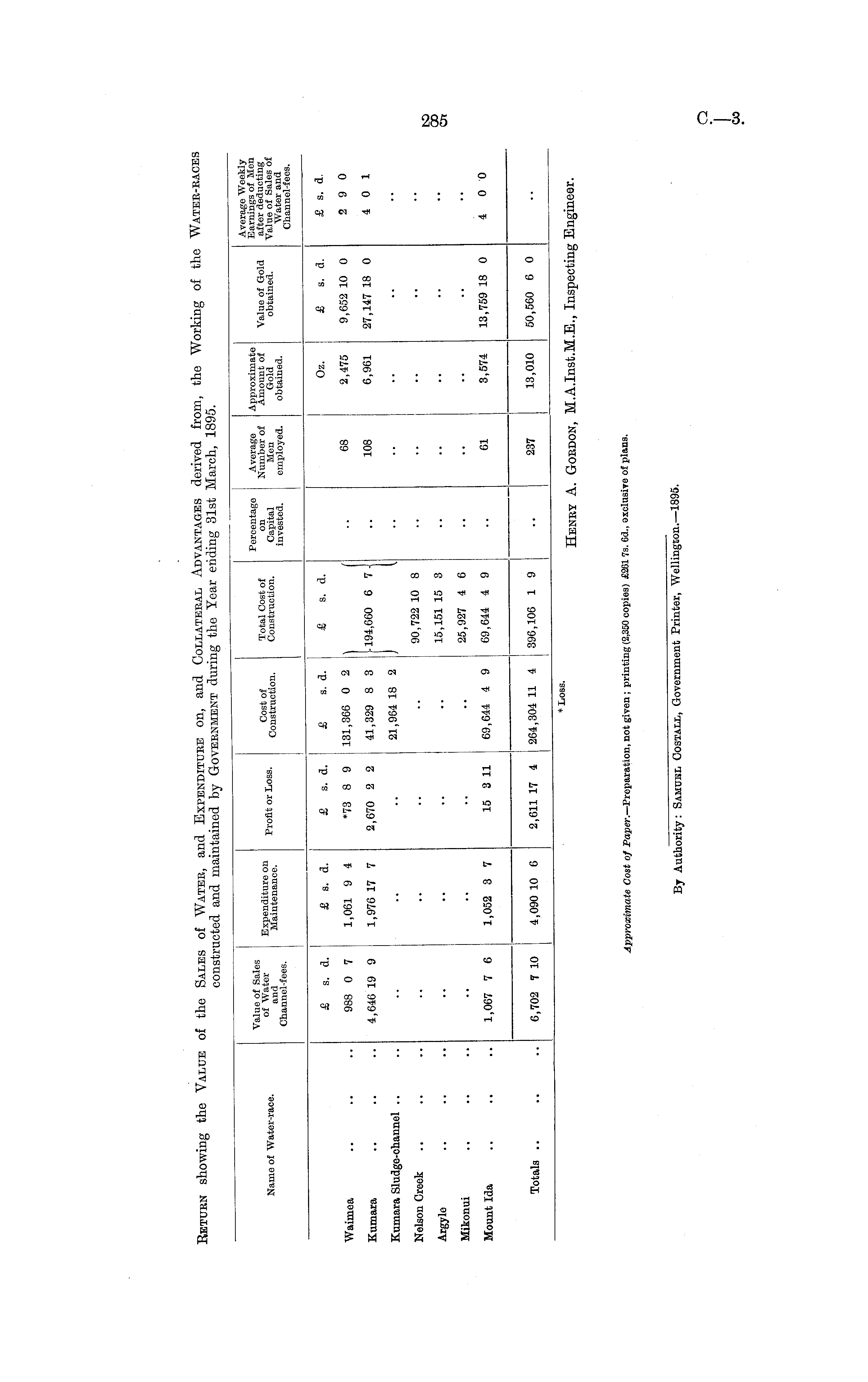 Name of Water-race. Value of Sales of Water and Channel-fees. Expenditure on Maintenance. Profit or Loss. Cost of Construction. Total Cost of Construction. Percentage on Capital invested. Average Number of Men employed. Approximate Amount of Gold obtained. Value of Gold obtained. Average Weekly Earnings of Men after deducting Value of Sales of Water and Channel-fees. £ s. d. £ s. d. £ s. d. £ s. d. & S. d. Oz. £ s. d. £ s. d. 988 0 7 1,061 9 4 *73 8 9 131,366 0 2 1194,660 6 7 J 68 2,475 9,652 10 0 2 9 0 Waimea Kumara 4,646 19 9 1,976 17 7 2,670 2 2 41,329 8 3 108 6,961 27,147 18 0 4 0 1 Kumara Sludge-channel .. 21,964 18 2 Nelson Creek .. 90,722 10 8 Argyle 15,151 15 3 Mikonui 25,927 4 6 | Mount Ida .. .. 1,067 7 6 1,052 3 7 15 3 11 69,644 4 9 69,644 4 9 61 3,574 13,759 18 0 4 0 0 Totala .. 50,560 6 0 6,702 7 10 4,090 10 6 2,611 17 4 264,304 11 4 396,106 1 9 237 13,010 * Loss.