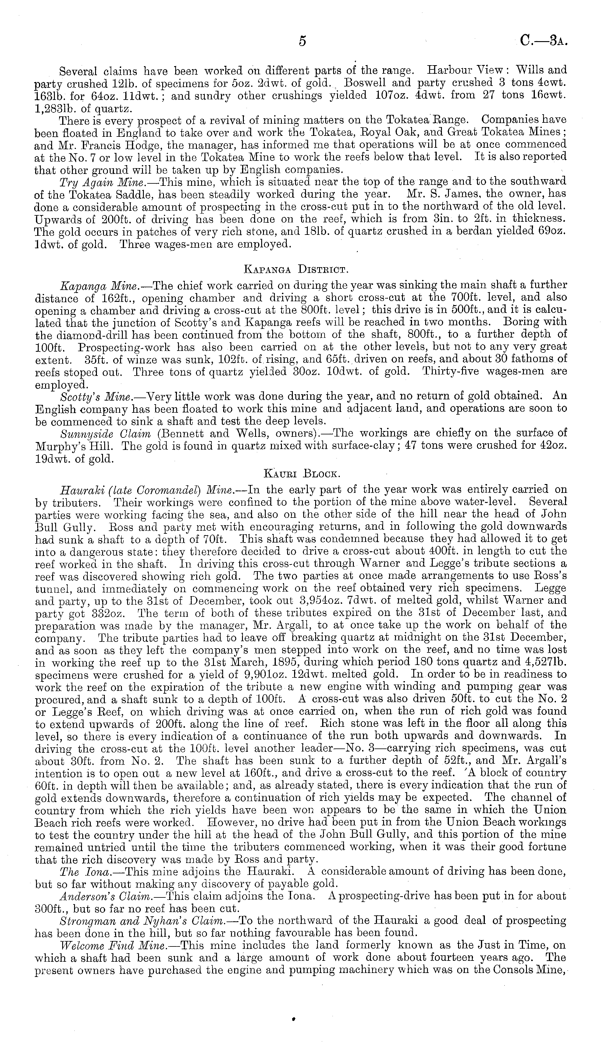 Several claims have been worked on different parts of the range. Harbour View : Wills and party crushed 121b. of specimens for soz. 2dwt. of gold. Boswell and party crushed 3 tons 4cwt. 1631b. for 640z. lldwt. ; and sundry other crushings yielded 107oz. 4dwt. from 27 tons 16cwt. 1,2831b. of quartz. There is every prospect of a revival of mining matters on the Tokatea Eange. Companies have been floated in England to take over and work the Tokatea, Eoyal Oak, and Great Tokatea Mines; and Mr. Francis Hodge, the manager, has informed me that operations will be at once commenced at the No. 7or low level in the Tokatea Mine to work the reefs below that level. It is also reported that other ground will be taken up by English companies. Try Again Mine. —This mine, which is situated near the top of the range and to the southward of the Tokatea Saddle, has been steadily worked during the year. Mr. S. James, the owner, has done a considerable amount of prospecting in the cross-cut put in to the northward of the old level. Upwards of 200 ft. of driving has been done on the reef, which is from 3in. to 2ft. in thickness. The gold occurs in patches of very rich stone, and 181b. of quartz crushed in a berdan yielded 690z. Idwt. of gold. Three wages-men are employed. Kapanga Distbict. Kapanga Mine. —The chief work carried on during the year was sinking the main shaft a further distance of 162 ft., opening chamber and driving a short cross-cut at the 700 ft. level, and also opening a chamber and driving a cross-cut at the 800 ft. level; this drive is in 500 ft., and it is calculated that the junction of Scotty's and Kapanga reefs will be reached in two months. Boring with the diamond-drill has been continued from the bottom of the shaft, 800 ft., to a further depth of 100 ft. Prospecting-work has also been carried on at the other levels, but not to any very great extent. 35ft. of winze was sunk, 102 ft. of.rising, and 65ft. driven on reefs, and about 30 fathoms of reefs stoped out. Three tons of quartz yielded 30oz. lOdwt. of gold. Thirty-five wages-men are employed. Scotty's Mine. —Very little work was done during the year, and no return of gold obtained. An English company has been floated to work this mine and adjacent land, and operations are soon to be commenced to sink a shaft and test the deep levels. Sunny side Claim (Bennett and Wells, owners). —The workings are chiefly on the surface of Murphy's Hill. The gold is found in quartz mixed with surface-clay; 47 tons were crushed for 420z. 19dwt. of gold. Kauei Block. Hauraki (late Goromandel) Mine. —ln the early part of the year work was entirely carried on by tributers. Their workings were confined to the portion of the mine above water-level. Several parties were working facing the sea, and also on the other side of the hill near the head of John Bull Gully. Eoss and party met with encouraging returns, and in following the gold downwards had sunk a shaft to a depth of 70ft. This shaft was condemned because they had allowed it to get into a dangerous state: they therefore decided to drive a cross-cut about 400 ft. in length to cut the reef worked in the shaft. In driving this cross-cut through Warner and Legge's tribute sections a reef was discovered showing rich gold. The two parties at once made arrangements to use Boss's tunnel, and immediately on commencing work on the reef obtained very rich specimens. Legge and party, up to the 31st of December, took out 3,9540z. 7dwt. of melted gold, whilst Warner and party got 3320z. The term of both of these tributes expired on the 31st of December last, and preparation was made by the manager, Mr. Argall, to at once take up the work on behalf of the company. The tribute parties had to leave off breaking quartz at midnight on the 31st December, and as soon as they left the company's men stepped into work on the reef, and no time was lost in working the reef up to the 31st March, 1895, during which period 180 tons quartz and 4,5271b. specimens were crushed for a yield of 9,9010z. 12dwt. melted gold. In order to be in readiness to work the reef on the expiration of the tribute a new engine with winding and pumping gear was procured, and a shaft sunk to a depth of 100 ft. A cross-cut was also driven 50ft. to cut the No. 2 or Legge's Eeef, on which driving was at once carried on, when the run of rich gold was found to extend upwards of 200 ft. along the line of reef. Eich stone was left in the floor all along this level, so there is every indication of a continuance of the run both upwards and downwards. In driving the cross-cut at the 100 ft. level another leader —No. 3 —carrying rich specimens, was cut about 30ft. from No. 2. The shaft has been sunk to a further depth of 52ft., and Mr. Argall's intention is to open out a new level at 160 ft., and drive a cross-cut to the reef. A block of country 60ft. in depth will then be available; and, as already stated, there is every indication that the run of gold extends downwards, therefore a continuation of rich yields may be expected. The channel of country from which the rich yields have been won appears to be the same in which the Union Beach rich reefs were worked. However, no drive had been put in from the Union Beach workings to test the country under the hill at the head of the John Bull Gully, and this portion of the mine remained untried until the time the tributers commenced working, when it was their good fortune that the rich discovery was made by Eoss and party. The lona. —This mine adjoins the Hauraki. A considerable amount of driving has been done, but so far without making any discovery of payable gold. Anderson's Claim. —This claim adjoins the lona. A prospecting-drive has been put in for about 300 ft., but so far no reef has been cut. Strongman and, Nyhan's Claim. —To the northward of the Hauraki a good deal of prospecting has been done in the hill, but so far nothing favourable has been found. Welcome Find Mine. —This mine inc