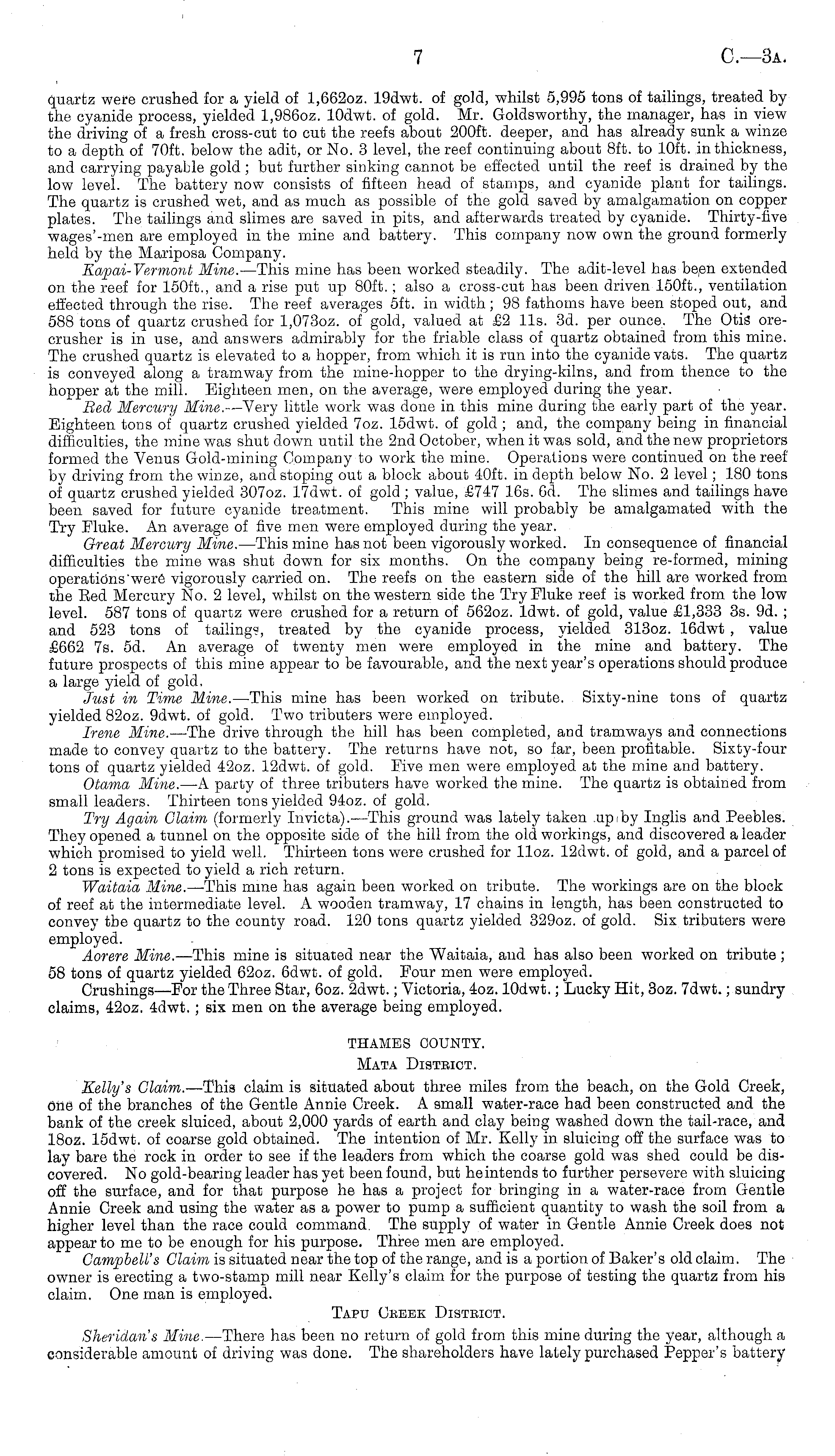 quartz were crushed for a yield of 1,6620z. 19dwt. of gold, whilst 5,995 tons of tailings, treated by the cyanide process, yielded 1,9860z. lOdwt. of gold. Mr. Goldsworthy, the manager, has in view the driving of a fresh cross-cut to cut the reefs about 200 ft. deeper, and has already sunk a winze to a depth of 70ft. below the adit, or No. 3 level, the reef continuing about Bft. to 10ft. in thickness, and carrying payable gold ; but further sinking cannot be effected until the reef is drained by the low level. The battery now consists of fifteen head of stamps, and cyanide plant for tailings. The quartz is crushed wet, and as much as possible of the gold saved by amalgamation on copper plates. The tailings and slimes are saved in pits, and afterwards treated by cyanide. Thirty-five wages-men are employed in the mine and battery. This company now own the ground formerly held by the Mariposa Company. Kapai-Vermord Mine. —This mine has been worked steadily. The adit-level has been extended on the reef for 150 ft., and a rise put up 80ft.; also a cross-cut has been driven 150 ft., ventilation effected through the rise. The reef averages sft. in width; 98 fathoms have been stoped out, and 588 tons of quartz crushed for 1,0730z. of gold, valued at £2 11s. 3d. per ounce. The Otis orecrusher is in use, and answers admirably for the friable class of quartz obtained from this mine. The crushed quartz is elevated to a hopper, from which it is run into the cyanide vats. The quartz is conveyed along a tramway from the mine-hopper to the drying-kilns, and from thence to the hopper at the mill. Eighteen men, on the average, were employed during the year. Bed Mercury Mine. —Very little work was done in this mine during the early part of the year. Eighteen tons of quartz crushed yielded 7oz. 15dwt. of gold ; and, the company being in financial difficulties, the mine was shutdown until the 2nd October, when it was sold, and the new proprietors formed the Venus Gold-mining Company to work the mine. Operations were continued on the reef by driving from the winze, andstoping out a block about 40ft. in depth below No. 2 level; 180 tons of quartz crushed yielded 3070z. 17dwt. of gold ; value, £747 16s. Ocl. The slimes and tailings have been saved for future cyanide treatment. This mine will probably be amalgamated with the Try Eluke. An average of five men were employed during the year. Great Mercury Mine. —This mine has not been vigorously worked. In consequence of financial difficulties the mine was shut down for six months. On the company being re-formed, mining operations'were vigorously carried on. The reefs on the eastern side of the hill are worked from the Eed Mercury No. 2 level, whilst on the western side the Try Fluke reef is worked from the low level. 587 tons of quartz were crushed for a return of 5620z. ldwt. of gold, value £1,333 3s. 9d. ; and 523 tons of tailing?, treated by the cyanide process, yielded 3130z. 16dwt , value £662 7s. sd. An average of twenty men were employed in the mine and battery. The future prospects of this mine appear to be favourable, and the next year's operations should produce a large yield of gold. Just in Time Mine. —This mine has been worked on tribute. Sixty-nine tons of quartz yielded 82oz. 9dwt. of gold. Two tributers were employed. Irene Mine. —The drive through the hill has been completed, and tramways and connections made to convey quartz to the battery. The returns have not, so far, been profitable. Sixty-four tons of quartz yielded 420z. 12dwt. of gold. Five men were employed at the mine and battery. Otama Mine. —A party of three tributers have worked the mine. The quartz is obtained from small leaders. Thirteen tons yielded 940z. of gold. Try Again Claim (formerly Invicta). —This ground was lately taken .upiby Inglis and Peebles. They opened a tunnel on the opposite side of the hill from the old workings, and discovered a leader which promised to yield well. Thirteen tons were crushed for lloz. 12dwt. of gold, and a parcel of 2 tons is expected to yield a rich return. Waitaia Mine. —This mine has again been worked on tribute. The workings are on the block of reef at the intermediate level. A wooden tramway, 17 chains in length, has been constructed to convey the quartz to the county road. 120 tons quartz yielded 3290z. of gold. Six tributers were employed. Aorere Mine. —This mine is situated near the Waitaia, and has also been worked on tribute ; 58 tons of quartz yielded 620z. 6dwt. of gold. Four men were employed. Crushings—For the Three Star, 6oz. 2dwt.; Victoria, 4oz. lOdwt. ; Lucky Hit, 3oz. 7dwt.; sundry claims, 420z. 4dwt.; six men on the average being employed. THAMES COUNTY. Mata District. Kelly's Claim. —This claim is situated about three miles from the beach, on the Gold Creek, One , of the branches of the Gentle Annie Creek. A small water-race had been constructed and the bank of the creek sluiced, about 2,000 yards of earth and clay being washed down the tail-race, and 18oz. 15dwt. of coarse gold obtained. The intention of Mr. Kelly in sluicing off the surface was to lay bare the rock in order to see if the leaders from which the coarse gold was shed could be discovered. No gold-bearing leader has yet been found, but he intends to further persevere with sluicing off the surface, and for that purpose he has a project for bringing in a water-race from Gentle Annie Creek and using the water as a power to pump a sufficient quantity to wash the soil from a higher level than the race could command. The supply of water in Gentle Annie Creek does not appear to me to be enough for his purpose. Three men are employed. Campbell's Claim is situated near the top of the range, and is a portion of Baker's old claim. The owner is erecting a two-stamp mill near Kelly's claim for the purpose of testing the quartz from his claim. One man is employed. Tapu Ckebk Disteict. Sheridan s Mine. —There has been no return of gold from this mine