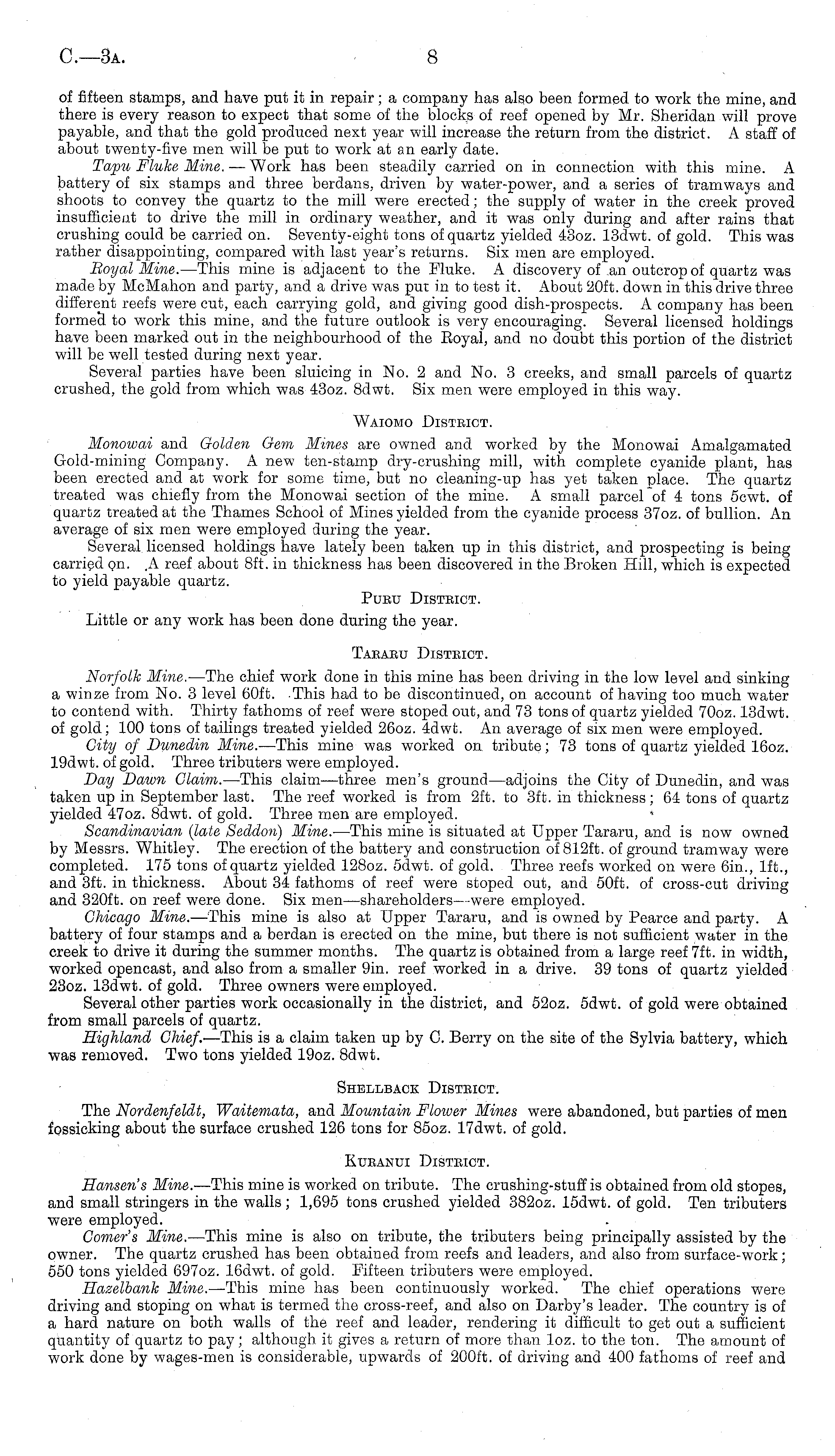 of fifteen stamps, and have put it in repair; a company has also been formed to work the mine, and there is every reason to expect that some of the blocks of reef opened by Mr. Sheridan will prove payable, and that the gold produced next year will increase the return from the district. A staff of about Dwerjty-five men will be put to work at an early date. Tapu Fluke Mine. — Work has been steadily carried on in connection with this mine. A battery of six stamps and three berdans, driven by water-power, and a series of tramways and shoots to convey the quartz to the mill were erected; the supply of water in the creek proved insufficient to drive the mill in ordinary weather, and it was only during and after rains that crushing could be carried on. Seventy-eight tons of quartz yielded 430z. 13dwt. of gold. This was rather disappointing, compared with last year's returns. Six men are employed. Royal Mine. —This mine is adjacent to the Fluke. A discovery of an outcrop of quartz was made by McMahon and party, and a drive was put in to test it. About SiOft. down in this drive three different reefs were cut, each carrying gold, and giving good dish-prospects. A company has been formed to work this mine, and the future outlook is very encouraging. Several licensed holdings have been marked out in the neighbourhood of the Eoyal, and no doubt this portion of the district will be well tested during next year. Several parties have been sluicing in No. 2 and No. 3 creeks, and small parcels of quartz crushed, the gold from which was 430z. Bdwt. Six men were employed in this way. Waiomo District. Monowai and Golden Gem Mines are owned and worked by the Monowai Amalgamated Gold-mining Company. A new ten-stamp dry-crushing mill, with complete cyanide plant, has been erected and at work for some time, but no cleaning-up has yet taken place. The quartz treated was chiefly from the Monowai section of the mine. A small parcel of 4 tons scwt. of quartz treated at the Thames School of Mines yielded from the cyanide process 370z. of bullion. An average of six men were employed during the year. Several licensed holdings have lately been taken up in this district, and prospecting is being carried on. .A reef about Bft. in thickness has been discovered in the Broken Hill, which is expected to yield payable quartz. Pueu District. Little or any work has been done during the year. Tababu Disteict. Norfolk Mine. —The chief work done in this mine has been driving in the low level and sinking a winze from No. 3 level 60ft. -This had to be discontinued, on account of having too much water to contend with. Thirty fathoms of reef were stoped out, and 73 tons of quartz yielded 70oz. 13dwt. of gold; 100 tons of tailings treated yielded 260z. 4dwfc. An average of six men were employed. City of Dunedin Mine. —This mine was worked on tribute; 73 tons of quartz yielded 16oz. 19dwt. of gold. Three tributers were employed. Day Dawn Claim. —This claim—three men's ground —adjoins the City of Dunedin, and was taken up in September last. The reef worked is from 2ft. to 3ft. in thickness; 64 tons of quartz yielded 470z. Bdwt. of gold. Three men are employed. Scandinavian (late Seddon) Mine. —This mine is situated at Upper Tararu, and is now owned by Messrs. Whitley. The erection of the battery and construction of 812 ft. of ground tramway were completed. 175 tons of quartz yielded 128oz. sdwt. of gold. Three reefs worked on were 6in., lft., and 3ft. in thickness. About 34 fathoms of reef were stoped out, and 50ft. of cross-cut driving and 320 ft. on reef were done. Six men—shareholders—were employed. Chicago Mine. —This mine is also at Upper Tararu, and is owned by Pearce and party. A battery of four stamps and a berdan is erected on the mine, but there is not sufficient water in the creek to drive it during the summer months. The quartz is obtained from a large reef 7ft. in width, worked opencast, and also from a smaller 9in. reef worked in a drive. 39 tons of quartz yielded 230z. 13dwt. of gold. Three owners were employed. Several other parties work occasionally in the district, and 520z. sdwt. of gold were obtained from small parcels of quartz. Highland Chief. —This is a claim taken up by C. Berry on the site of the Sylvia battery, which was removed. Two tons yielded 19oz. Bdwt. Shellback Disteict. The Nordenfeldt, Waitemata, and Mountain Flower Mines were abandoned, but parties of men fossicking about the surface crushed 126 tons for 85oz. 17dwt. of gold. KtiEANUi Disteict. Hansen's Mine.- —This mine is worked on tribute. The crushing-stuff is obtained from old stopes, and small stringers in the walls; 1,695 tons crushed yielded 3820z. 15dwt. of gold. Ten tributers were employed. Comer's Mine. —This mine is also on tribute, the tributers being principally assisted by the owner. The quartz crushed has been obtained from reefs and leaders, and also from surface-work; 550 tons yielded 6970z. 16dwt. of gold. Fifteen tributers were employed. Hazelbank Mine. —This mine has been continuously worked. The chief operations were driving and stoping on what is termed the cross-reef, and also on Darby's leader. The country is of a hard nature on both walls of the reef and leader, rendering it difficult to get out a sufficient quantity of quartz to pay; although it gives a return of more than loz. to the ton. The amount of work done by wages-men is considerable, upwards of 200 ft. of driving and 400 fathoms of reef and