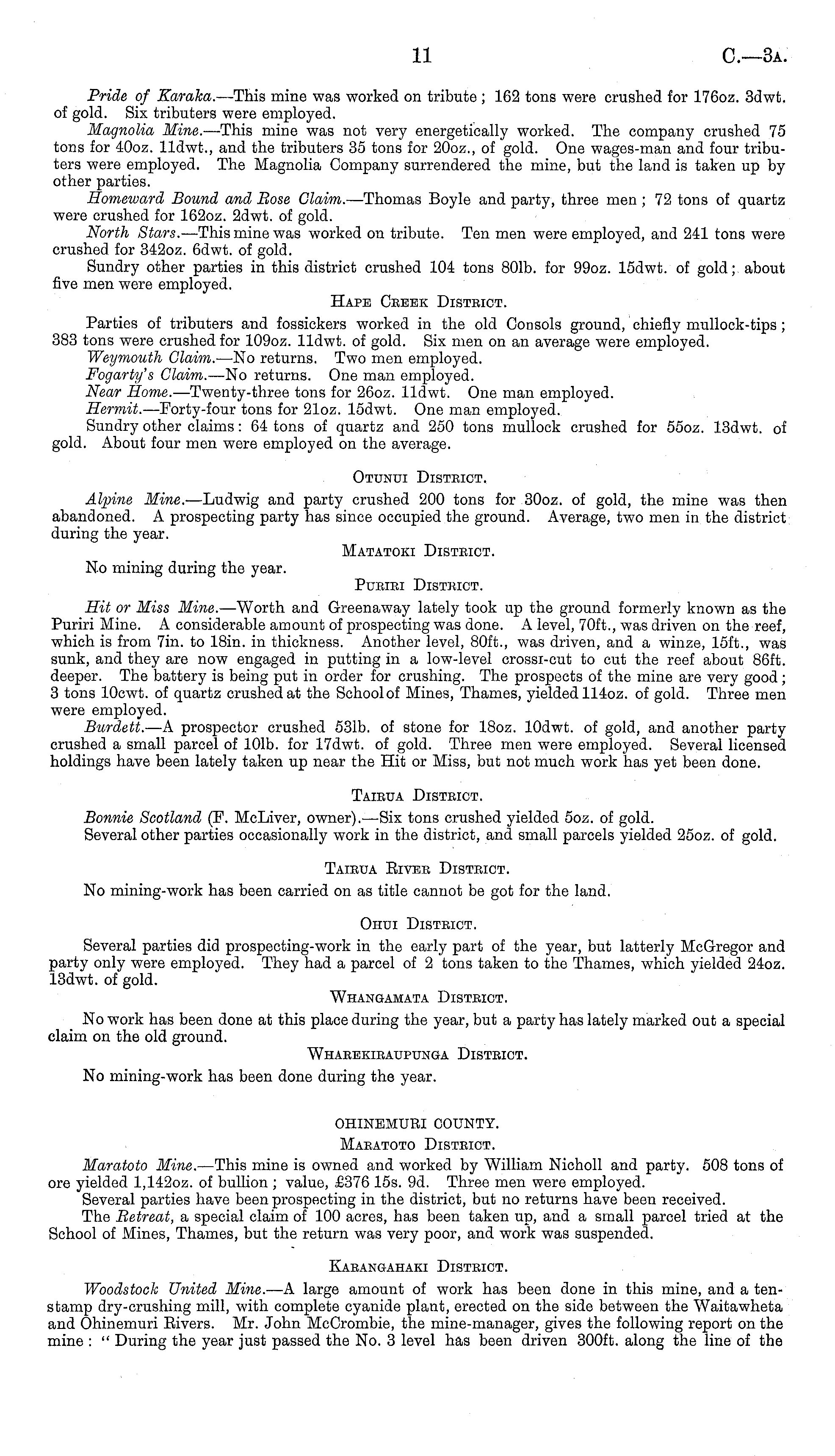 Pride of Karaka. —This mine was worked on tribute ; 162 tons were crushed for 1760z. 3dwt. of gold. Six tributers were employed. Magnolia Mine. —This mine was not very energetically worked. The company crushed 75 tons for 40oz. lldwt., and the tributers 35 tons for 200z., of gold. One wages-man and four tributers were employed. The Magnolia Company surrendered the mine, but the land is taken up by other parties. Homeivard Bound and Bose Claim. —Thomas Boyle and party, three men ; 72 tons of quartz were crushed for 1620z. 2dwt. of gold. North Stars. —This mine was worked on tribute. Ten men were employed, and 241 tons were crushed for 3420z. 6dwt. of gold. Sundry other parties in this district crushed 104 tons 801b. for 990z. 15dwt. of gold; about five men were employed. Hape Creek Distbict. Parties of tributers and fossickers worked in the old Coo sols ground, chiefly mullock-tips ; 383 tons were crushed for 109oz. lldwt. of gold. Six men on an average were employed. Weymouth Claim. —No returns. Two men employed. Fogarty's Claim. —No returns. One man employed. Near Home. —Twenty-three tons for 260z. lldwt. One man employed. Hermit. —Forty-four tons for 21oz. 15dwt. One man employed. Sundry other claims: 64 tons of quartz and 250 tons mullock crushed for 550z. 13dwt. of gold. About four men were employed on the average. Otunui Disteict. Alpine Mine. —Ludwig and party crushed 200 tons for 30oz. of gold, the mine was then abandoned. A prospecting party has since occupied the ground. Average, two men in the district during the year. Matatoki Disteict. No mining during the year. Pueiei District. Hit or Miss Mine. —Worth and Greenaway lately took up the ground formerly known as the Puriri Mine. A considerable amount of prospecting was done. A level, 70ft., was driven on the reef, which is from 7in. to 18in. in thickness. Another level, 80ft., was driven, and a winze, 15ft., was sunk, and they are now engaged in putting in a low-level crossi-cut to cut the reef about 86ft. deeper. The battery is being put in order for crushing. The prospects of the mine are very good; 3 tons lOcwt. of quartz crushed at the School of Mines, Thames, yielded 114oz. of gold. Three men were employed. Burdett. —A prospector crushed 531b. of stone for 18oz. lOdwt. of gold, and another party crushed a small parcel of 101b. for 17dwt. of gold. Three men were employed. Several licensed holdings have been lately taken up near the Hit or Miss, but not much work has yet been done. Tairua Disteict. Bonnie Scotland (P. McLiver, owner). —Six tons crushed yielded soz. of gold. Several other parties occasionally work in the district, and small parcels yielded 250z. of gold. Tairua Eiver District. No mining-work has been carried on as title cannot be got for the land. Ohdi District. Several parties did prospecting-work in the early part of the year, but latterly McGregor and party only were employed. They had a parcel of 2 tons taken to the Thames, which yielded 240z. 13dwt. of gold. Whangamata District. No work has been done at this place during the year, but a party has lately marked out a special claim on the old ground. Wharekiraupunga District. No mining-work has been done during the year. OHINEMURI COUNTY. Maratoto District. Maratoto Mine. —This mine is owned and worked by William Nicholl and party. 508 tons of ore yielded 1,1420z. of bullion ; value, £376 15s. 9d. Three men were employed. Several parties have been prospecting in the district, but no returns have been received. The Betreat, a special claim of 100 acres, has been taken up, and a small parcel tried at the School of Mines, Thames, but the return was very poor, and work was suspended. Karangahaki District. Woodstock United Mine. —A large amount of work has been done in this mine, and a tenstamp dry-crushing mill, with complete cyanide plant, erected on the side between the Waitawheta and Ohinemuri Eivers. Mr. John McCrombie, the mine-manager, gives the following report on the mine : " During the year just passed the No. 3 level has been driven 300 ft. along the line of the