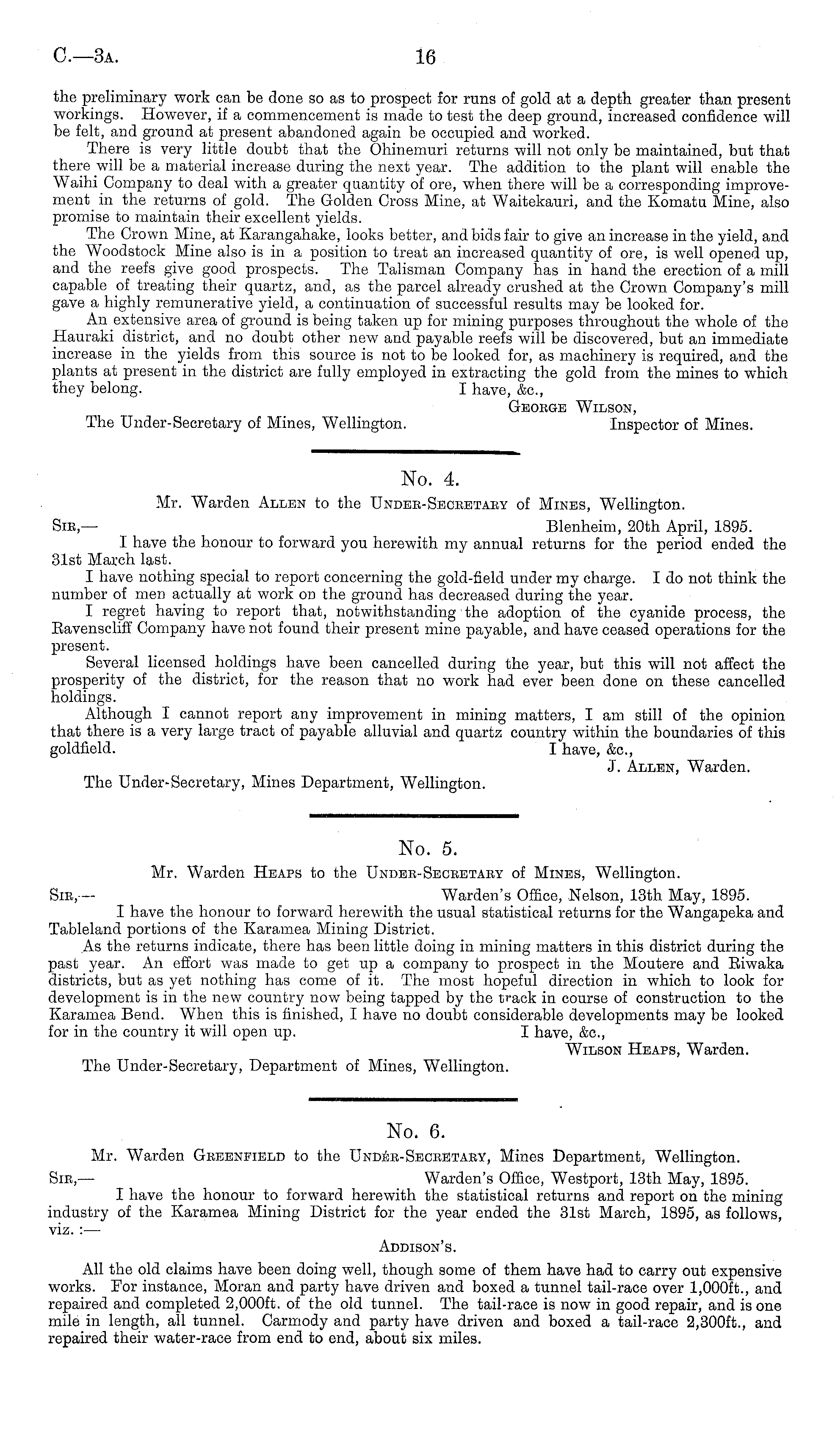 No. 6. Mr. Warden Greenfield to the Und£b-Secbetary, Mines Department, Wellington. Sic,— Warden's Office, Westport, 13th May, 1895. I have the honour to forward herewith the statistical returns and report on the mining industry of the Karamea Mining District for the year ended the 31st March, 1895, as follows, viz. :— Addison's. All the old claims have been doing well, though some of them have had to carry out expensive works. For instance, Moran and party have driven and boxed a tunnel tail-race over 1,000 ft., and repaired and completed 2,000 ft. of the old tunnel. The tail-race is now in good repair, and is one mile in length, all tunnel. Carmody and party have driven and boxed a tail-race 2,300 ft., and repaired their water-race from end to end, about six miles.