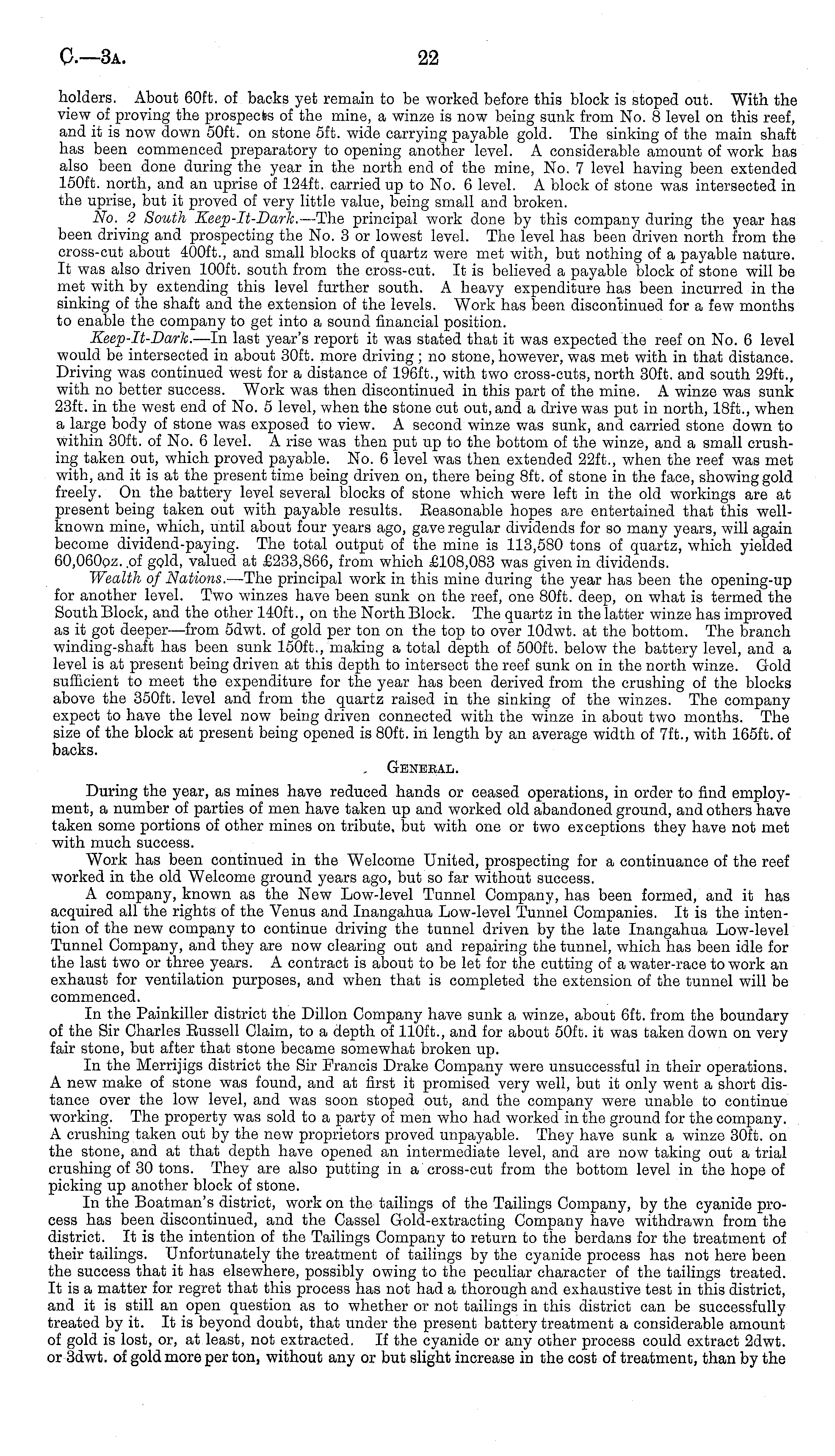 holders. About 60ft. of backs yet remain to be worked before this block is stoped out. With the view of proving the prospects of the mine, a winze is now being sunk from No. 8 level on this reef, and it is now down 50ft. on stone sft. wide carrying payable gold. The sinking of the main shaft has been commenced preparatory to opening another level. A considerable amount of work has also been done during the year in the north end of the mine, No. 7 level having been extended 150 ft. north, and an uprise of 124 ft. carried up to No. 6 level. A block of stone was intersected in the uprise, but it proved of very little value, being small and broken. No. 2 South Keep-It-Dark. —The principal work done by this company during the year has been driving and prospecting the No. 3or lowest level. The level has been driven north from the cross-cut about 400 ft., and small blocks of quartz were met with, but nothing of a payable nature. It was also driven 100 ft. south from the cross-cut. It is believed a payable block of stone will be met with by extending this level further south. A heavy expenditure has been incurred in the sinking of the shaft and the extension of the levels. Work has been discontinued for a few months to enable the company to get into a sound financial position. Keep-It-Dark. —ln last year's report it was stated that it was expected the reef on No. 6 level would be intersected in about 30ft. more driving ; no stone, however, was met with in that distance. Driving was continued west for a distance of 196 ft., with two cross-cuts, north 30ft. and south 29ft., with no better success. Work was then discontinued in this part of the mine. A winze was sunk 23ft. in the west end of No. 5 level, when the stone cut out, and a drive was put in north, 18ft., when a large body of stone was exposed to view. A second winze was sunk, and carried stone down to within 30ft. of No. 6 level. A rise was then put up to the bottom of the winze, and a small crushing taken out, which proved payable. No. 6 level was then extended 22ft., when the reef was met with, and it is at the present time being driven on, there being Bft. of stone in the face, showing gold freely. On the battery level several blocks of stone which were left in the old workings are at present being taken out with payable results. Eeasonable hopes are entertained that this wellknown mine, which, until about four years ago, gave regular dividends for so many years, will again become dividend-paying. The total output of the mine is 113,580 tons of quartz, which yielded 60,0600z. .of gold, valued at £233,866, from which £108,083 was given in dividends. Wealth of Nations. —The principal work in this mine during the year has been the opening-up for another level. Two winzes have been sunk on the reef, one 80ft. deep, on what is termed the South Block, and the other 140 ft., on the North Block. The quartz in the latter winze has improved as it got deeper —from sdwt. of gold per ton on the top to over lOdwt. at the bottom. The branch winding-shaft has been sunk 150 ft., making a total depth of 500 ft. below the battery level, and a level is at present being driven at this depth to intersect the reef sunk on in the north winze. Gold sufficient to meet the expenditure for the year has been derived from the crushing of the blocks above the 350 ft. level and from the quartz raised in the sinking of the winzes. The company expect to have the level now being driven connected with the winze in about two months. The size of the block at present being opened is 80ft. in length by an average width of 7ft., with 165 ft. of backs. General. During the year, as mines have reduced hands or ceased operations, in order to find employment, a number of parties of men have taken up and worked old abandoned ground, and others have taken some portions of other mines on tribute, but with one or two exceptions they have not met with much success. Work has been continued in the Welcome United, prospecting for a continuance of the reef worked in the old Welcome ground years ago, but so far without success. A company, known as the New Low-level Tunnel Company, has been formed, and it has acquired all the rights of the Venus and Inangahua Low-level Tunnel Companies. It is the intention of the new company to continue driving the tunnel driven by the late Inangahua Low-level Tunnel Company, and they are now clearing out and repairing the tunnel, which has been idle for the last two or three years. A contract is about to be let for the cutting of a water-race to work an exhaust for ventilation purposes, and when that is completed the extension of the tunnel will be commenced. In the Painkiller district the Dillon Company have sunk a winze, about 6ft. from the boundary of the Sir Charles Eussell Claim, to a depth of 110 ft., and for about 50ft. it was taken down on very fair stone, but after that stone became somewhat broken up. In the Merrijigs district the Sir Francis Drake Company were unsuccessful in their operations. A new make of stone was found, and at first it promised very well, but it only went a short distance over the low level, and was soon stoped out, and the company were unable to continue working. The property was sold to a party of men who had worked in the ground for the company. A crushing taken out by the new proprietors proved unpayable. They have sunk a winze 30ft. on the stone, and at that depth have opened an intermediate level, and are now taking out a trial crushing of 30 tons. They are also putting in a cross-cut from the bottom level in the hope of picking up another block of stone. In the Boatman's district, work on the tailings of the Tailings Company, by the cyanide process has been discontinued, and the Cassel Gold-extracting Company have withdrawn from the district. It is the intention of the Tailings Company to return to the berdans for the treatment of their tailings. Unfortunately the treatment of tailings by the cyanide process 