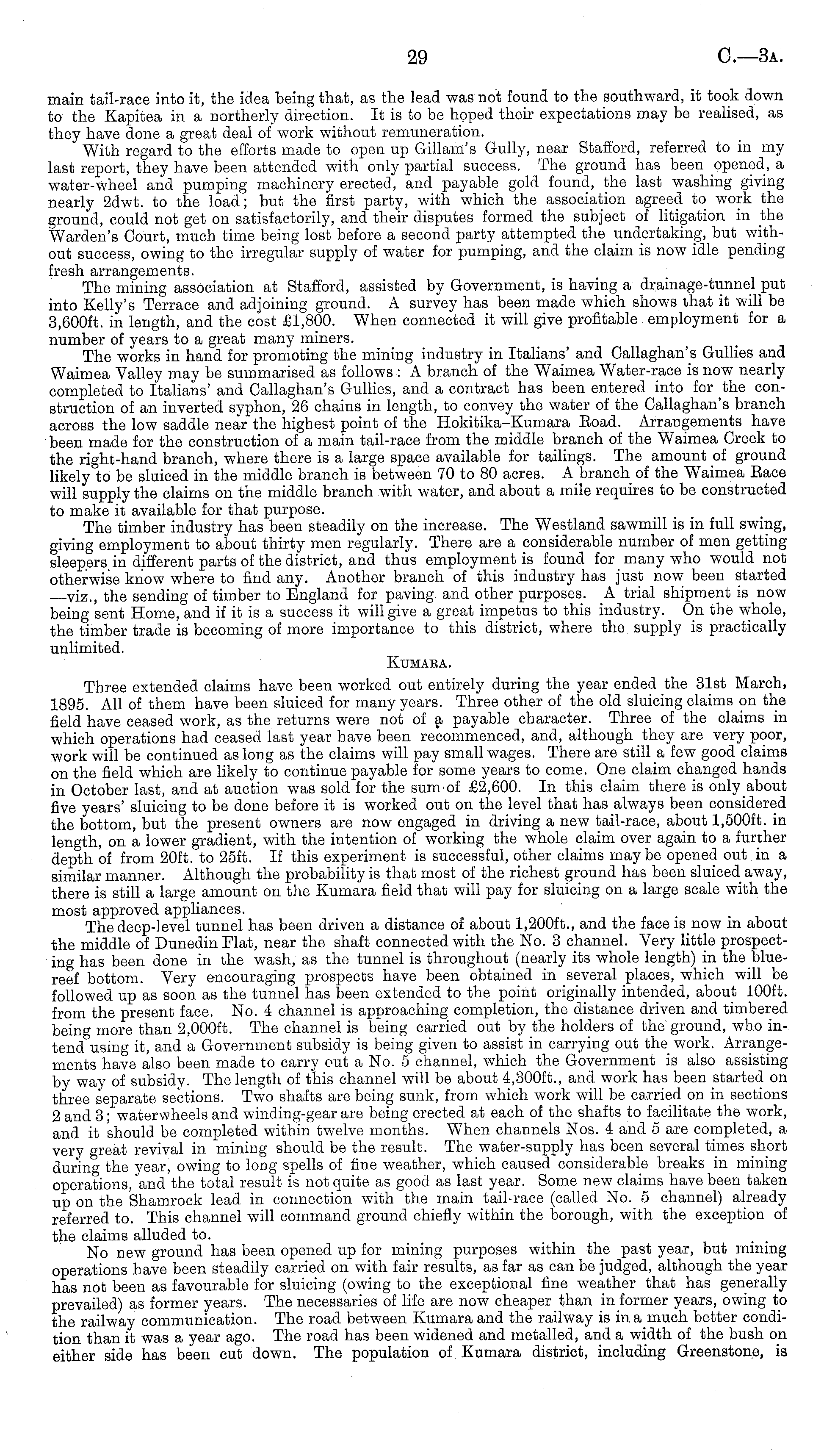 main tail-race into it, the idea being that, as the lead was not found to the southward, it took down to the Kapitea in a northerly direction. It is to be hoped their expectations may be realised, as they have done a great deal of work without remuneration. With regard to the efforts made to open up Gillam's Gully, near Stafford, referred to in my last report, they have been attended with only partial success. The ground has been opened, a water-wheel and pumping machinery erected, and payable gold found, the last washing giving nearly 2dwt. to the load; but the first party, with which the association agreed to work the ground, could not get on satisfactorily, and their disputes formed the subject of litigation in the Warden's Court, much time being lost before a second party attempted the undertaking, but without success, owing to the irregular supply of water for pumping, and the claim is now idle pending fresh arrangements. The mining association at Stafford, assisted by Government, is having a drainage-tunnel put into Kelly's Terrace and adjoining ground. A survey has been made which shows that it will be 3,600 ft. in length, and the cost £1,800. When connected it will give profitable employment for a number of years to a great many miners. The works in hand for promoting the mining industry in Italians' and Callaghan's Gullies and Waimea Valley may be summarised as follows : A branch of the Waimea Water-race is now nearly completed to Italians' and Callaghan's Gullies, and a contract has been entered into for the construction of an inverted syphon, 26 chains in length, to convey the water of the Callaghan's branch across the low saddle near the highest point of the Hokitika-Kumara Eoad. Arrangements have been made for the construction of a main tail-race from the middle branch of the Waimea Creek to the right-hand branch, where there is a large space available for tailings. The amount of ground likely to be sluiced in the middle branch is between 70 to 80 acres. A branch of the Waimea Eace will supply the claims on the middle branch with water, and about a mile requires to be constructed to make it available for that purpose. The timber industry has been steadily on the increase. The Westland sawmill is in full swing, giving employment to about thirty men regularly. There are a considerable number of men getting sleepers in different parts of the district, and thus employment is found for many who would not otherwise know where to find any. Another branch of this industry has just now been started vi Zi! the sending of timber to England for paving and other purposes. A trial shipment is now being sent Home, and if it is a success it will give a great impetus to this industry. On the whole, the timber trade is becoming of more importance to this district, where the supply is practically unlimited. Kumaba. Three extended claims have been worked out entirely during the year ended the 31st March, 1895. All of them have been sluiced for many years. Three other of the old sluicing claims on the field have ceased work, as the returns were not of a payable character. Three of the claims in which operations had ceased last year have been recommenced, and, although they are very poor, work will be continued as long as the claims will pay small wages. There are still a few good claims on the field which are likely to continue payable for some years to come. One claim changed hands in October last, and at auction was sold for the sum of £2,600. In this claim there is onlyabout five years' sluicing to be done before it is worked out on the level that has always been considered the bottom, but the present owners are now engaged in driving a new tail-race, about 1,500 ft. in length, on a lower gradient, with the intention of working the whole claim over again to a further derjth of from 20ft. to 25ft. If this experiment is successful, other claims maybe opened out in a similar manner. Although the probability is that most of the richest ground has been sluiced away, there is still a large amount on the Kumara field that will pay for sluicing on a large scale with the most approved appliances. The deep-level tunnel has been driven a distance of about 1,200 ft., and the face is now in about the middle of Dunedin Mat, near the shaft connected with the No. 3 channel. Very little prospecting has been done in the wash, as the tunnel is throughout (nearly its whole length) in the bluereef bottom. Very encouraging prospects have been obtained in several places, which will be followed up as soon as the tunnel has been extended to the point originally intended, about 100 ft. from the present face. No. 4 channel is approaching completion, the distance driven and timbered being more than 2,000 ft. The channel is being carried out by the holders of the ground, who intend using it, and a Government subsidy is being given to assist in carrying out the work. Arrangements have also been made to carry out a No. 5 channel, which the Government is also assisting by way of subsidy. The length of this channel will be about 4,300 ft., and work has been started on three separate sections. Two shafts are being sunk, from which work will be carried on in sections 2 and 3; waterwheels and winding-gear are being erected at each of the shafts to facilitate the work, and it should be completed within twelve months. When channels Nos. 4 and 5 are completed, a very great revival in mining should be the result. The water-supply has been several times short durino- the year, owing to long spells of fine weather, which caused considerable breaks in mining operations, and the total result is not quite as good as last year. Some new claims have been taken up on the Shamrock lead in connection with the main tail-race (called No. 5 channel) already referred to. This channel will command ground chiefly within the borough, with the exception of the claims alluded to. No new ground has been opened up for mining purposes within the past 