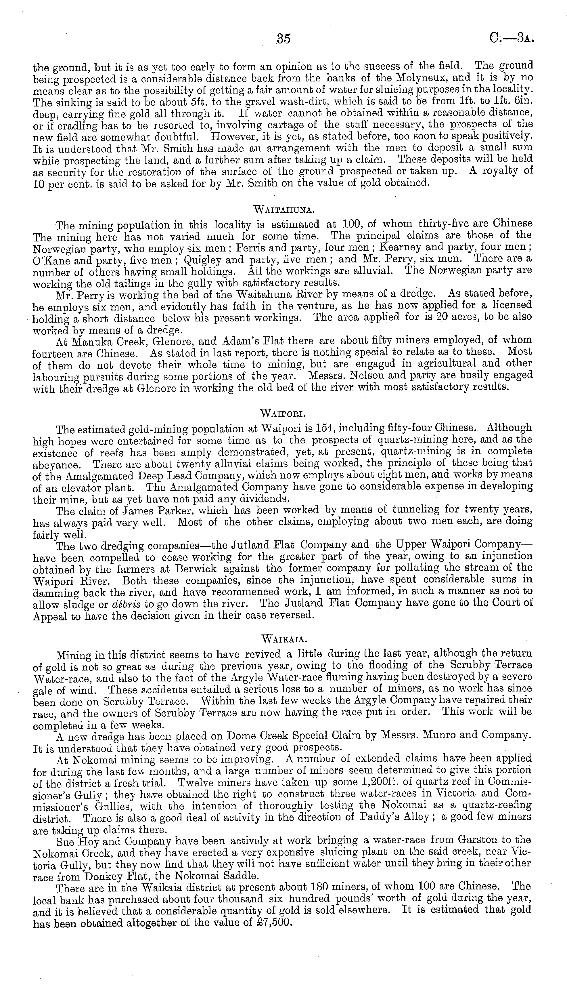the ground, but it is as yet too early to form an opinion as to the success of the field. The ground being prospected is a considerable distance back from the banks of the Molyneux, and it is by no means clear as to the possibility of getting a fair amount of water for sluicing purposes in the locality. The sinking is said to be about sft. to the gravel wash-dirt, which is said to be from lft. to lft. 6in. deep, carrying fine gold all through it. If water cannot be obtained within a reasonable distance, or if cradling has to be resorted to, involving cartage of the stuff necessary, the prospects of the new field are somewhat doubtful. However, it is yet, as stated before, too soon to speak positively. It is understood that Mr. Smith has made an arrangement with the men to deposit a small sum while prospecting the land, and a further sum after taking up a claim. These deposits will be held as security for the restoration of the surface of the ground prospected or taken up. A royalty of 10 per cent, is said to be asked for by Mr. Smith on the value of gold obtained. Waitahtjna. The mining population in this locality is estimated at 100, of whom thirty-five are Chinese The mining here has not varied much for some time. The principal claims are those of the Norwegian party, who employ six men; Ferris and party, four men ; Kearney and party, four men; O'Kane and party, five men; Quigley and party, five men; and Mr. Perry, six men. _ There are a number of others having small holdings. All the workings are alluvial. The Norwegian party are working the old tailings in the gully with satisfactory results. Mr. Perry is working the bed of the "Waitahuna Eiver by means of a dredge. As stated before, he employs six men, and evidently has faith in the venture, as he has now applied for a licensed holding a short distance below his present workings. The area applied for is 20 acres, to be also worked by means of a dredge. At Manuka Creek, Glenore, and Adam's Flat there are about fifty miners employed, of whom fourteen are Chinese. As stated, in last report, there is nothing special to relate as to these. Most of them do not devote their whole time to mining, but are engaged in agricultural _ and other labouring pursuits during some portions of the year. Messrs. Nelson and party are busily engaged with their dredge at Glenore in working the old bed of the river with most satisfactory results. Waipoei. The estimated gold-mining population at Waipori is 154, including fifty-four Chinese. Although high hopes were entertained for some time as to the prospects of quartz-mining here, and as the existence of reefs has been amply demonstrated, yet, at present, quartz-mining is in complete abeyance. There are about twenty alluvial claims being worked, the principle of these being that of the Amalgamated Deep Lead Company, which now employs about eight men, and works by means of an elevator plant. The Amalgamated Company have gone to considerable expense in developing their mine, but as yet have not paid any dividends. The claim of James Parker, which has been worked by means of tunneling for twenty years, has always paid very well. Most of the other claims, employing about two men each, are doing fairly well. The two dredging companies—the Jutland Flat Company and the Upper Waipori Companyhave been compelled to cease working for the greater part of the year, owing to an injunction obtained by the farmers at Berwick against the former company for polluting the stream of the Waipori Eiver. Both these companies, since the injunction, have spent considerable sums in damming back the river, and have recommenced work, I am informed, in such a manner as not to allow sludge or debris to go down the river. The Jutland Flat Company have gone to the Court of Appeal to have the decision given in their case reversed. Waikaia. Mining in this district seems to have revived a little during the last year, although the return of gold is not so great as during the previous year, owing to the flooding of the Scrubby Terrace Water-race, and also to the fact of the Argyle Water-race framing having been destroyed by a severe gale of wind. These accidents entailed a serious loss to a number of miners, as no work has since been done on Scrubby Terrace. Within the last few weeks the Argyle Company have repaired their race, and the owners of Scrubby Terrace are now having the race put in order. This work will be completed in a few weeks. A new dredge has been placed on Dome Creek Special Claim by Messrs. Munro and Company. It is understood that they have obtained very good prospects. At Nokomai mining seems to be improving. A number of extended claims have been applied for during the last few months, and a large number of miners seem determined to give this portion of the district a fresh trial. Twelve miners have taken up some 1,200 ft. of quartz reef in Commissioner's Gully ; they have obtained the right to construct three water-races in Victoria and Commissioner's Gullies, with the intention of thoroughly testing the Nokomai as a quartz-reefing district. There is also a good deal of activity in the direction of Paddy's Alley ; a good few miners are taking up claims there. Sue Hoy and Company have been actively at work bringing a water-race from Garston to the Nokomai Creek, and they have erected a very expensive sluicing plant on the said creek, near Victoria Gully, but they now find that they will not have snfficient water until they bring in their other race from Donkey Flat, the Nokomai Saddle. There are in the Waikaia district at present about 180 miners, of whom 100 are Chinese. The local bank has purchased about four thousand six hundred pounds' worth of gold during the year, and it is believed that a considerable quantity of gold is sold elsewhere. It is estimated that gold has been obtained altogether of the value of £7,500.