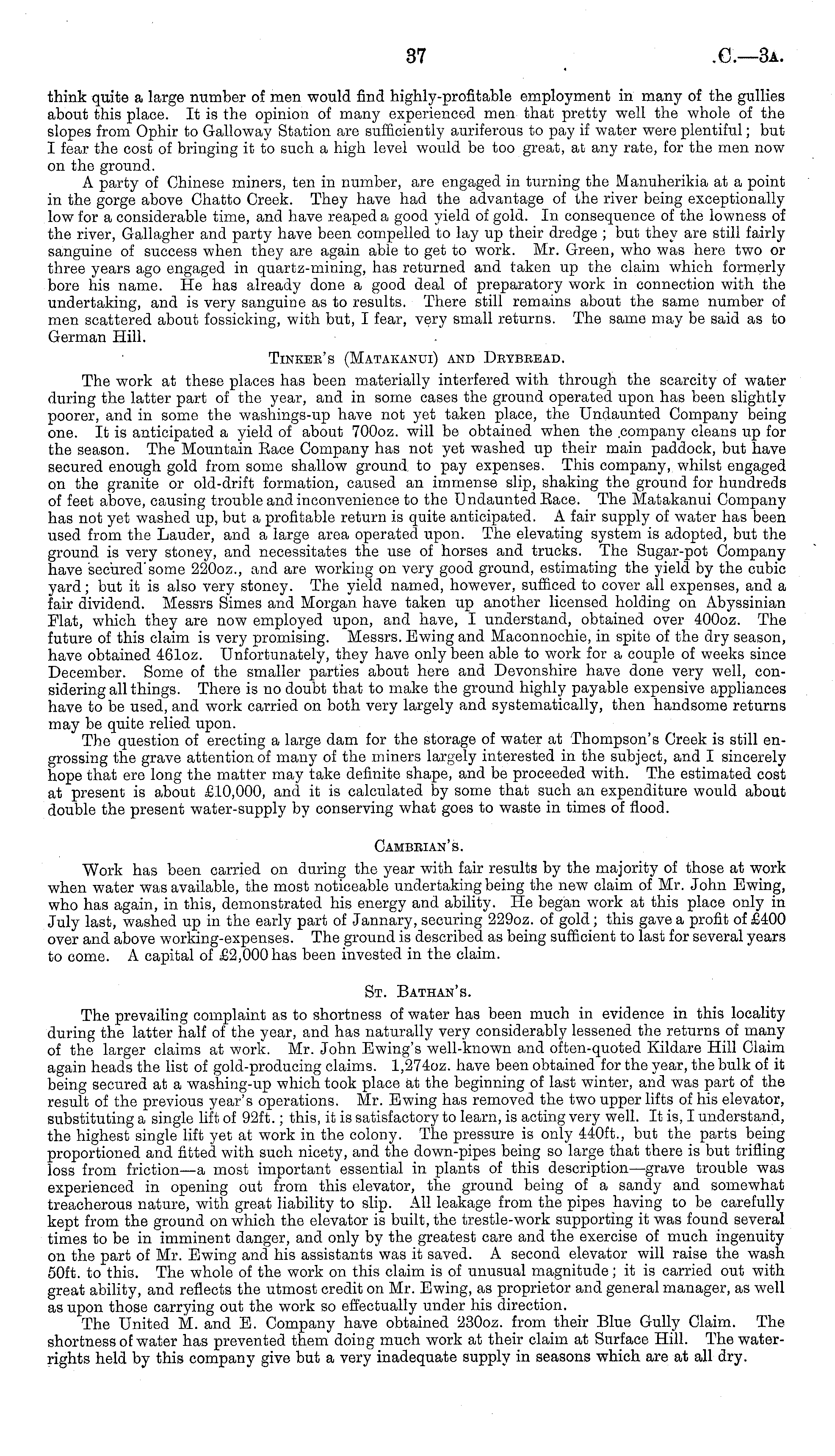 think quite a large number of men would find highly-profitable employment in many of the gullies about this place. It is the opinion of many experienced men that pretty well the whole of the slopes from Ophir to Galloway Station are sufficiently auriferous to pay if water were plentiful; but I fear the cost of bringing it to such a high level would be too great, at any rate, for the men now on the ground. A party of Chinese miners, ten in number, are engaged in turning the Manuherikia at a point in the gorge above Chatto Creek. They have had the advantage of the river being exceptionally low for a considerable time, and have reaped a good yield of gold. In consequence of the lowness of the river, Gallagher and party have been compelled to lay up their dredge ; but they are still fairly sanguine of success when they are again able to get to work. Mr. Green, who was here two or three years ago engaged in quartz-mining, has returned and taken up the claim which formerly bore his name. He has already done a good deal of preparatory work in connection with the undertaking, and is very sanguine as to results. There still remains about the same number of men scattered about fossicking, with but, I fear, very small returns. The same may be said as to German Hill. Tinkbe's (Matakanui) and Drybkead. The work at these places has been materially interfered with through the scarcity of water during the latter part of the year, and in some cases the ground operated upon has been slightly poorer, and in some the washings-up have not yet taken place, the Undaunted Company being one. It is anticipated a yield of about 700oz. will be obtained when the .company cleans up for the season. The Mountain Eace Company has not yet washed up their main paddock, but have secured enough gold from some shallow ground to pay expenses. This company, whilst engaged on the granite or old-drift formation, caused an immense slip, shaking the ground for hundreds of feet above, causing trouble and inconvenience to the Undaunted Eace. The Matakanui Company has not yet washed up, but a profitable return is quite anticipated. A fair supply of water has been used from the Lauder, and a large area operated upon. The elevating system is adopted, but the ground is very stoney, and necessitates the use of horses and trucks. The Sugar-pot Company have secured'some 2200z., and are working on very good ground, estimating the yield by the cubic yard; but it is also very stoney. The yield named, however, sufficed to cover all expenses, and a fair dividend. Messrs Simes and Morgan have taken up another licensed holding on Abyssinian Flat, which they are now employed upon, and have, I understand, obtained over 400oz. The future of this claim is very promising. Messrs. Ewing and Maconnochie, in spite of the dry season, have obtained 4610z. Unfortunately, they have only been able to work for a couple of weeks since December. Some of the smaller parties about here and Devonshire have done very well, considering all things. There is no doubt that to make the ground highly payable expensive appliances have to be used, and work carried on both very largely and systematically, then handsome returns may be quite relied upon. The question of erecting a large dam for the storage of water at Thompson's Creek is still engrossing the grave attention of many of the miners largely interested in the subject, and I sincerely hope that ere long the matter may take definite shape, and be proceeded with. The estimated cost at present is a.bout £10,000, and it is calculated by some that such an expenditure would about double the present water-supply by conserving what goes to waste in times of flood. Cambeian's. Work has been carried on during the year with fair results by the majority of those at work when water was available, the most noticeable undertaking being the new claim of Mr. John Ewing, who has again, in this, demonstrated his energy and ability. He began work at this place only in July last, washed up in the early part of Jannary, securing 2290z. of gold; this gave a profit of £400 over and above working-expenses. The ground is described as being sufficient to last for several years to come. A capital of £2,000 has been invested in the claim. St. Bathan's. The prevailing complaint as to shortness of water has been much in evidence in this locality during the latter half of the year, and has naturally very considerably lessened the returns of many of the larger claims at work. Mr. John Ewing's well-known and often-quoted Kildare Hill Claim again heads the list of gold-producing claims. 1,2740z. have been obtained for the year, the bulk of it being secured at a washing-up which took place at the beginning of last winter, and was part of the result of the previous year's operations. Mr. Ewing has removed the two upper lifts of his elevator, substituting a single lift of 92ft.; this, it is satisfactory to learn, is acting very well. It is, I understand, the highest single lift yet at work in the colony. The pressure is only 440 ft., but the parts being proportioned and fitted with such nicety, and the down-pipes being so large that there is but trifling loss from friction—a most important essential in plants of this description —grave trouble was experienced in opening out from this elevator, the ground being of a sandy and somewhat treacherous nature, with great liability to slip. All leakage from the pipes having to be carefully kept from the ground on which the elevator is built, the trestle-work supporting it was found several times to be in imminent danger, and only by the greatest care and the exercise of much ingenuity on the part of Mr. Ewing and his assistants was it saved. A second elevator will raise the wash 50ft. to this. The whole of the work on this claim is of unusual magnitude; it is carried out with great ability, and reflects the utmost credit on Mr. Ewing, as proprietor and general manager, as well as upon those carrying out 