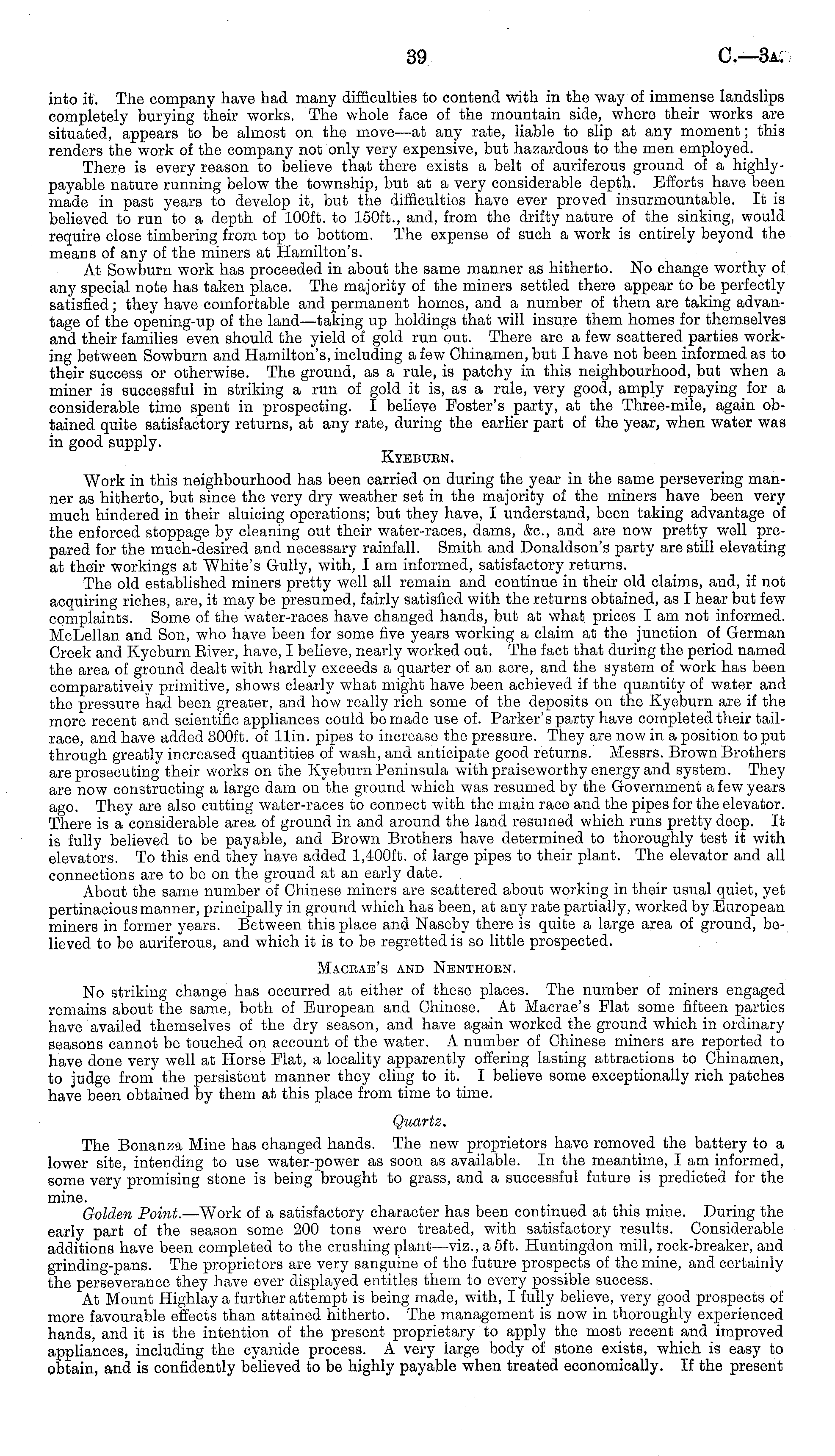 into it. The company have had many difficulties to contend with in the way of immense landslips completely burying their works. The whole face of the mountain side, where their works are situated, appears to be almost on the move—at any rate, liable to slip at any moment; this renders the work of the company not only very expensive, but hazardous to the men employed. There is every reason to believe that there exists a belt of auriferous ground of a highlypayable nature running below the township, but at a very considerable depth. Efforts have been made in past years to develop it, but the difficulties have ever proved insurmountable. It is believed to run to a depth of 100 ft. to 150 ft., and, from the drifty nature of the sinking, would require close timbering from top to bottom. The expense of such a work is entirely beyond the means of any of the miners at Hamilton's. At Sowburn work has proceeded in about the same manner as hitherto. No change worthy of any special note has taken place. The majority of the miners settled there appear to be perfectly satisfied; they have comfortable and permanent homes, and a number of them are taking advantage of the opening-up of the land—taking up holdings that will insure them homes for themselves and their families even should the yield of gold run out. There are a few scattered parties working between Sowburn and Hamilton's, including a few Chinamen, but I have not been informed as to their success or otherwise. The ground, as a rule, is patchy in this neighbourhood, but when a miner is successful in striking a run of gold it is, as a rule, very good, amply repaying for a considerable time spent in prospecting. I believe Poster's party, at the Three-mile, again obtained quite satisfactory returns, at any rate, during the earlier part of the year, when water was in good supply. Kybbuen. Work in this neighbourhood has been carried on during the year in the same persevering manner as hitherto, but since the very dry weather set in the majority of the miners have been very much hindered in their sluicing operations; but they have, I understand, been taking advantage of the enforced stoppage by cleaning out their water-races, dams, &c, and are now pretty well prepared for the much-desired and necessary rainfall. Smith and Donaldson's party are still elevating at their workings at White's Gully, with, I am informed, satisfactory returns. The old established miners pretty well all remain and continue in their old claims, and, if not acquiring riches, are, it may be presumed, fairly satisfied with the returns obtained, as I hear but few complaints. Some of the water-races have changed hands, but at what, prices lam not informed. McLellan and Son, who have been for some five years working a claim at the junction of German Creek and Kyeburn Kiver, have, I believe, nearly worked out. The fact that during the period named the area of ground dealt with hardly exceeds a quarter of an acre, and the system of work has been comparatively primitive, shows clearly what might have been achieved if the quantity of water and the pressure had been greater, and how really rich some of the deposits on the Kyeburn are if the more recent and scientific appliances could be made use of. Parker's party have completed their tailrace, and have added 300 ft. of llin. pipes to increase the pressure. They are now in a position to put through greatly increased quantities of wash, and anticipate good returns. Messrs. Brown Brothers are prosecuting their works on the Kyeburn Peninsula with praiseworthy energy and system. They are now constructing a large dam on the ground which was resumed by the Government a few years ago. They are also cutting water-races to connect with the main race and the pipes for the elevator. There is a considerable area of ground in and around the land resumed which runs pretty deep. It is fully believed to be payable, and Brown Brothers have determined to thoroughly test it with elevators. To this end they have added 1,400 ft. of large pipes to their plant. The elevator and all connections are to be on the ground at an early date. About the same number of Chinese miners are scattered about working in their usual quiet, yet pertinacious manner, principally in ground which has been, at any rate partially, worked by European miners in former years. Between this place and Naseby there is quite a large area of ground, believed to be auriferous, and which it is to be regretted is so little prospected. Maceab's and Nenthorn. No striking change has occurred at either of these places. The number of miners engaged remains about the same, both of European and Chinese. At Macrae's Flat some fifteen parties have availed themselves of the dry season, and have again worked the ground which in ordinary seasons cannot be touched on account of the water. A number of Chinese miners are reported to have done very well at Horse Hat, a locality apparently offering lasting attractions to Chinamen, to judge from the persistent manner they cling to it. I believe some exceptionally rich patches have been obtained by them at this place from time to time. Quartz. The Bonanza Mine has changed hands. The new proprietors have removed the battery to a lower site, intending to use water-power as soon as available. In the meantime, lam informed, some very promising stone is being brought to grass, and a successful future is predicted for the mine. Golden Point. —Work of a satisfactory character has been continued at this mine. During the early part of the season some 200 tons were treated, with satisfactory results. Considerable additions have been completed to the crushing plant —viz., a sft. Huntingdon mill, rock-breaker, and grinding-pans. The proprietors are very sanguine of the future prospects of the mine, and certainly the perseverance they have ever displayed entitles them to every possible success. At Mount Highlay a further attempt is being made, with, I fully believe, 