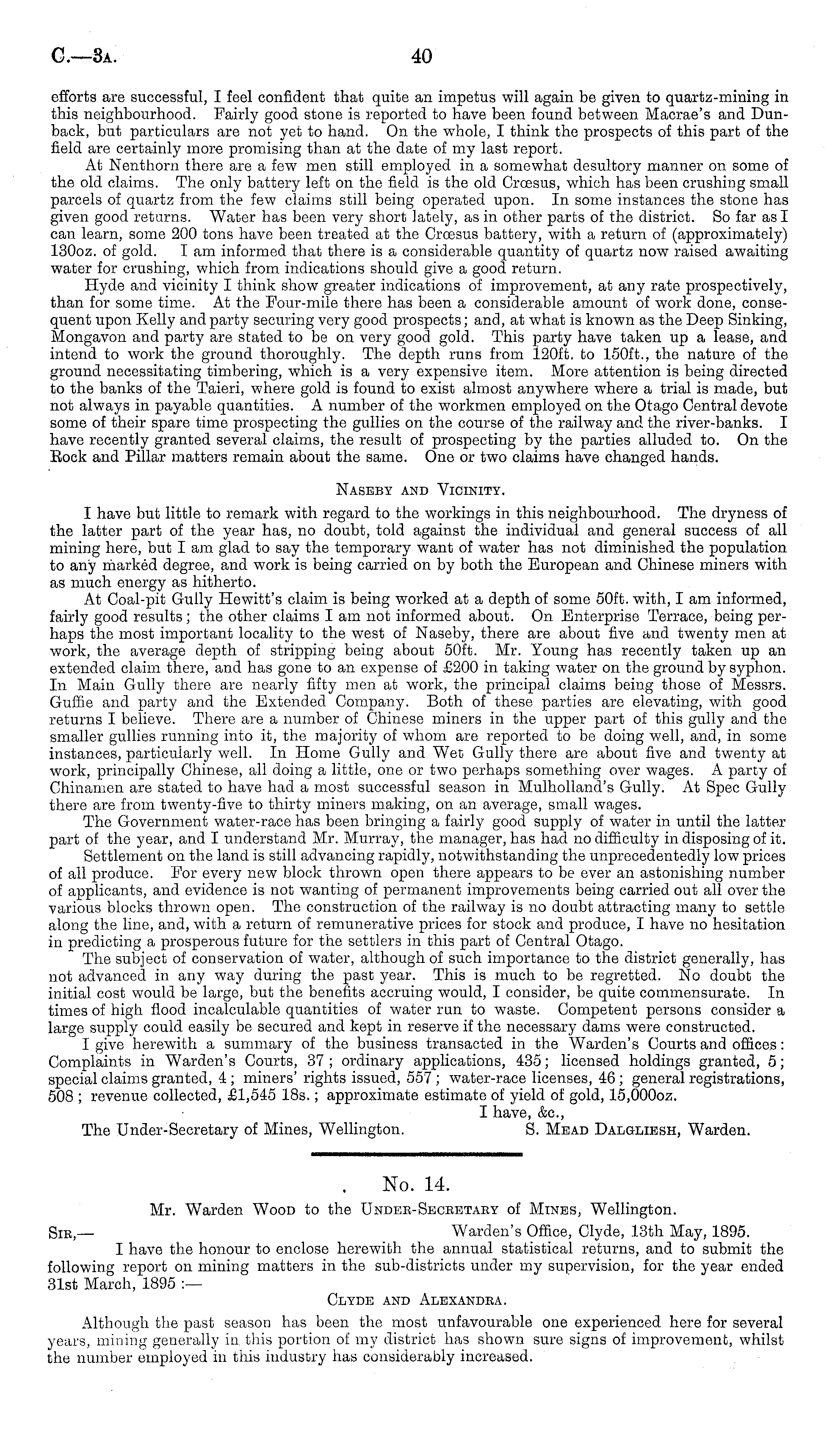 No. 14. Mr. Warden Wood to the Undeb-Secbetaby of Mines, Wellington. Sir,— Warden's Office, Clyde, 13th May, 1895. I have the honour to enclose herewith the annual statistical returns, and to submit the following report on mining matters in the sub-districts under my supervision, for the year ended 31st March, 1895 :— " Clyde and Alexandea. Although the past season has been the most unfavourable one experienced here for several years, mining generally in this portion of my district has shown sure signs of improvement, whilst the number employed in this industry has considerably increased.