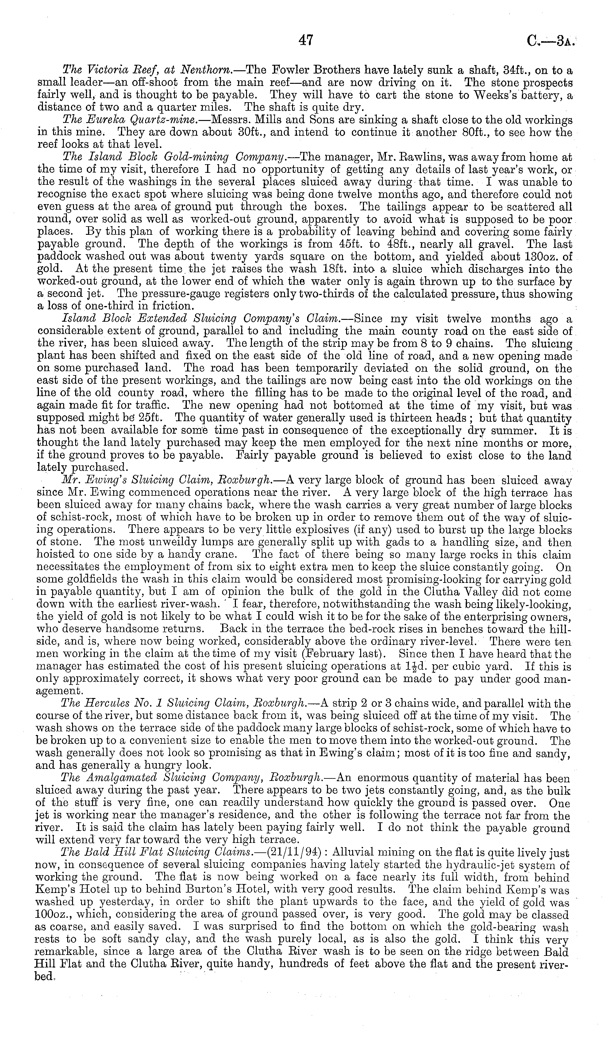 The Victoria Beef, at Nenthorn. —The Fowler Brothers have lately sunk a shaft, 34ft., on to a small leader—an off-shoot from the main reef—and are now driving on it. The stone proscects fairly well, and is thought to be payable. They will have to cart the stone to Weeks's battery, a distance of two and a quarter miles. The shaft is quite dry. The Eureka Quartz-mine. —Messrs. Mills and Sons are sinking a shaft close to the old workings in this mine. They are down about 30ft., and intend to continue it another 80ft., to see how the reef looks at that level. The Island Block Gold-mining Company. —The manager, Mr. Eawlins, was away from home at the time of my visit, therefore I had no opportunity of getting any details of last year's work, or the result of the washings in the several places sluiced away during that time. I was unable to recognise the exact spot where sluicing was being done twelve months ago, and therefore could not even guess at the area of ground put through the boxes. The tailings appear to be scattered all round, over solid as well as worked-out ground, apparently to avoid what is supposed to be poor places. By this plan of working there is a probability of leaving behind and covering some fairly payable ground. The depth of the workings is from 45ft. to 48ft., nearly all gravel. The last paddock washed out was about twenty yards square on the bottom, and yielded about 130oz. of gold. At the present time the jet raises the wash 18ft. into a sluice which discharges into the worked-out ground, at the lower end of which the water only is again thrown up to the surface by a second jet. The pressure-gauge registers only two-thirds of the calculated pressure, thus showing a loss of one-third in friction. Island Block Extended Sluicing Company's Claim. —Since my visit twelve months ago a considerable extent of ground, parallel to and including the main county road on the east side of the river, has been sluiced away. The length of the strip may be from Bto 9 chains. The sluicing plant has been shifted and fixed on the east side of the old line of road, and a new opening made on some purchased land. The road has been temporarily deviated on the solid ground, on the east side of the present workings, and the tailings are now being cast into the old workings on the line of the old county road, where the filling has to be made to the original level of the road, and again made fit for traffic. The new opening had not bottomed at the time of my visit, but was supposed might be' 25ft. The quantity of water generally used is thirteen heads ; but that quantity has not been available for some time past in consequence of the exceptionally dry summer. It is thought the land lately purchased may keep the men employed for the next nine months or more, if the ground proves to be payable. Fairly payable ground is believed to exist close to the land lately purchased. Mr. Ewing's Sluicing Claim, Boxburgh. —A very large block of ground has been sluiced away since Mr. Ewing commenced operations near the river. A very large block of the high terrace has been sluiced away for many chains back, where the wash carries a very great number of large blocks of schist-rock, most of which have to be broken up in order to remove them out of the way of sluicing operations. There appears to be very little explosives (if any) used to burst up the large blocks of stone. The most unweildy lumps are generally split up with gads to a handling size, and then hoisted to one side by a handy crane. The fact of there being so many large rocks in this claim necessitates the employment of from six to eight extra men to keep the sluice constantly going. On some goldfields the wash in this claim would be considered most promising-looking for carrying gold in payable quantity, but I am of opinion the bulk of the gold in the Clutha Valley did not come down with the earliest river-wash. ' I fear, therefore, notwithstanding the wash being likely-looking, the yield of gold is not likely to be what I could wish it to be for the sake of the enterprising owners, who deserve handsome returns. Back in the terrace the bed-rock rises in benches toward the hillside, and is, where now being worked, considerably above the ordinary river-level. There were ten men working in the claim at the time of my visit (February last). Since then I have heard that the manager has estimated the cost of his present sluicing operations at 1-J-d. per cubic yard. If this is only approximately correct, it shows what very poor ground can be made to pay under good management. The Hercules No. 1 Sluicing Claim, Boxburgh. —A strip 2 or 3 chains wide, and parallel with the course of the river, but some distance back from it, was being sluiced off at the time of my visit. The wash shows on the terrace side of the paddock many large blocks of schist-rock, some of which have to be broken up to a convenient size to enable the men to move them into the worked-out ground. The wash generally does not look so promising as that in Ewing's claim; most of it is too fine and sandy, and has generally a hungry look. The Amalgamated Sluicing Company, Boxburgh. —An enormous quantity of material has been sluiced away during the past year. There appears to be two jets constantly going, and, as the bulk of the stuff is very fine, one can readily understand how quickly the ground is passed over. One jet is working near the manager's residence, and the other is following the terrace not far from the river. It is said the claim has lately been paying fairly well. Ido not think the payable ground will extend very far toward the very high terrace. The Bald Hill Flat Sluicing Claims. —(2l/11/94): Alluvial mining on the flat is quite lively just now, in consequence of several sluicing companies having lately started the hydraulic-jet system of working the ground. The flat is now being worked on a face nearly its full width, from behind Kemp's Hotel up to behind Burton