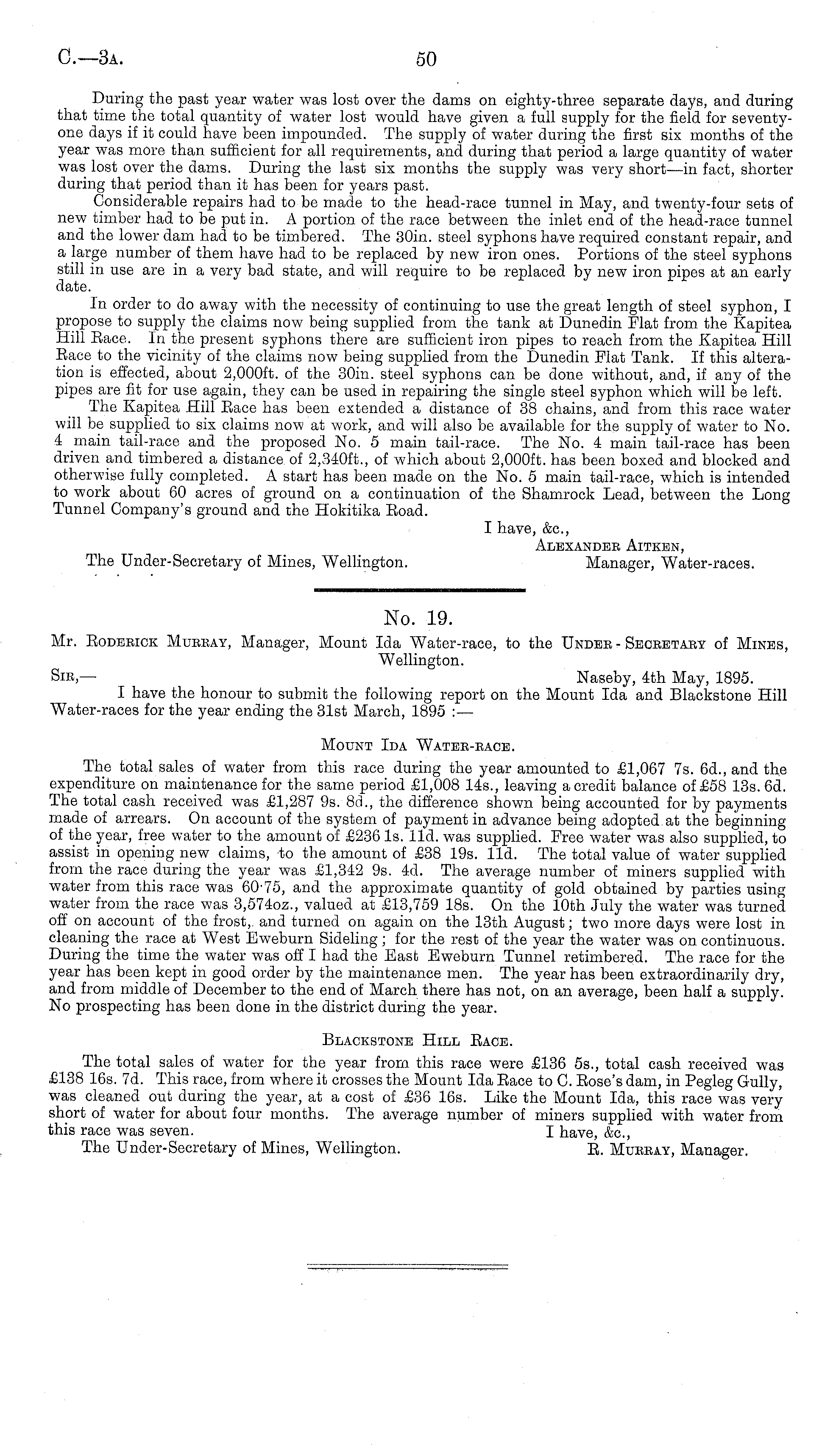No. 19. Mr. Eodbeick Mueeay, Manager, Mount Ida Water-race, to the Under - Secbetaby of Mines, Wellington. Sib,— Naseby, 4th May, 1895. I have the honour to submit the following report on the Mount Ida and Blackstone Hill Water-races for the year ending the 31st March, 1895 :— Mount Ida Wateb-bace. The total sales of water from this race during the year amounted to £1,067 7s. 6d., and the expenditure on maintenance for the same period £1,008 145., leaving a credit balance of £58 13s. 6d. The total cash received was £1,287 9s. Bd., the difference shown being accounted for by payments made of arrears. On account of the system of payment in advance being adopted at the beginning of the year, free water to the amount of £236 Is. lid. was supplied. Free water was also supplied, to assist in opening new claims, to the amount of £38 19s. lid. The total value of water supplied from the race during the year was £1,342 9s. 4d. The average number of miners supplied with water from this race was 6075, and the approximate quantity of gold obtained by parties using water from the race was 3,5740z., valued at £13,759 18s. On the 10th July the water was turned off on account of the frost, and turned on again on the 13th August; two more days were lost in cleaning the race at West Eweburn Sideling ; for the rest of the year the water was on continuous. During the time the water was off I had the East Eweburn Tunnel retimbered. The race for the year has been kept in good order by the maintenance men. The year has been extraordinarily dry, and from middle of December to the end of March there has not, on an average, been half a supply. No prospecting has been done in the district during the year. Blackstone Hill Eace. The total sales of water for the year from this race were £136 55., total cash received was £138 16s. 7d. This race, from where it crosses the Mount Ida Eace to C. Eose's dam, in Pegleg Gully, was cleaned out during the year, at a cost of £36 16s. Like the Mount Ida, this race was very short of water for about four months. The average number of miners supplied with water from this race was seven. I have, &c, The Under-Secretary of Mines, Wellington. E. Mubeay, Manager.