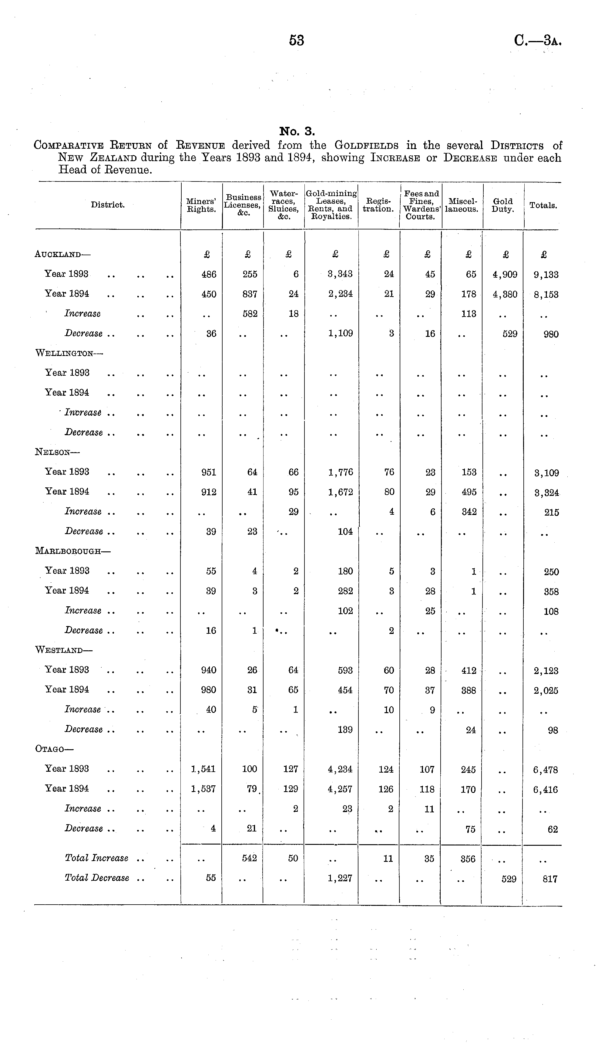 No. 3. Comparative Return of Revenue derived from the Goldfields in the several Districts of New Zealand during the Years 1893 and 1894, showing Increase or Decrease under each Head of Revenue.