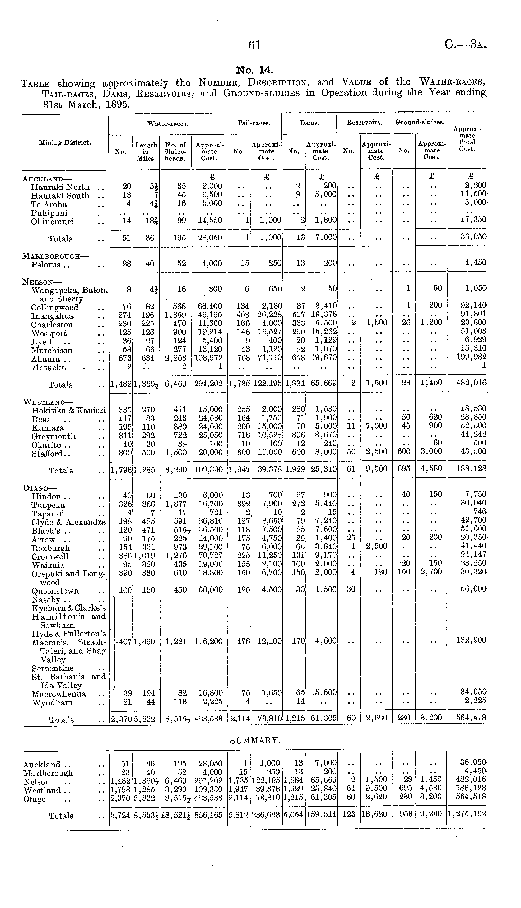 No. 14. Table showing approximately the Number, Description, and Value of the Water-races, Tail-races, Dams, Reservoirs, and Ground-sluices in Operation during the Year ending 31st March, 1895.
