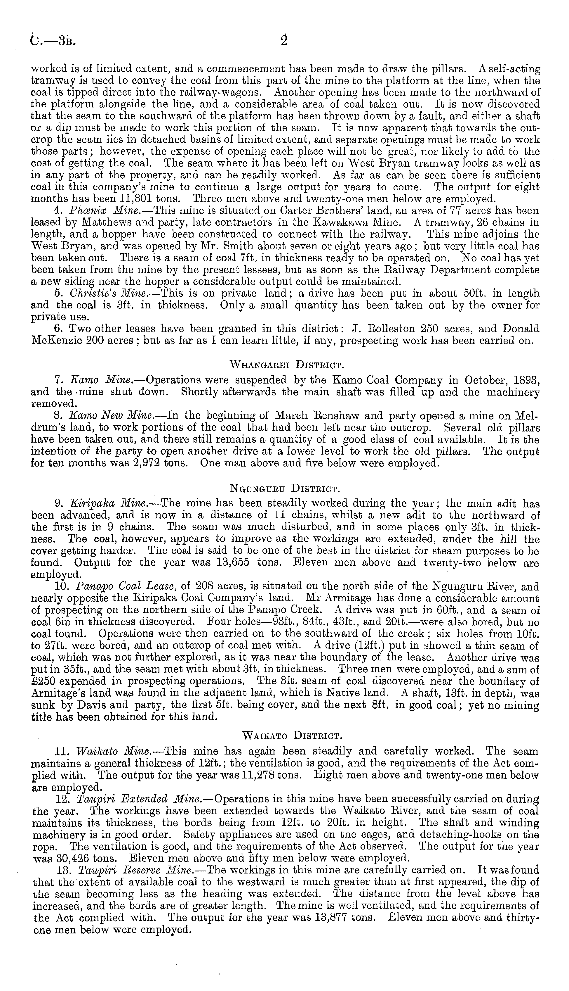 worked is of limited extent, and a commencement has been made to draw the pillars. A self-acting tramway is used to convey the coal from this part of the. mine to the platform at the line, when the coal is tipped direct into the railway-wagons. Another opening has been made to the northward of the platform alongside the line, and a considerable area of coal taken out. It is now discovered that the seam to the southward of the platform has been thrown down by a fault, and either a shaft or a dip must be made to work this portion of the seam. It is now apparent that towards the outcrop the seam lies in detached basins of limited extent, and separate openings must be made to work those parts; however, the expense of opening each place will not be great, nor likely to add to the cost of getting the coal. The seam where it has been left on West Bryan tramway looks as well as in any part of the property, and can be readily worked. As far as can be seen there is sufficient coal in this company's mine to continue a large output for years to come. The output for eight months has been 11,801 tons. Three men above and twenty-one men below are employed. 4. Phoenix Mine. —This mine is situated on Carter Brothers' land, an area of 77 acres has been leased by Matthews and party, late contractors in the Kawakawa Mine. A tramway, 26 chains in length, and a hopper have been constructed to connect with the railway. This mine adjoins the West Bryan, and was opened by Mr. Smith about seven or eight years ago; but very little coal has been taken out. There is a seam of coal 7ft. in thickness ready to be operated on. No coal has yet been taken from the mine by the present lessees, but as soon as the Railway Department complete a new siding near the hopper a considerable output could be maintained. 5. Christie's Mine. —This is on private land; a drive has been put in about 50ft. in length and the coal is 3ft. in thickness. Only a small quantity has been taken out by the owner for private use. 6. Two other leases have been granted in this district: J. Rolleston 250 acres, and Donald McKenzie 200 acres ; but as far as I can learn little, if any, prospecting work has been carried on. Whangabei Disteict. 7. Kamo Mine. —Operations were suspended by the Kamo Coal Company in October, 1893, and the -mine shut down. Shortly afterwards the main shaft was filled up and the machinery removed. 8. Kamo New Mine. —In the beginning of March Renshaw and party opened a mine on Meldrum's land, to work portions of the coal that had been left near the outcrop. Several old pillars have been taken out, and there still remains a quantity of a good class of coal available. It is the intention of the party to open another drive at a lower level to work the old pillars. The output for ten months was 2,972 tons. One man above and five below were employed. Ngungubu Disteict. 9. Kirvpaka Mine.- —The mine has been steadily worked during the year; the main adit has been advanced, and is now in a distance of 11 chains, whilst a new adit to the northward of the first is in 9 chains. The seam was much disturbed, and in some places only 3ft. in thickness. The coal, however, appears to improve as the workings are extended, under the hill the cover getting harder. The coal is said to be one of the best in the district for steam purposes to be found. Output for the year was 13,655 tons. Eleven men above and twenty-two below are employed. 10. Panapo Goal Lease, of 208 acres, is situated on the north side of the Ngunguru Eiver, and nearly opposite the Kiripaka Coal Company's land. Mr Armitage has done a considerable amount of prospecting on the northern side of the Panapo Creek. A drive was put in 60ft., and a seam of coal 6in in thickness discovered. Four holes —93ft., 84ft., 43ft., and 20ft.—were also bored, but no coal found. Operations were then carried on to the southward of the creek; six holes from 10ft. to 27ft. were bored, and an outcrop of coal met with. A drive (12ft.) put in showed a thin seam of coal, which was not further explored, as it was near the boundary of the lease. Another drive was put in 35ft., and the seam met with about 3ft. in thickness. Three men were employed, and a sum of £250 expended in prospecting operations. The 3ft. seam of coal discovered near the boundary of Armitage's land was found in the adjacent land, which is Native land. A shaft, 13ft. in depth, was sunk by Davis and party, the first sft. being cover, and the next Bft. in good coal; yet no mining title has been obtained for this land. Waikato Disteict, 11. Waikato Mine. —This mine has again been steadily and carefully worked. The seam maintains a general thickness of 12ft.; the ventilation is good, and the requirements of the Act complied with. The output for the year was 11,278 tons. Eight men above and twenty-one men below are employed. 12. Taupiri Extended Mine. —Operations in this mine have been successfully carried on during the year. The workings have been extended towards the Waikato River, and the seam of coal maintains its thickness, the bords being from 12ft. to 20ft. in height. The shaft and winding machinery is in good order. Safety appliances are used on the cages, and detaching-hooks on the rope. The ventilation is good, and the requirements of the Act observed. The output for the year was 30,426 tons. Eleven men above and fifty men below were employed. 13. Taupiri Beserve Mine. —The workings in this mine are carefully carried on. It was found that the extent of available coal to the westward is much greater than at first appeared, the dip of the seam becoming less as the heading was extended. The distance from the level above has increased, and the bords are of greater length. The mine is well ventilated, and the requirements of the Act complied with. The output for the year was 13,877 tons. Eleven men above and thirtyone men below were employed.