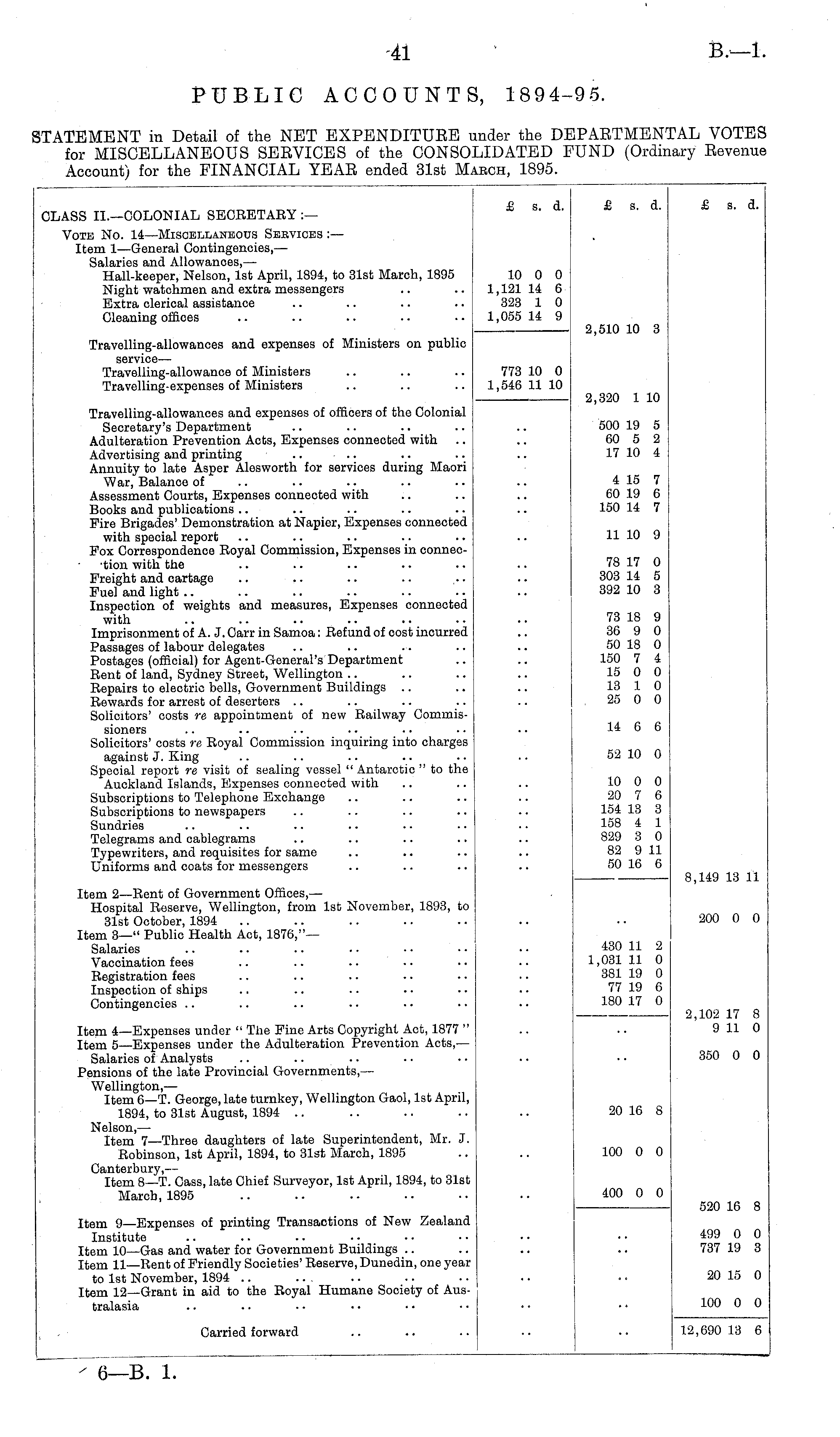 CLASS II.—COLONIAL SECRETARY :— £ s. d. £ s. d. & s. a. Vote No. 14—Miscellaneous Services :— Item 1—General Contingencies,— Salaries and Allowances, — Hall-keeper, Nelson, 1st April, 1894, to 31st March, 1895 Night watchmen and extra messengers Extra clerical assistance Cleaning offices 10 0 0 1,121 14 6 323 1 0 1,055 14 9 2,510 10 3 Travelling-allowances and expenses of Ministers on public service— Travelling-allowance of Ministers Travelling-expenses of Ministers 2,320 1 10 773 10 0 1,546 11 10 Travelling-allowances and expenses of officers of the Colonial Secretary's Department Adulteration Prevention Acts, Expenses connected with Advertising and printing Annuity to late Asper Alesworth for services during Maori War, Balance of Assessment Courts, Expenses connected with Books and publications Fire Brigades' Demonstration at Napier, Expenses connected with special report Fox Correspondence Royal Commission, Expenses in connection with the Freight and cartage Fuel and light Inspection of weights and measures, Expenses connected with Imprisonment of A. J. Carr in Samoa: Refund of cost incurred Passages of labour delegates Postages (official) for Agent-General's Department Rent of land, Sydney Street, Wellington Repairs to electric bells, Government Buildings Rewards for arrest of deserters Solicitors' costs re appointment of new Railway Commissioners Solicitors' costs re Royal Commission inquiring into charges against J. King Special report re visit of sealing vessel " Antarctic " to the Auckland Islands, Expenses connected with Subscriptions to Telephone Exchange Subscriptions to newspapers Sundries Telegrams and cablegrams Typewriters, and requisites for same Uniforms and coats for messengers 500 19 5 60 5 2 17 10 4 4 15 7 60 19 6 150 14 7 11 10 9 78 17 0 303 14 5 392 10 3 73 18 9 36 9 0 50 18 0 150 7 4 15 0 0 13 1 0 25 0 0 14 6 6 52 10 0 10 0 0 20 7 6 154 13 3 158 4 1 829 3 0 82 9 11 50 16 6 Item 2—Rent of Government Offices, — Hospital Reserve, Wellington, from 1st November, 1893, to 31st October, 1894 Item 3—" Public Health Act, 1876,"— Salaries Vaccination fees .. .. .. Registration fees Inspection of ships Contingencies 8,149 13 11 430 11 2 1,031 11 0 381 19 0 77 19 6 180 17 0 200 0 0 2,102 17 8 9 11 0 Item 4—Expenses under " The Fine Arts Copyright Act, 1877 " Item 5 —Expenses under the Adulteration Prevention Acts, — Salaries of Analysts Pensions of the late Provincial Governments, — Wellington,— Item 6—T. George, late turnkey, Wellington Gaol, 1st April, 1894, to 31st August, 1894 Nelson, — Item 7—Three daughters of late Superintendent, Mr. J. Robinson, 1st April, 1894, to 31st March, 1895 Canterbury,— Item 8—T. Cass, late Chief Surveyor, 1st April, 1894, to 31st March, 1895 20 16 8 350 0 0 100 0 0 400 0 0 Item 9 —Expenses of printing Transactions of New Zealand Institute Item 10—Gas and water for Government Buildings Item 11 —Rent of Friendly Societies' Reserve, Dunedin, one year to 1st November, 1894 .. Item 12—Grant in aid to the Royal Humane Society of Australasia 520 16 8 499 0 0 737 19 3 20 15 0 100 0 0 Carried forward 12,690 13 6 / 3—B. 1.