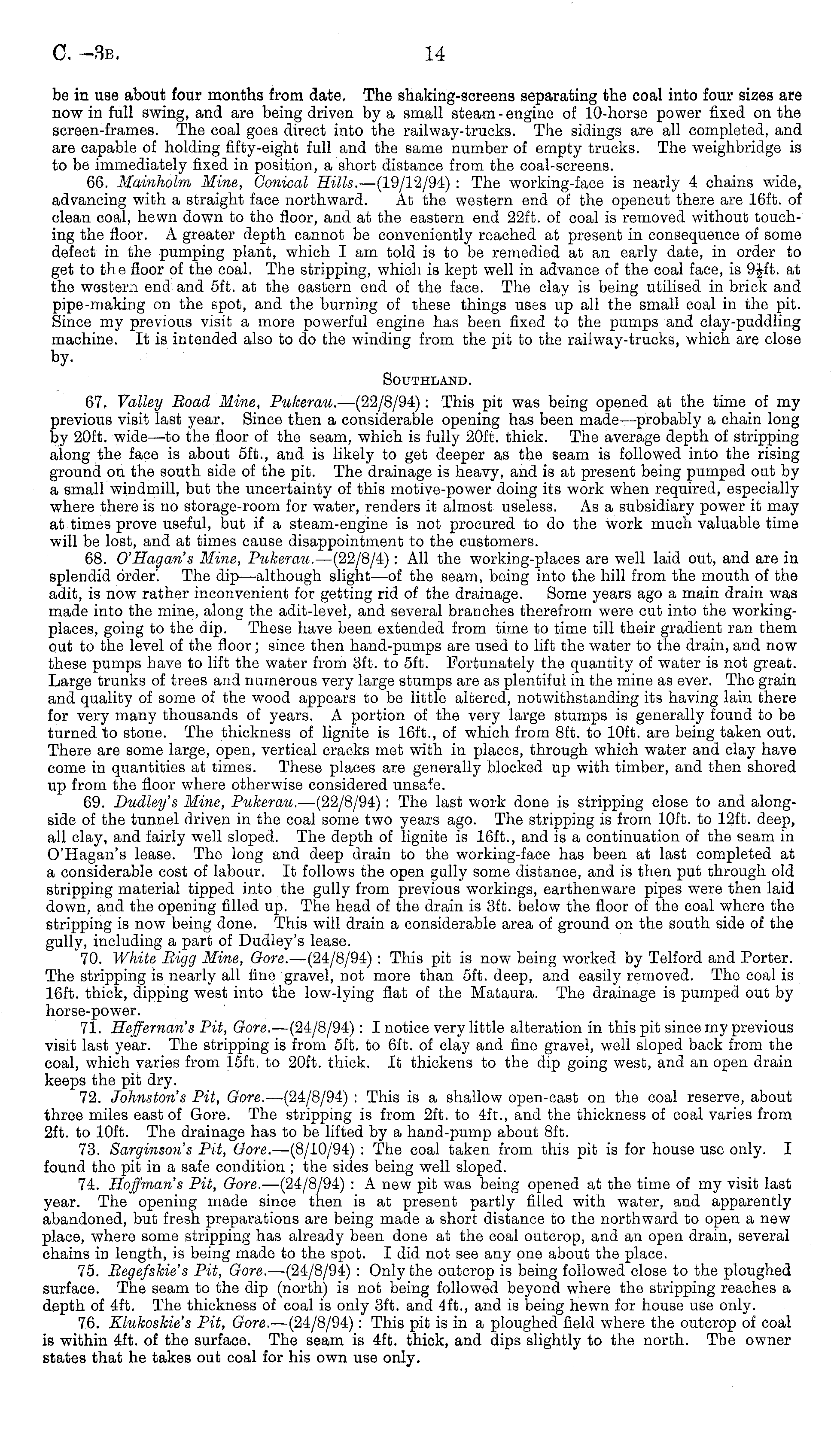 be in use about four months from date. The shaking-screens separating the coal into four sizes are now in full swing, and are being driven by a small steam-engine of 10-horse power fixed on the screen-frames. The coal goes direct into the railway-trucks. The sidings are all completed, and are capable of holding fifty-eight full and the same number of empty trucks. The weighbridge is to be immediately fixed in position, a short distance from the coal-screens. 66. Mainholm Mine, Conical Hills. —(l 9/12/94) : The working-face is nearly 4 chains wide, advancing with a straight face northward. At the western end of the opencut there are 16ft. of clean coal, hewn down to the floor, and at the eastern end 22ffc. of coal is removed without touching the floor. A greater depth cannot be conveniently reached at present in consequence of some defect in the pumping plant, which I am told is to be remedied at an early date, in order to get to the floor of the coal. The stripping, which is kept well in advance of the coal face, is 9-J-ft. at the western end and sft. at the eastern end of the face. The clay is being utilised in brick and pipe-making on the spot, and the burning of these things uses up all the small coal in the pit. Since my previous visit a more powerful engine has been fixed to the pumps and clay-puddling machine. It is intended also to do the winding from the pit to the railway-trucks, which are close bySouthland. 67. Valley Road Mine, Pukerau. —(22/8/94): This pit was being opened at the time of my previous visit last year. Since then a considerable opening has been made—probably a chain long fey 20ft. wide —to the floor of the seam, which is fully 20ft. thick. The average depth of stripping along the face is about sft., and is likely to get deeper as the seam is followed into the rising ground on the south side of the pit. The drainage is heavy, and is at present being pumped out by a small windmill, but the uncertainty of this motive-power doing its work when required, especially where there is no storage-room for water, renders it almost useless. As a subsidiary power it may at times prove useful, but if a steam-engine is not procured to do the work much valuable time will be lost, and at times cause disappointment to the customers. 68. O'Hagan's Mine, Pukerau. —(22/8/4): All the working-places are well laid out, and are in splendid order. The dip—although slight —of the seam, being into the hill from the mouth of the adit, is now rather inconvenient for getting rid of the drainage. Some years ago a main drain was made into the mine, along the adit-level, and several branches therefrom were cut into the workingplaces, going to the dip. These have been extended from time to time till their gradient ran them out to the level of the floor; since then hand-pumps are used to lift the water to the drain, and now these pumps have to lift the water from 3ft. to sft. Fortunately the quantity of water is not great. Large trunks of trees and numerous very large stumps are as plentiful in the mine as ever. The grain and quality of some of the wood appears to be little altered, notwithstanding its having lain there for very many thousands of years. A portion of the very large stumps is generally found to be turned to stone. The thickness of lignite is 16ft., of which from Bft. to 10ft. are being taken out. There are some large, open, vertical cracks met with in places, through which water and clay have come in quantities at times. These places are generally blocked up with timber, and then shored up from the floor where otherwise considered unsafe. 69. Dudley's Mine, Pukerau. —(22/8/94): The last work done is stripping close to and alongside of the tunnel driven in the coal some two years ago. The stripping is from 10ft. to 12ft. deep, all clay, and fairly well sloped. The depth of lignite is 16ft., and is a continuation of the seam in O'Hagan's lease. The long and deep drain to the working-face has been at last completed at a considerable cost of labour. It follows the open gully some distance, and is then put through old stripping material tipped into the gully from previous workings, earthenware pipes were then laid down, and the opening filled up. The head of the drain is 3ft. below the floor of the coal where the stripping is now being done. This will drain a considerable area of ground on the south side of the gully, including a part of Dudley's lease. 70. White Bigg Mine, Gore. —(24/8/94) : This pit is now being worked by Telford and Porter. The stripping is nearly all tine gravel, not more than sft. deep, and easily removed. The coal is 16ft. thick, dipping west into the low-lying flat of the Mataura. The drainage is pumped out by horse-power. 71. Heffernan's Pit, Gore. —(24/8/94): I notice very little alteration in this pit since my previous visit last year. The stripping is from sft. to 6ft. of clay and fine gravel, well sloped back from the coal, which varies from 15ft. to 20ft. thick. It thickens to the dip going west, and an open drain keeps the pit dry. 72. Johnston s Pit, Gore. —(24/8/94) : This is a shallow open-cast on the coal reserve, about three miles east of Gore. The stripping is from 2ft. to 4ft., and the thickness of coal varies from 2ft. to 10ft. The drainage has to be lifted by a hand-pump about Bft. 73. Sarginson's Pit, Gore. —(B/10/94) : The coal taken from this pit is for house use only. I found the pit in a safe condition ; the sides being well sloped. 74. Hoffman's Pit, Gore. —(24/8/94) : A new pit was being opened at the time of my visit last year. The opening made since then is at present partly filled with water, and apparently abandoned, but fresh preparations are being made a short distance to the northward to open a new place, where some stripping has already been done at the coal outcrop, and an open drain, several chains in length, is being made to the spot. I did not see any one about the place. 75. BegefsMe's Pit, Gore. —(24/