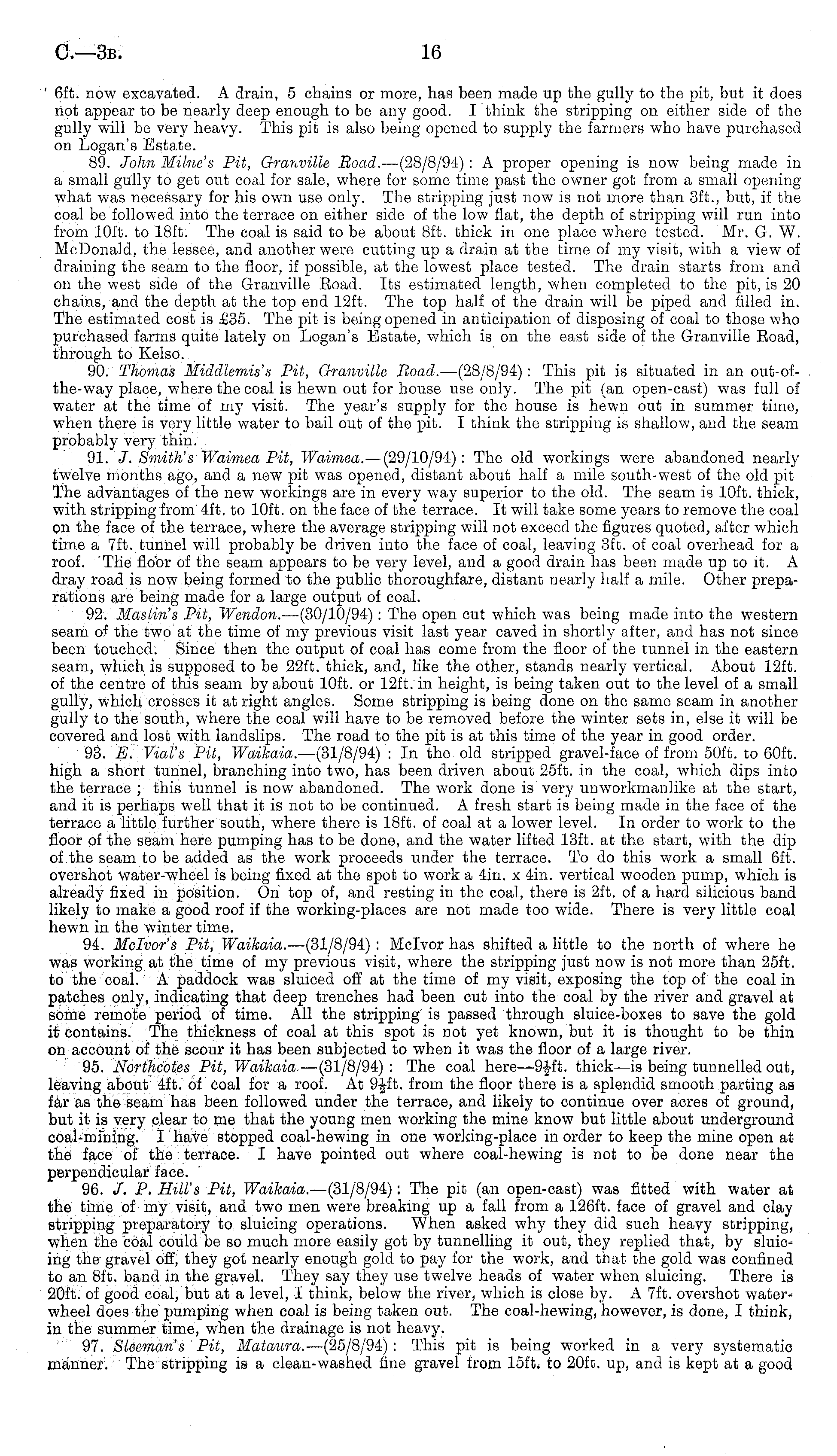 6ft. now excavated. A drain, 5 chains or more, has been made up the gully to the pit, but it does not appear to be nearly deep enough to be any good. I think the stripping on either side of the gully will be very heavy. This pit is also being opened to supply the farmers who have purchased on Logan's Estate. 89. John Milne's Pit, Granville Road. —(2B/8/94) : A proper opening is now being made in a small gully to get out coal for sale, where for some time past the owner got from a small opening what was necessary for his own use only. The stripping just now is not more than 3ft., but, if the coal be followed into the terrace on either side of the low flat, the depth of stripping will run into from 10ft. to 18ft. The coal is said to be about Bft. thick in one place where tested. Mr. G. W. McDonald, the lessee, and another were cutting up a drain at the time of my visit, with a view of draining the seam to the floor, if possible, at the lowest place tested. The drain starts from and on the west side of the Granville Eoad. Its estimated length, when completed to the pit, is 20 chains, and the depth at the top end 12ft. The top half of the drain will be piped and filled in. The estimated cost is £35. The pit is being opened in anticipation of disposing of coal to those who purchased farms quite lately on Logan's Estate, which is on the east side of the Granville Road, through to Kelso. 90. Thomas Middlemis's Pit, Granville Boad. —(2B/8/94): This pit is situated in an out-of-the-way place, where the coal is hewn out for house use only. The pit (an open-cast) was full of water at the time of my visit. The year's supply for the house is hewn out in summer time, when there is very little water to bail out of the pit. I think the stripping is shallow, and the seam probably very thin. 91. J. Smith's Waimea Pit, Waimea. — (29/10/94): The old workings were abandoned nearly twelve months ago, and a new pit was opened, distant about half a mile south-west of the old pit The advantages of the new workings are in every way superior to the old. The seam is 10ft. thick, with stripping from 4ft. to 10ft. on the face of the terrace. It will take some years to remove the coal on the face of the terrace, where the average stripping will not exceed the figures quoted, after which time a 7ft. tunnel will probably be driven into the face of coal, leaving 3ft. of coal overhead for a roof. 'The floor of the seam appears to be very level, and a good drain has been made up to it. A dray road is now being formed to the public thoroughfare, distant nearly half a mile. Other preparations are being made for a large output of coal. 92. Maslin's Pit, Wendon. —(30/10/94): The open cut which was being made into the western seara of the two at the time of my previous visit last year caved in shortly after, and has not since been touched. Since then the output of coal has come from the floor of the tunnel in the eastern seam, which is supposed to be 22ft. thick, and, like the other, stands nearly vertical. About 12ft. of the centre of this seam by about 10ft. or 12ft. in height, is being taken out to the level of a small gully, which crosses it at right angles. Some stripping is being done on the same seam in another gully to the south, where the coal will have to be removed before the winter sets in, else it will be covered and lost with landslips. The road to the pit is at this time of the year in good order. 93. E. Vial's Pit, Waikaia.— (3l/8/94) : In the old stripped gravel-face of from 50ft. to 60ft. high a short tunnel, branching into two, has been driven about 25ft. in the coal, which dips into the terrace ; this tunnel is now abandoned. The work done is very unworkmanlike at the start, and it is perhaps well that it is not to be continued. A fresh start is being made in the face of the terrace a little further south, where there is 18ft. of coal at a lower level. In order to work to the floor of the seam here pumping has to be done, and the water lifted 13ft. at the start, with the dip of the seam to be added as the work proceeds under the terrace. To do this work a small 6ft. overshot water-wheel is being fixed at the spot to work a 4in. x 4in. vertical wooden pump, which is already fixed in position. On top of, and resting in the coal, there is 2ft. of a hard silicious band likely to make a good roof if the working-places are not made too wide. There is very little coal hewn in the winter time. 94. Mclvor's Pit, Waikaia. —(31/8/94) : Mclvor has shifted a little to the north of where he was working at the time of my previous visit, where the stripping just now is not more than 25ft. to the coal. A paddock was sluiced off at the time of my visit, exposing the top of the coal in patches only, indicating that deep trenches had been cut into the coal by the river and gravel at some remote period of time. All the stripping is passed through sluice-boxes to save the gold it contains. The thickness of coal at this spot is not yet known, but it is thought to be thin on account of the scour it has been subjected to when it was the floor of a large river. 95. Northcotes Pit, Waikaia. —(3l/8/94): The coal here—9Jft. thick—is being tunnelled out, leaving about 4ft. of coal for a roof. At 9-J-ft. from the floor there is a splendid smooth parting as far as the seam has been followed under the terrace, and likely to continue over acres of ground, but it is very clear to me that the young men working the mine know but little about underground coal-mining. I have stopped coal-hewing in one working-place in order to keep the mine open at the face of the terrace. I have pointed out where coal-hewing is not to be done near the perpendicular face. 96. /. P. Hill's Pit, Waikaia. —(3l/8/94): The pit (an open-cast) was fitted with water at the time of my visit, and two men were breaking up a fall from a 126 ft. face of gravel and clay stripping preparatory to sluicing operations. When asked why they did such heavy stripp