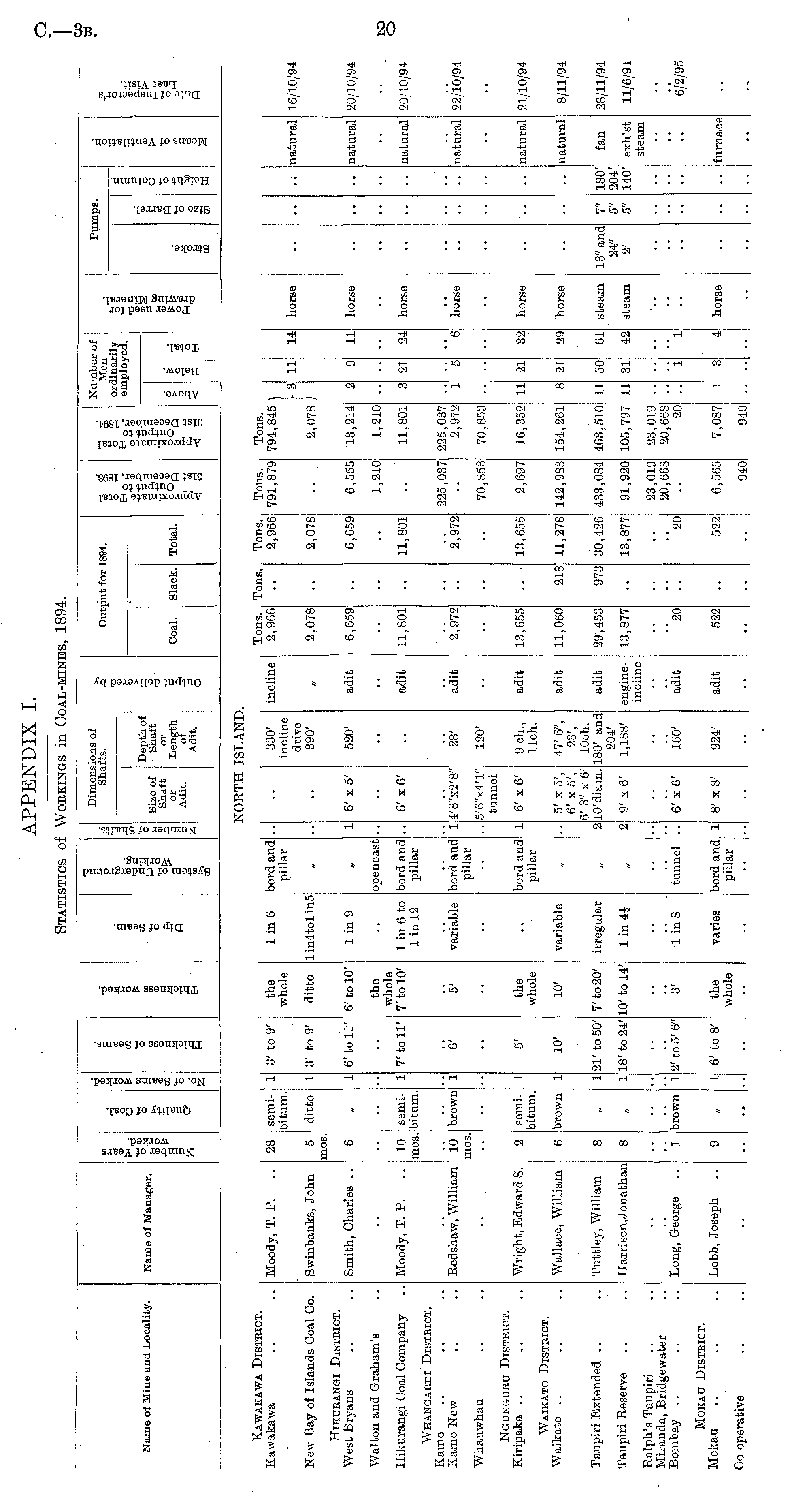 Name of Mine and Locality. Name of Manager. g Cβ 1 3 o o '■3 •a DO o 6 Cβ CO o ffl a 3 Tβ a> i - C3 ID O Pi 5 O 5 si ■a a m o n Depth of Size of Shaft Shaft or or Length Adit. of Aait. Dimensions of Shafts. .a 1 s Output for 1894. ■3 g ft co 11! ft CD Number of | Men ordinarily ■ employed. <! m b 1 O c3 Pumps. "3 CO a I 43 to a o n Coal. Slack. Total. 1 NORTH ISLAND Kawakawa District. Kawakawa Moody, T. P. 28 semibitum. 3' to 9' the whole 1 in 6 bord and pillar 330' incline drive 390' incline Tons. 2,966 Tons., Tons. 2,966 Tons. 791,879 Tons. , 794,845 Swinbanks, John Iin4tolin5 2,078 2,078 2,078 !• ill 14 horse - natural 16/10/94 Now Bay of Islands Coal Co. 5 ditto 3' to 9' ditto Hikubangi District. West Bryans mos. 6'toU' 6'to 10' horse 20/10/94 Smith, Charles .. 6 1 in 9 6' x5' 520' adit 6,659 6,659 6,555 13,214 11 natural 1 Walton and Graham's the whole 7'to 11' 7'to 10' opencast 1,210 1,210 •■ Hikurangi Goal Company Moody, T. P. 10 mos. semibitum. 1 in 6 to 1 in 12 bord and pillar 6' x6' adit 11,801 11,801 11,801 21 24 horse natural 20/10/94 Whakgabei District. Kamo Kamo New Redshaw, William i io brown 6' 5' variable bord and pillar 4'8"x2'8" 28' adit 2,972 2,972 225,037 225,037 2,972 horse natural 22/10/94 1 i i 5 "6 Whauwhau mos. 5'6"x4'l" tannel 120' 70,853 • • 70,853 Ngusguru Distbict. Kiripaka Wright, EdwardS. semibitum. 5' the whole bord and pillar 6' x6' 9 oh., lloh. adit 13,655 13,655 2,697 16,352 horse natural 21/10/94 1 I 21 32 Waikato District. Waikato .. Wallace, William brown 10' 10' variable 5' x5', 6' x 5', 6' 3" x 6' 10'diam. 47' 6", 23', 10oh. 180' and 204' 1,188' adit 11,060 218 11,278 142,983J 154,261 horse natural 8/11/94 ■n 29 Taupiri Extended Tuttley, William 8 21' to 50' 7'to 20' irregular adit 29,453 973 30,426 433,084 463,510 steam 13" and 24" 2' fan 28/11/94 11 50 61 7" 5" 5" 180' 204' 140' Taupiri Reserve Harrison, Jonathan 8 18' to 24' 10' to 14' 1 in 4£ 9' x6' engineincline 13,877 13,877 91,920 105,797 11 31 42 steam exh'st steam 11/6/94 Ralph's Taupiri Miranda, Bridgewater Bombay .. Long, George 1 brown 2' to 5' 6" 3' 1 in 8 tunnel 6' x6' 150' adit 20 "20 23,019| 20,668 23,019 20,668 20 •• i ■• "l 1 •• 6/2/95 Mokau District. Mokau Lobb, Joseph 6' to 8' the whole varies bord and pillar 8' x8' 924' adit 522 522 6,565 horse furnace 7,0871 Co operative 940! 940 - • •