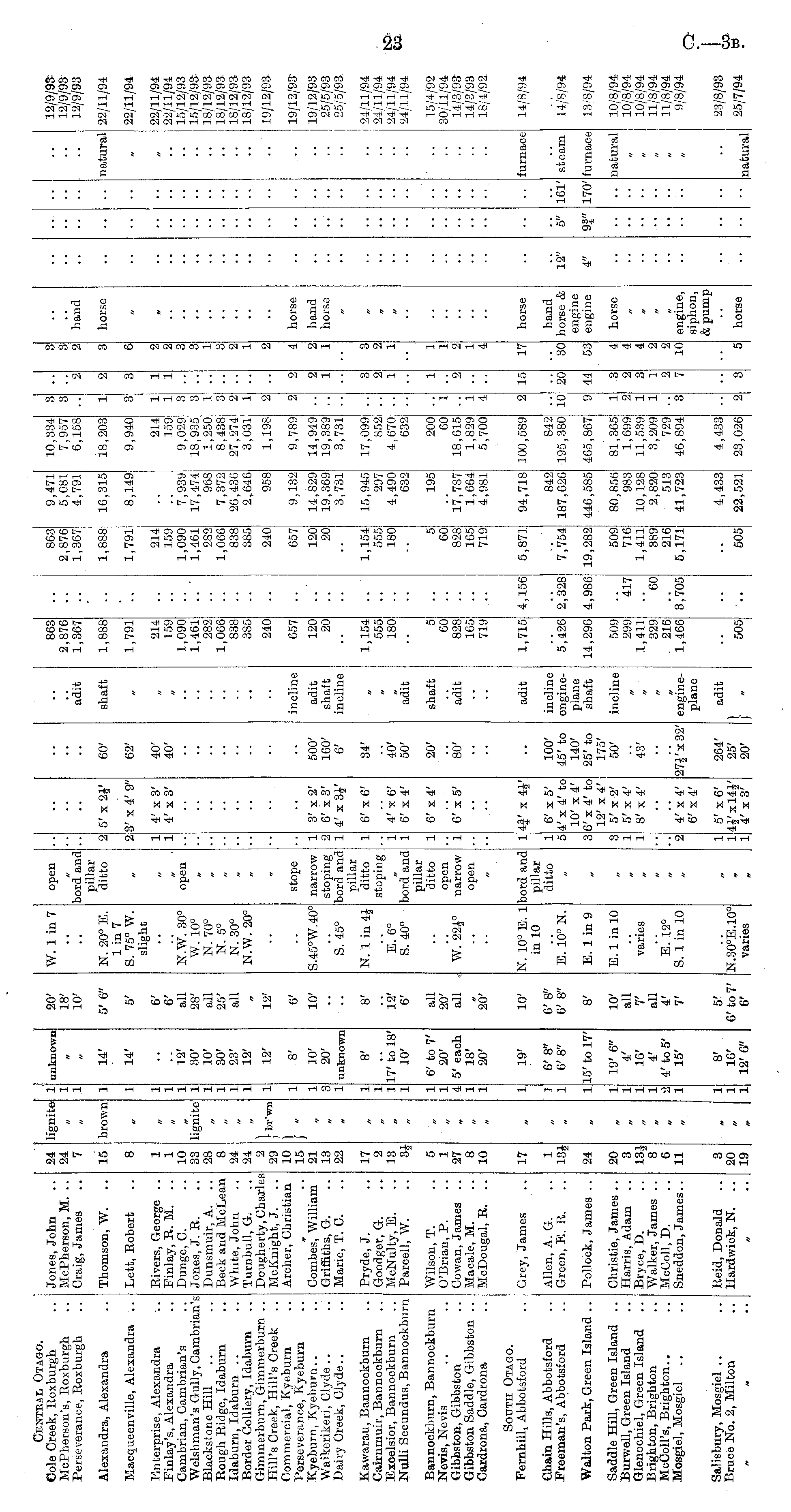 Central Otago. Cole Creek, Roxburgh McPherson's, Roxburgh Perseverance, Roxburgh Jones, John McPherson, M. .. Craig, James 24 24 7 lignite 1 1 1 nnlmown • 20' 18' 10' W. 1 in 7 open ■■ •• adit 863 2,876 1,367 863 2,876 1,367 9,471 5,081 4,791 10,334 7,957 6,158 3 3 'I 2 3 3 2 •• hand •• 12/9/93 12/9/93 12/9/93 15 brown 14' 5' 6" N. 20° E. 1 in 7 S. 75° W. slight bord and pillar ditto j 5' x 2J' 60' shaft 1,888 1,888 16,315 18,203 ■" 1 horse natural 22/11/94 Alexandra, Alexandra Thomson, W. Maequeeiiville, Alexandra .. Lett, Robert 8 14' 5' 3' x 4' 9" 62' 1,791 1,791 8,149 9,940 22/11/94 7'lnterprise, Alexandra Finlay's, Alexandra Cambrian, Cambrian's Welshman's Gully, Cambrian's Blackstone Hill Rough Ridge, Idaburn Idaburn, Idaburn Border Colliery, Idaburn Gimmerburn, Gimmerburn .. Hill's Creek, Hill's Greek .. Commercial, Kyeburn Perseverance, Kyeburn Kyeburn, Kyeburn Waikerikeri, Clyde Dairy Creek, Clyde.. Rivers, George .. Finlay, R. M. .. Dunge, C. Jones, J. R. Dunsmuir, A. Beck and McLean White, John Turn bull, G. Dougherty, Charles McKnight, J. Archer, Christian 1 1 10 33 28 8 24 24 2 29 10 15 21 13 22 lignite " 1 1 1 1 1 1 1 i 12' 30' 10' 30' 23' 12' 6' 6' all 28' all 25' all N.W. 30° W. 10° N. 70° N. 5° N. 30° N.W. 20° open 1 1 4' x 3' 4' x3' 40' 40' 214 159 1,090 1,461 282 1,066 838 385 •• 214 159 1,090 1,461 282 1,066! 838 385| 7,939 17,474 968 7,372 26,436 2,646 214 159 9,029 18,935 1,250 8,438 27,274 3,031 1 1 3 3 1 3 2 1 1 1 2 2 3 3 1 3 2 1 I .. 22/11/94 22/11/94 15/12/93 15/12/93 18/12/93 18/12/93 18/12/93 18/12/93 r br'wn 1 19' i 12' 240 240 958> 1,198 2 2 19/12/93 1" I 1 8' 6' stope incline 657 657 9,132 9,789 2 4 horse I 19/12/93Combes, William Griffiths, G. Marie, T. C. •■ 1 3 1 10' 20' unknown 10' S.45°W.40° S.'45° narrow stoping bord and pillar ditto stoping 1 2 1 3'x2' 6' x 3' 4' x 3J' 500' 160' 6' adit shaft incline 120 20 120 20 14,829 19,369 3,731 14,949 19,389 3,731 2 1 2 1 hand horsa .. ! 19/12/93 25/5/93 25/5/93 .. Kawarau, Bannockburn Cairnmuir, Bannockburn lijxoelsior, Bannockburn Nulli Secundus, Bannockburn Pryde, J. Goodger, G. McNulty, E. Parcel], W. 17 2 13 34 1 1 1 1 8' 17' to 18' 10' 8' 12' 6' N. 1 in 4J E. 6° S. 40° 1 1 6' x6' 4' x6' 6' x4' 34' 40' 50' 1,154 555 180 1,154 555 180 15,945 297 4,490 632 17,099; 852 4,670 632 3 2 1 3 2 1 24/11/94 24/11/94 24/11/94 24/11/94 bord and pillar ditto open narrow open adit Bannocklmrn, Bannockburn Nevis, Nevis Gibbston, Gibbston Gibbston Saddle, Gibbston .. Cardrona, Cardrona Wilson, T. O'Brian, P. Cowan, James .. Macale, M. McDougal, R. .. 5 1 27 8 10 1 1 4 1 1 6' to 7' 20' 5' each 18' 20' all 20' all W.'22J° 1 1 6' x4' 6' x 5' 20' 80' shaft adit 5 60 828 165 719 5 60 828 165| 719 195 17,787 1,664 4,981 200 60 18,615 1,829 5,700 1 1 4 1 '2 1 1 2 1 4 15/4/92 30/il/94 14/3/93 14/3/93 18/4/92 20' South Otago. Pernhill, Abbotsford Grey, James 19' 10' N. 10° E. 1 in 10 bord and pillar ditto 4f' x 4J' adit 1,715 4,156 5,871 94,718 100,589 horse furnace 14/8/94 17 15 17 Chain Hills, Abbotsford Freeman's, Abbotsford Allen, A. G. Green, E. R. 1 13i 1 1 6'8" 6'8" 6'8" 6' 8" E. 10° N. 1 5 6' x 5' 4' x 4' to 10' x 4' 6' x 4' to 12' x 4' 5' x2' 5'x4' 8' x 4' 100' 45' to 140' 25' to 175' 50' incline engineplane shaft 5,426 2,328 7,754 842 187,626 842 195,380 io 20 '30 hand horse & engine engine 12'' 5" 161' steam 14/8/9* Walton Park, Green Island .. Pollock, James .. 24 15' to 17' 8' E. 1 in 9 14,296 4,986 19,282 446,585 465,867 9 a 53 4" 9|" 170' furnace 13'8/94 Saddle Hill, Green Island .. Burwell, Green Island Glenoohiel, Green Island Brighton, Brighton McColl's, Brighton.. Mosgiel, Mosgiel Christie, James .. Harris, Adam Bryce, D. Walker, James .. McColl.D. Sneddon, James.. 20 3 8 6 11 1 1 1 1 1 19' 6" 4' 16' 4' 4' to 5' 15' 10' all 7' all 4' 7' E. 1 in 10 3 1 1 incline 509 299 1,411 329 216 1,466 '417 509 716 1,411 389 216 5,171 80,856 983 10,128 2,820 513 41,723 81,365 1,699 11,539 3,209 729 46,894 1 2 1 3 2 3 1 2 7 4 4 4 2 2 10 horse natural 10/8/94 10/8/94 10/8/94 11/8/94 11/8/94 9/8/94 varies 43' " E. 12° S. 1 in 10 60 '/ ! 2 4' x 4' 6' x 4' 27J'x32' engineplane 3,705 3 engine, siphon, &pump " Salisbury, Mosgiel Bruce No. 2, Milton Reid, Donald Hardwick, N. 3 19 1 1 1 8' 16' 12' 6" 5' 6'to 7' 6' N.30°E.10° varies 1 1 5' x 6' 4J'xl4J' I 4' x 3' 264' 25' 20' adit 4,433 4,433 23/8/93 •1 ■• } ' 505 .. 505 22,521 23,026 2 3 5 horse natural 25/7/94 .. I , I I . I