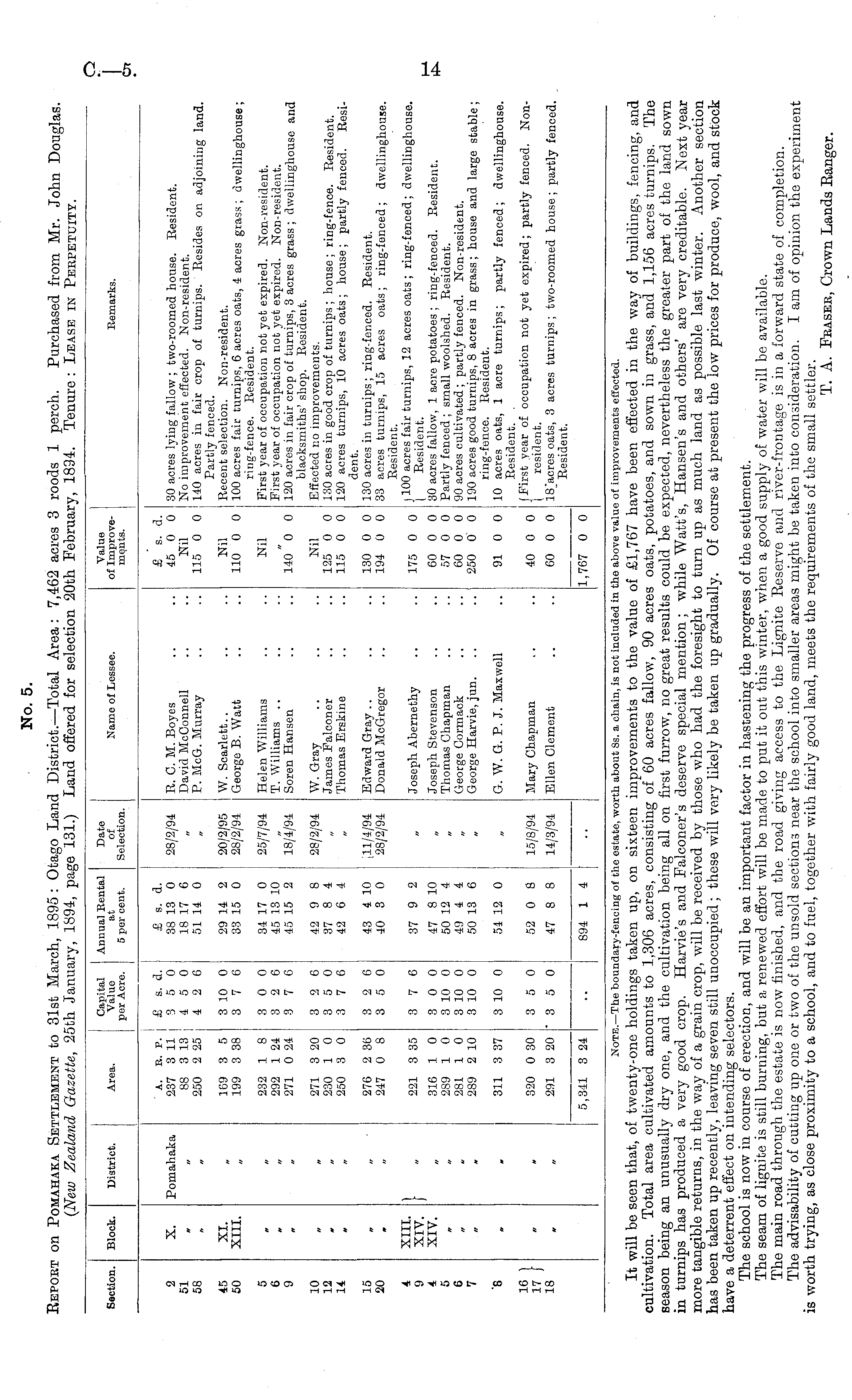 No. 5. Report on Pomahaka Settlement to 31st March, 1895: Otago Land District.— Total Area: 7,462 acres 3 roods 1 perch. Purchased from Mr. John Douglas. (New Zealand Gazette, 25th January, 1894, page 131.) Land offered for selection 20th February, 1894. Tenure: Lease in Perpetuity.