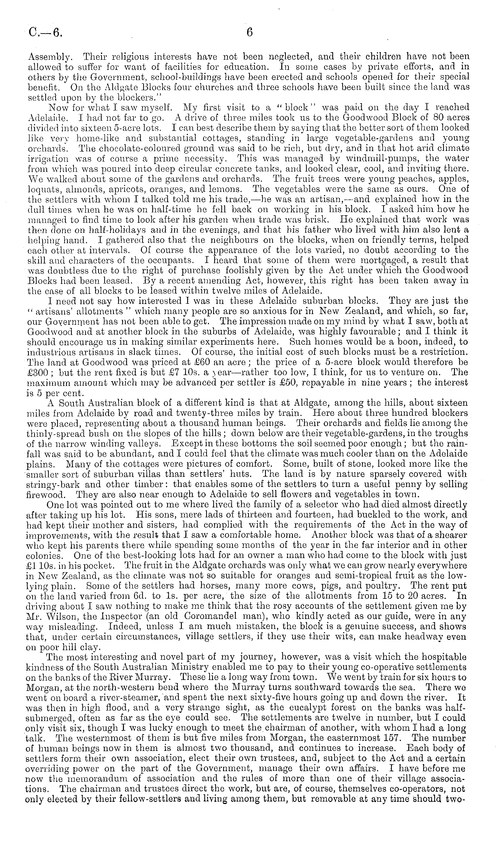Assembly. Their religious interests have not been neglected, and their children have not been allowed to suffer for want of facilities for education. In some cases by private efforts, and in others by the Government, school-buildings have been erected and schools opened for their special benefit. On the Aldgate Blocks four churches and three schools have been built since the land was settled upon by the blockers." Now for what I saw myself. My first visit to a "block" was paid on the day I reached Adelaide. I had not far to go. A drive of three miles took us to the Goodwood Block of 80 acres divided into sixteen 5-acre lots. I can best describe them by saying that the better sort of them looked like very home-like and substantial cottages, standing in large vegetable-gardens and young orchards. The chocolate-coloured ground was said to be rich, but dry, and in that hot arid climate irrigation was of course a prime necessity. This was managed by windmill-pumps, the water from which was poured into deep circular concrete tanks, and looked clear, cool, and inviting there. We walked about some of the gardens and orchards. The fruit trees were young peaches, apples, loquats, almonds, apricots, oranges, and lemons. The vegetables were the same as ours. One of the settlers with whom I talked told me his trade, —he was an artisan, —and explained how in the dull times when he was on half-time he fell back on working in his block. I asked him how he managed to find time to look after his garden when trade was brisk. He explained that work was then done on half-holidays and in the evenings, and that his father who lived with him also lent a helping hand. I gathered also that the neighbours on the blocks, when on friendly terms, helped each other at intervals. Of course the appearance of the lots varied, no doubt according to the skill and characters of the occupants. I heard that some of them were mortgaged, a result that was doubtless due to the right of purchase foolishly given by the Act under which the Goodwood Blocks had been leased. By a recent amending Act, however, this right has been taken away in the case of all blocks to be leased within twelve miles of Adelaide. I need not say how interested I was in these Adelaide suburban blocks. They are just the " artisans' allotments " which many people are so anxious for in New Zealand, and which, so far, our Goyermnent has not been able to get. The impression made on my mind by what I saw, both at Goodwood and at another block in the suburbs of Adelaide, was highly favourable; and I think it should encourage us in making similar experiments here. Such homes would be a boon, indeed, to industrious artisans in slack times. Of course, the initial cost of such blocks must be a restriction. The land at Goodwood was priced at £60 an acre ; the price of a 5-acre block would therefore be £300 ; but the rent fixed is but £7 10s. a }ear —rather too low, I think, for us to venture on. The maximum amount which may be advanced per settler is £50, repayable in nine years ; the interest is 5 per cent. A South Australian block of a different kind is that at Aldgate, among the hills, about sixteen miles from Adelaide by road and twenty-three miles by train. Here about three hundred blockers were placed, representing about a thousand human beings. Their orchards and fields lie among the thinly-spread bush on the slopes of the hills; down below are their vegetable-gardens, in the troughs of the narrow winding valleys. Except in these bottoms the soil seemed poor enough; but the rainfall was said to be abundant, and I could feel that the climate was much cooler than on the Adelaide plains. Many of the cottages were pictures of comfort. Some, built of stone, looked more like the smaller sort of suburban villas than settlers' huts. The land is by nature sparsely covered with stringy-bark and other timber: that enables some of the settlers to turn a useful penny by selling firewood. They are also near enough to Adelaide to sell flowers and vegetables in town. One lot was pointed out to me where lived the family of a selector who had died almost directly after taking up his lot. His sons, mere lads of thirteen and fourteen, had buckled to the work, and had kept their mother and sisters, had complied with the requirements of the Act in the way of improvements, with the result that I saw a comfortable home. Another block was that of a shearer who kept his parents there while spending some months of the year in the far interior and in other colonies. One of the best-looking lots had for an owner a man who had come to the block with just £1 10s. in his pocket. The fruit in the Aldgate orchards was only what we can grow nearly everywhere in New Zealand, as the climate was not so suitable for oranges and semi-tropical fruit as the lowlying plain. Some of the settlers had horses, many more cows, pigs, and poultry. The rent put on the land varied from 6d. to ls. per acre, the size of the allotments from 15 to 20 acres. In driving about I saw nothing to make me think that the rosy accounts of the settlement given me by Mr. Wilson, the Inspector (an old Coromandel man), who kindly acted as our guide, were in any way misleading. Indeed, unless I am much mistaken, the block is a genuine success, and shows that, under certain circumstances, village settlers, if they use their wits, can make headway even on poor hill clay. The most interesting and novel part of my journey, however, was a visit which the hospitable kindness of the South Australian Ministry enabled me to pay to their young co-operative settlements on the banks of the Eiver Murray. These lie a long way from town. We went by train for six hours to Morgan, at the north-western bend where the Murray turns southward towards the sea. There we went onboard a river-steamer, and spent the next sixty-five hours going up and down the river. It was then in high flood, and a very strange sight, as the eucalypt forest on 