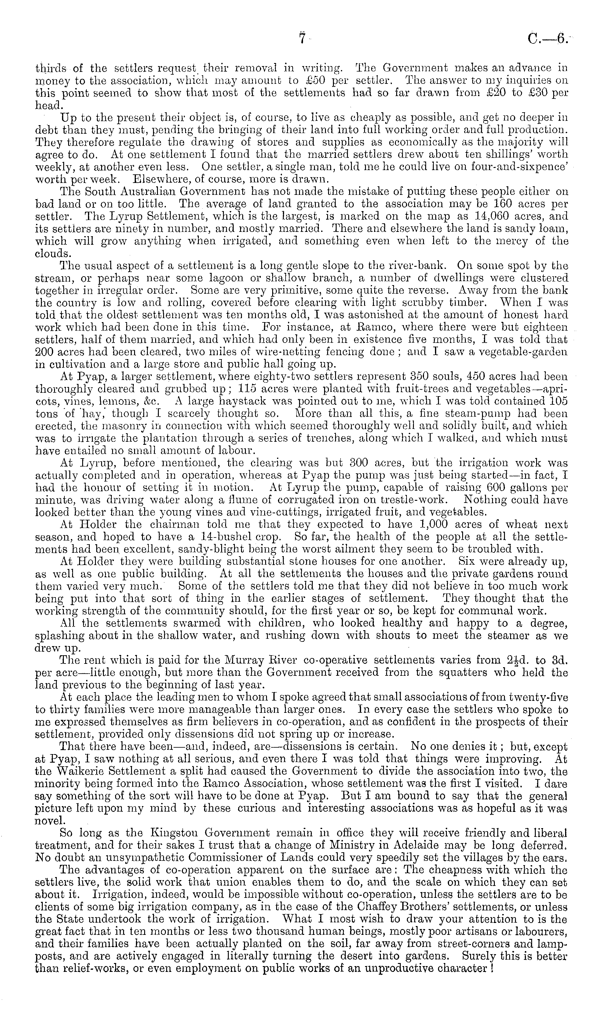 thirds of the settlers request their removal in writing. The Government makes an advance in money to the association, which may amount to £50 per settler. The answer to my inquiries on this point seemed to show that most of the settlements had so far drawn from £20 to £30 per head. Up to the present their object is, of course, to live as cheaply as possible, and get no deeper in debt than they must, pending the bringing of their land into full working order and full production. They therefore regulate the drawing of stores and supplies as economically as the majority will agree to do. At one settlement I found that the married settlers drew about ten shillings' worth weekly, at another even less. One settler, a single man, told me he could live on four-and-sixpence' worth per week. Elsewhere, of course, more is drawn. The South Australian Government has not made the mistake of putting these people either on bad land or on too little. The average of land granted to the association may be 160 acres per settler. The Lyrup Settlement, which is the largest, is marked on the map as 14,060 acres, and its settlers are ninety in number, and mostly married. There and elsewhere the land is sandy loam, which will grow anything when irrigated, and something even when left to the mercy of the clouds. The usual aspect of a settlement is a long gentle slope to the river-bank. On some spot by the stream, or perhaps near some lagoon or shallow branch, a number of dwellings were clustered together iv irregular order. Some are very primitive, some quite the reverse. Away from the bank the country is low and rolling, covered before clearing with light scrubby timber. When I was told that the oldest settlement was ten months old, I was astonished at the amount of honest hard work which had been done in this time. For instance, at Eamco, where there were but eighteen settlers, half of them married, and which had only been in existence five months, I was told that 200 acres had been cleared, two miles of wire-netting fencing done ; and I saw a vegetable-garden in cultivation and a large store and public hall going up. At Pyap, a larger settlement, where eighty-two settlers represent 350 souls, 450 acres had been thoroughly cleared and grubbed up; 115 acres were planted with fruit-trees and vegetables—apricots, vines, lemons, &c. A large haystack was pointed out to me, which I was told contained 105 tons of hay,' though I scarcely thought so. More than all this, a fine steam-pump had been erected, the masonry in connection with which seemed thoroughly well and solidly built, and which was to irrigate the plantation through a series of trenches, along which I walked, and which must have entailed no small amount of labour. At Lyrup, before mentioned, the clearing was but 300 acres, but the irrigation work was actually completed and in operation, whereas at Pyap the pump was just being started—in fact, I had the honour of setting it in motion. At Lyrup the pump, capable of raising 600 gallons per minute, was driving water along a flume of corrugated iron on trestle-work. Nothing could have looked better than the young vines and vine-cuttings, irrigated fruit, and vegetables. At Holder the chairman told me that they expected to have 1,000 acres of wheat next season, and hoped to have a 14-bushel crop. So far, the health of the people at all the settlements had been, excellent, sandy-blight being the worst ailment they seem to be troubled with. At Holder they were building substantial stone houses for one another. Six were already up, as well as one public building. At all the settlements the houses and the private gardens round them, varied very much. Some of the settlers told me that they did not believe in too much work being put into that sort of thing in the earlier stages of settlement. They thought that the working strength of the community should, for the first year or so, be kept for communal work. All the settlements swarmed with children, who looked healthy and happy to a degree, splashing about in the shallow water, and rushing down with shouts to meet the steamer as we drew up. The rent which is paid for the Murray Eiver co-operative settlements varies from 2Jd. to 3d. per acre —little enough, but more than the Government received from the squatters who held the land previous to the beginning of last year. At each place the leading men to whom I spoke agreed that small associations of from twenty-five to thirty families were more manageable than larger ones. In every case the settlers who spoke to me expressed themselves as firm believers in co-operation, and as confident in the prospects of their settlement, provided only dissensions did not spring up or increase. That there have been—and, indeed, are —dissensions is certain. No one denies it; but, except at Pyap, I saw nothing at all serious, and even there I was told that things were improving. At the Waikerie Settlement a split had caused the Government to divide the association into two, the minority being formed into the Eamco Association, whose settlement was the first I visited. I dare say something of the sort will have to be done at Pyap. But lam bound to say that the general picture left upon my mind by these curious and interesting associations was as hopeful as it was novel. So long as the Kingston Government remain in office they will receive friendly and liberal treatment, and for their sakes I trust that a change of Ministry in Adelaide may be long deferred. No doubt an unsympathetic Commissioner of Lands could very speedily set the villages by the ears. The advantages of co-operation apparent on the surface are: The cheapness with which the settlers live, the solid work that union enables them to do, and the scale on which they can set about it. Irrigation, indeed, would be impossible without co-operation, unless the settlers are to be clients of some big irrigation company, as in the case of the Chaffey Brothers' settlement