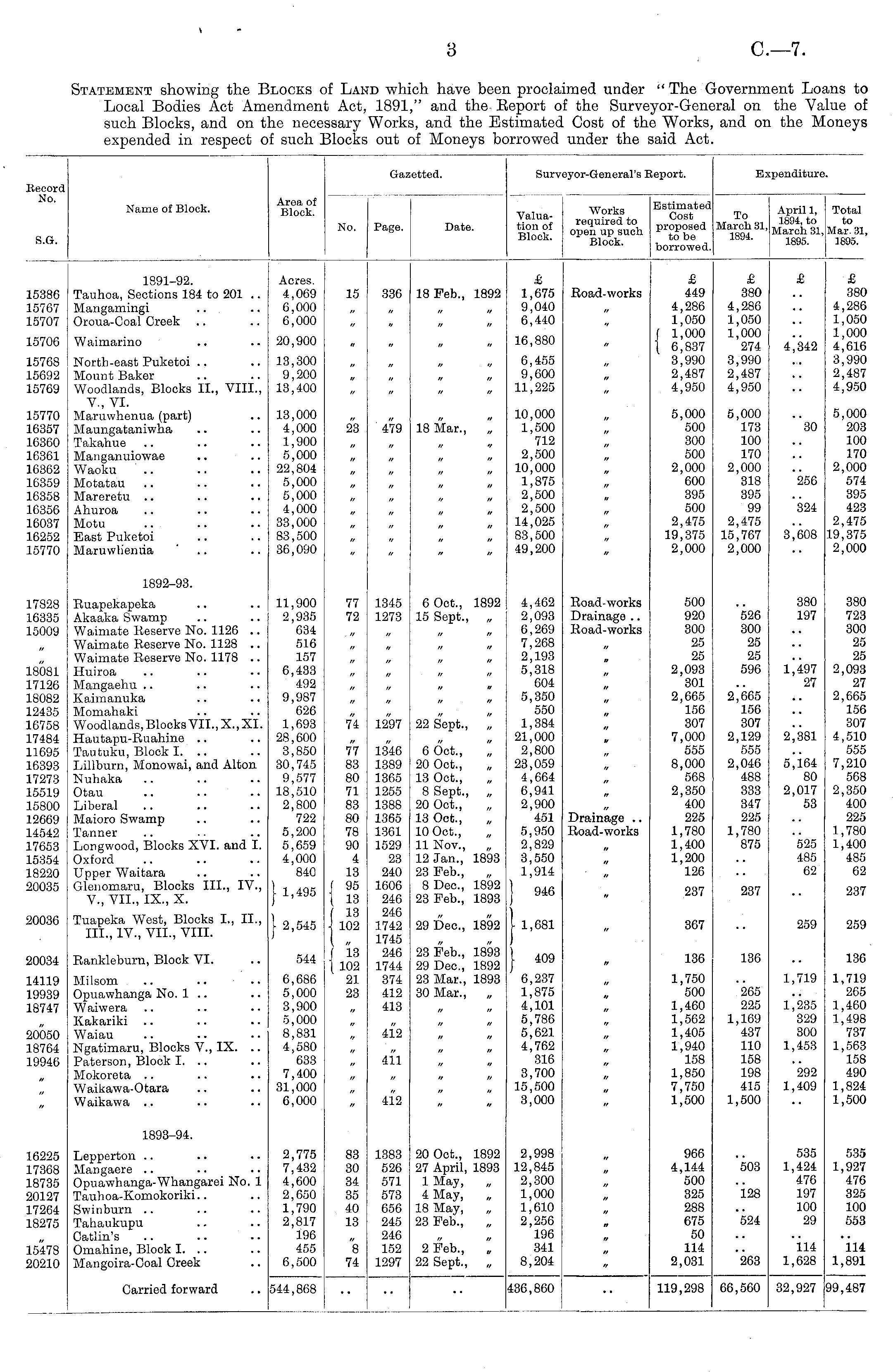 Statement showing the Blocks of Land which have been proclaimed under "The Government Loans to Local Bodies Act Amendment Act, 1891," and the Report of the Surveyor-General on the Value of such Blocks, and on the necessary Works, and the Estimated Cost of the Works, and on the Moneys expended in respect of such Blocks out of Moneys borrowed under the said Act.