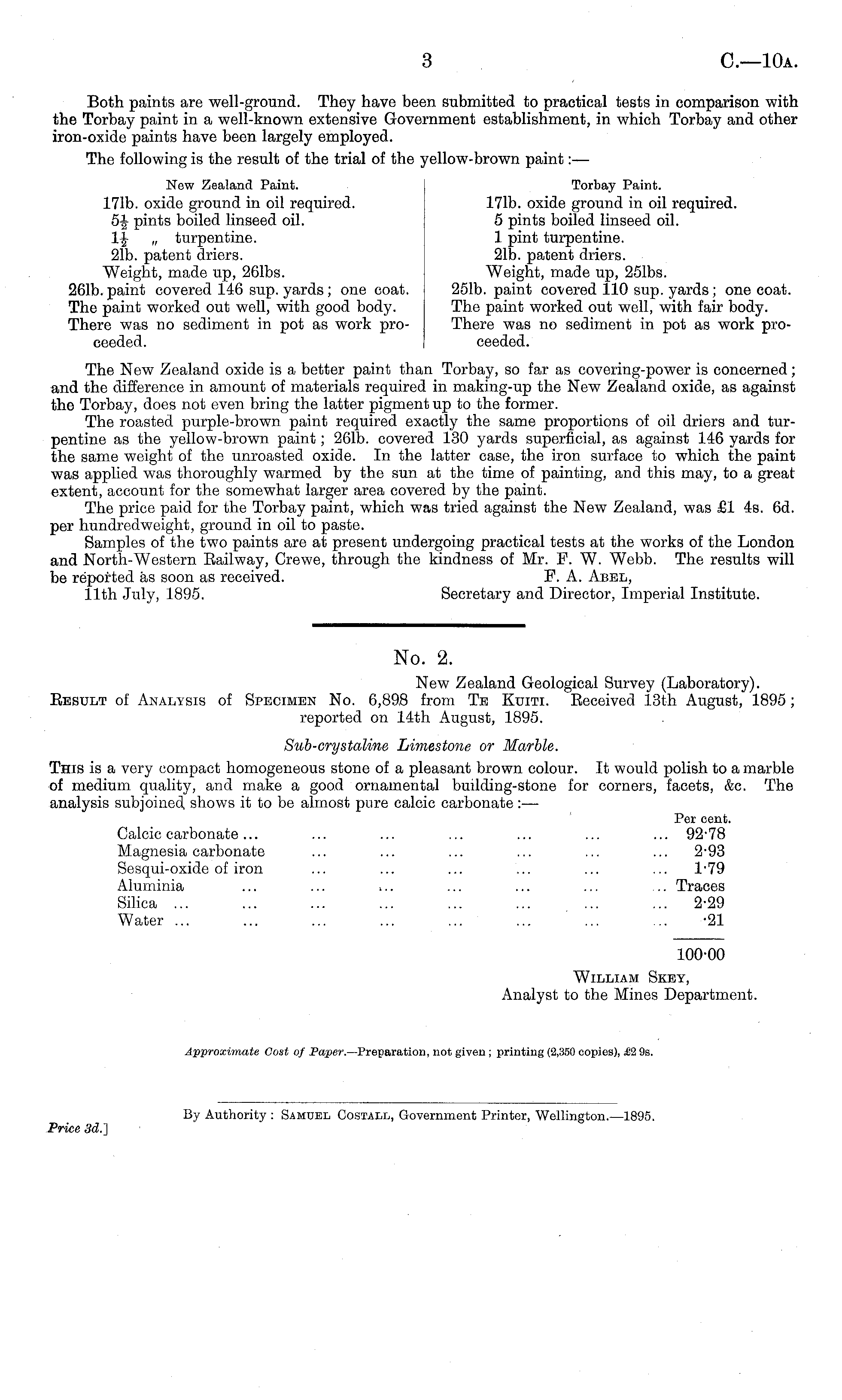 Both paints are well-ground. They have been submitted to practical tests in comparison with the Torbay paint in a well-known extensive Government establishment, in which Torbay and other iron-oxide paints have been largely employed. The following is the result of the trial of the yellow-brown paint:— New Zealand Paint. Torbay Paint. 171b. oxide ground in oil required. 171b. oxide ground in oil required. pints boiled linseed oil. 5 pints boiled linseed oil. 1-| „ turpentine. 1 pint turpentine. 21b. patent driers. 21b. patent driers. Weight, made up, 261bs. Weight, made up, 251bs. 261b. paint covered 146 sup. yards; one coat. 251b. paint covered 110 sup. yards; one coat. The paint worked out well, with good body. The paint worked out well, with fair body. There was no sediment in pot as work pro- There was no sediment in pot as work proceeded, ceeded. The New Zealand oxide is a better paint than Torbay, so far as covering-power is concerned; and the difference in amount of materials required in making-up the New Zealand oxide, as against the Torbay, does not even bring the latter pigment up to the former. The roasted purple-brown paint required exactly the same proportions of oil driers and turpentine as the yellow-brown paint; 261b. covered 130 yards superficial, as against 146 yards for the same weight of the unroasted oxide. In the latter case, the iron surface to which the paint was applied was thoroughly warmed by the sun at the time of painting, and this may, to a great extent, account for the somewhat larger area covered by the paint. The price paid for the Torbay paint, which was tried against the New Zealand, was £1 4s. 6d. per hundredweight, ground in oil to paste. Samples of the two paints are at present undergoing practical tests at the works of the London and North-Western Eailway, Crewe, through the kindness of Mr. P. W. Webb. The results will be reported as soon as received. P. A. Abel, 11th July, 1895. Secretary and Director, Imperial Institute.