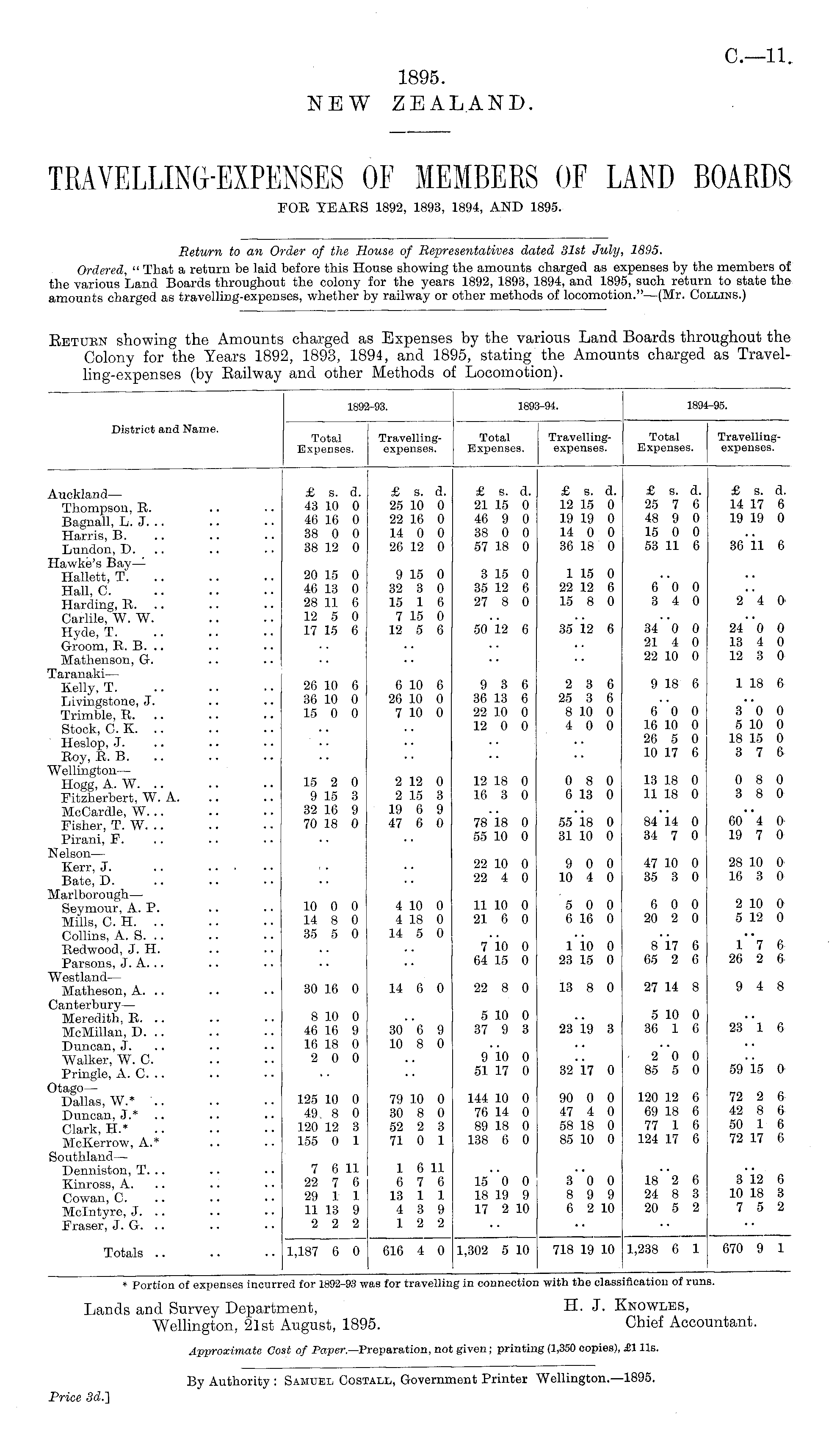 Return to an Order of the House of Representatives dated 31st July, 1895. Ordered, " That a return be laid before this House showing the amounts charged as expenses by the members of the various Land Boards throughout the colony for the years 1892, 1893, 1894, and 1895, such return to state the amounts charged as travelling-expenses, whether by railway or other methods of locomotion."—(Mr. Collins.)