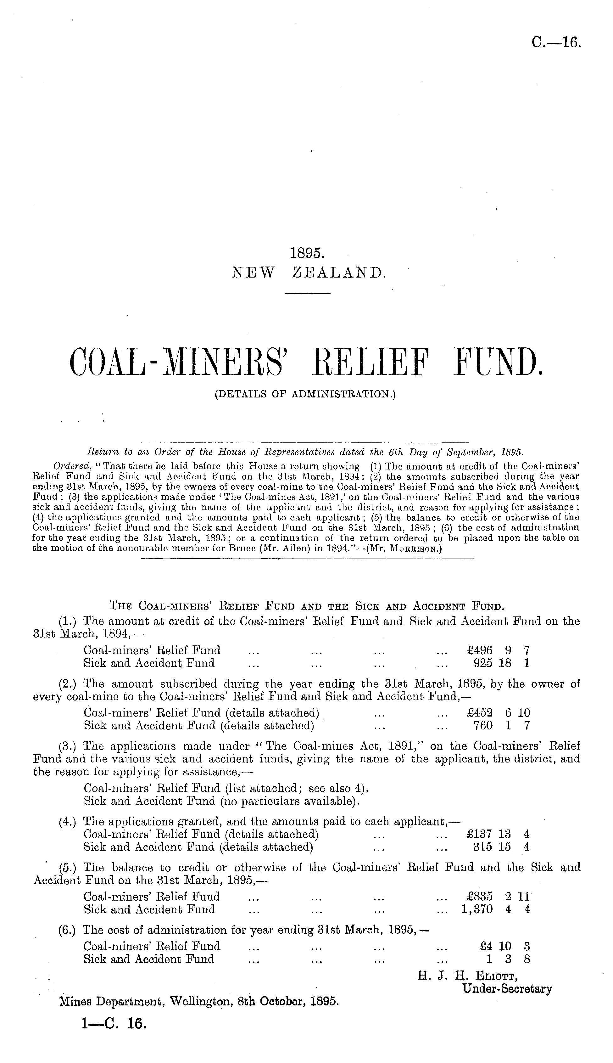 The Coal-minees' Relief Fund and the Sick and Accident Fund. (1.) The amount at credit of the Coal-miners' Relief Fund and Sick and Accident Fund on the 31st March, 1894,— Coal-miners'Relief Fund ... ... ... ... £496 9 7 Sick and Accident Fund ... ... ... ... 925 18 1 (2.) The amount subscribed during the year ending the 31st March, 1895, by the owner of every coal-mine to the Coal-miners' Relief Fund and Sick and Accident Fund, — Coal-miners' Relief Fund (details attached) ... ... £452 6 10 Sick and Accident Fund (details attached) ... ... 760 1 7 (3.) The applications made under " The Coal-mines Act, 1891," on the Coal-miners' Relief Fund and the various sick and accident funds, giving the name of the applicant, the district, and the reason for applying for assistance, — Coal-miners' Relief Fund (list attached; see also 4). Sick and Accident Fund (no particulars available). (4.) The applications granted, and the amounts paid to each applicant,— Coal-miners' Relief Fund (details attached) ... ... £137 13 4 Sick and Accident Fund (details attached) ... ... 315 15 4 (5.) The balance to credit or otherwise of the Coal-miners' Relief Fund and the Sick and Accident Fund on the 31st March, 1895,— Coal-miners'Relief Fund ... ... ... ... £835 2 11 Sick and Accident Fund ... ... ... ... 1,370 4 4 (6.) The cost of administration for year ending 31st March, 1895, — Coal-miners'Relief Fund ... ... ... ... £4 10 3 Sick and Accident Fund ... ... ... ... 138 H. J. H. Eliott, Under-Secretary Mines Department, Wellington, 8th October, 1895. 1—C. 16.